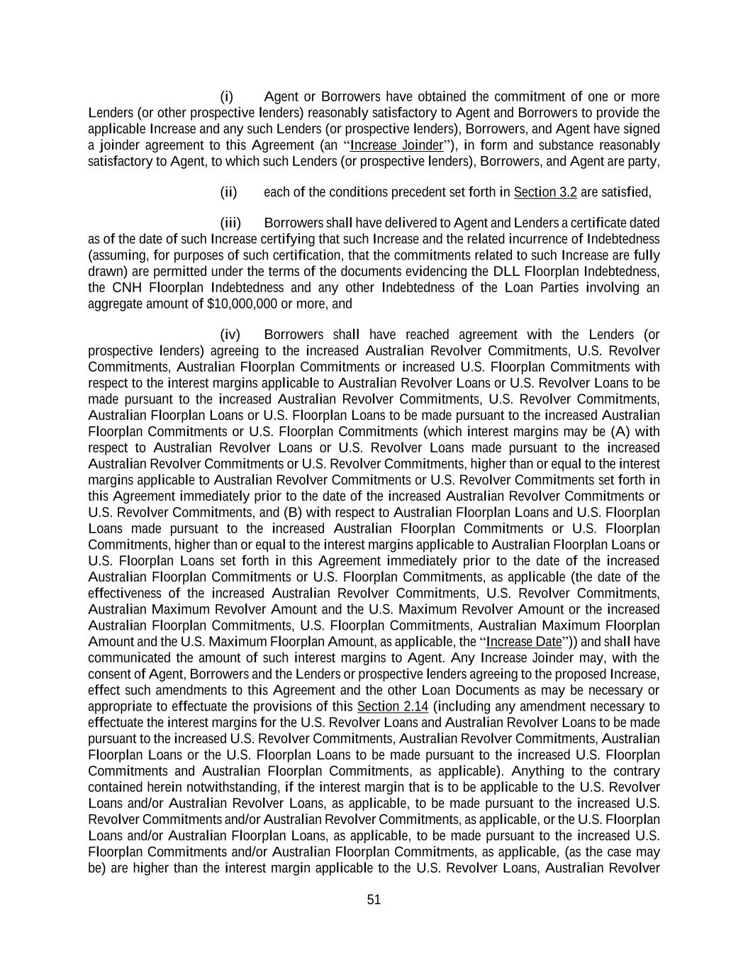 51 (i) Agent or Borrowers have obtained the commitment of one or more Lenders (or other prospective lenders) reasonably satisfactory to Agent and Borrowers to provide the applicable Increase and any such Lenders (or prospective lenders), Borrowers, and Agent have signed a joinder agreement to this Agreement (an “Increase Joinder”), in form and substance reasonably satisfactory to Agent, to which such Lenders (or prospective lenders), Borrowers, and Agent are party, (ii) each of the conditions precedent set forth in Section 3.2 are satisfied, (iii) Borrowers shall have delivered to Agent and Lenders a certificate dated as of the date of such Increase certifying that such Increase and the related incurrence of Indebtedness (assuming, for purposes of such certification, that the commitments related to such Increase are fully drawn) are permitted under the terms of the documents evidencing the DLL Floorplan Indebtedness, the CNH Floorplan Indebtedness and any other Indebtedness of the Loan Parties involving an aggregate amount of $10,000,000 or more, and (iv) Borrowers shall have reached agreement with the Lenders (or prospective lenders) agreeing to the increased Australian Revolver Commitments, U.S. Revolver Commitments, Australian Floorplan Commitments or increased U.S. Floorplan Commitments with respect to the interest margins applicable to Australian Revolver Loans or U.S. Revolver Loans to be made pursuant to the increased Australian Revolver Commitments, U.S. Revolver Commitments, Australian Floorplan Loans or U.S. Floorplan Loans to be made pursuant to the increased Australian Floorplan Commitments or U.S. Floorplan Commitments (which interest margins may be (A) with respect to Australian Revolver Loans or U.S. Revolver Loans made pursuant to the increased Australian Revolver Commitments or U.S. Revolver Commitments, higher than or equal to the interest margins applicable to Australian Revolver Commitments or U.S. Revolver Commitments set forth in this Agreement immediately prior to the date of the increased Australian Revolver Commitments or U.S. Revolver Commitments, and (B) with respect to Australian Floorplan Loans and U.S. Floorplan Loans made pursuant to the increased Australian Floorplan Commitments or U.S. Floorplan Commitments, higher than or equal to the interest margins applicable to Australian Floorplan Loans or U.S. Floorplan Loans set forth in this Agreement immediately prior to the date of the increased Australian Floorplan Commitments or U.S. Floorplan Commitments, as applicable (the date of the effectiveness of the increased Australian Revolver Commitments, U.S. Revolver Commitments, Australian Maximum Revolver Amount and the U.S. Maximum Revolver Amount or the increased Australian Floorplan Commitments, U.S. Floorplan Commitments, Australian Maximum Floorplan Amount and the U.S. Maximum Floorplan Amount, as applicable, the “Increase Date”)) and shall have communicated the amount of such interest margins to Agent. Any Increase Joinder may, with the consent of Agent, Borrowers and the Lenders or prospective lenders agreeing to the proposed Increase, effect such amendments to this Agreement and the other Loan Documents as may be necessary or appropriate to effectuate the provisions of this Section 2.14 (including any amendment necessary to effectuate the interest margins for the U.S. Revolver Loans and Australian Revolver Loans to be made pursuant to the increased U.S. Revolver Commitments, Australian Revolver Commitments, Australian Floorplan Loans or the U.S. Floorplan Loans to be made pursuant to the increased U.S. Floorplan Commitments and Australian Floorplan Commitments, as applicable). Anything to the contrary contained herein notwithstanding, if the interest margin that is to be applicable to the U.S. Revolver Loans and/or Australian Revolver Loans, as applicable, to be made pursuant to the increased U.S. Revolver Commitments and/or Australian Revolver Commitments, as applicable, or the U.S. Floorplan Loans and/or Australian Floorplan Loans, as applicable, to be made pursuant to the increased U.S. Floorplan Commitments and/or Australian Floorplan Commitments, as applicable, (as the case may be) are higher than the interest margin applicable to the U.S. Revolver Loans, Australian Revolver