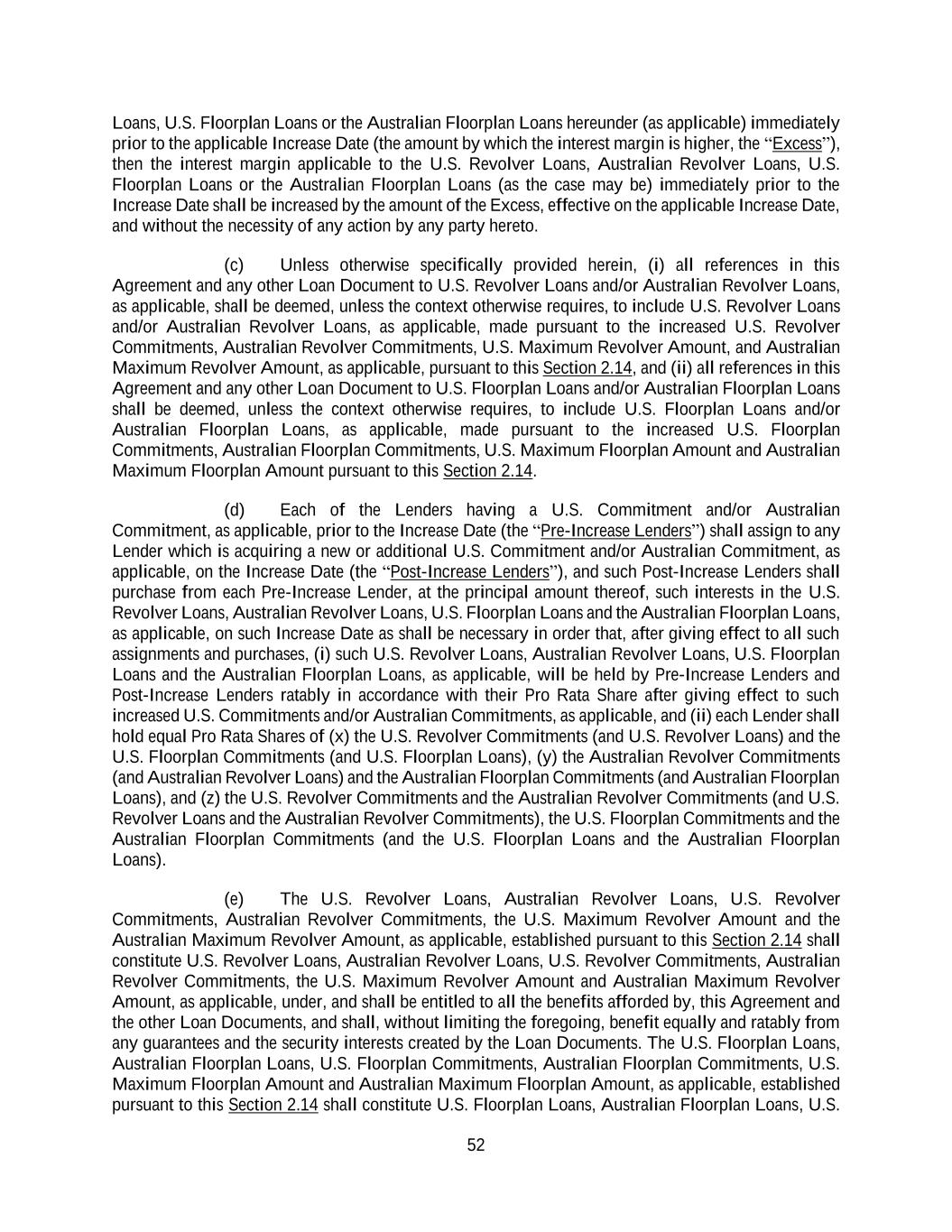 52 Loans, U.S. Floorplan Loans or the Australian Floorplan Loans hereunder (as applicable) immediately prior to the applicable Increase Date (the amount by which the interest margin is higher, the “Excess”), then the interest margin applicable to the U.S. Revolver Loans, Australian Revolver Loans, U.S. Floorplan Loans or the Australian Floorplan Loans (as the case may be) immediately prior to the Increase Date shall be increased by the amount of the Excess, effective on the applicable Increase Date, and without the necessity of any action by any party hereto. (c) Unless otherwise specifically provided herein, (i) all references in this Agreement and any other Loan Document to U.S. Revolver Loans and/or Australian Revolver Loans, as applicable, shall be deemed, unless the context otherwise requires, to include U.S. Revolver Loans and/or Australian Revolver Loans, as applicable, made pursuant to the increased U.S. Revolver Commitments, Australian Revolver Commitments, U.S. Maximum Revolver Amount, and Australian Maximum Revolver Amount, as applicable, pursuant to this Section 2.14, and (ii) all references in this Agreement and any other Loan Document to U.S. Floorplan Loans and/or Australian Floorplan Loans shall be deemed, unless the context otherwise requires, to include U.S. Floorplan Loans and/or Australian Floorplan Loans, as applicable, made pursuant to the increased U.S. Floorplan Commitments, Australian Floorplan Commitments, U.S. Maximum Floorplan Amount and Australian Maximum Floorplan Amount pursuant to this Section 2.14. (d) Each of the Lenders having a U.S. Commitment and/or Australian Commitment, as applicable, prior to the Increase Date (the “Pre-Increase Lenders”) shall assign to any Lender which is acquiring a new or additional U.S. Commitment and/or Australian Commitment, as applicable, on the Increase Date (the “Post-Increase Lenders”), and such Post-Increase Lenders shall purchase from each Pre-Increase Lender, at the principal amount thereof, such interests in the U.S. Revolver Loans, Australian Revolver Loans, U.S. Floorplan Loans and the Australian Floorplan Loans, as applicable, on such Increase Date as shall be necessary in order that, after giving effect to all such assignments and purchases, (i) such U.S. Revolver Loans, Australian Revolver Loans, U.S. Floorplan Loans and the Australian Floorplan Loans, as applicable, will be held by Pre-Increase Lenders and Post-Increase Lenders ratably in accordance with their Pro Rata Share after giving effect to such increased U.S. Commitments and/or Australian Commitments, as applicable, and (ii) each Lender shall hold equal Pro Rata Shares of (x) the U.S. Revolver Commitments (and U.S. Revolver Loans) and the U.S. Floorplan Commitments (and U.S. Floorplan Loans), (y) the Australian Revolver Commitments (and Australian Revolver Loans) and the Australian Floorplan Commitments (and Australian Floorplan Loans), and (z) the U.S. Revolver Commitments and the Australian Revolver Commitments (and U.S. Revolver Loans and the Australian Revolver Commitments), the U.S. Floorplan Commitments and the Australian Floorplan Commitments (and the U.S. Floorplan Loans and the Australian Floorplan Loans). (e) The U.S. Revolver Loans, Australian Revolver Loans, U.S. Revolver Commitments, Australian Revolver Commitments, the U.S. Maximum Revolver Amount and the Australian Maximum Revolver Amount, as applicable, established pursuant to this Section 2.14 shall constitute U.S. Revolver Loans, Australian Revolver Loans, U.S. Revolver Commitments, Australian Revolver Commitments, the U.S. Maximum Revolver Amount and Australian Maximum Revolver Amount, as applicable, under, and shall be entitled to all the benefits afforded by, this Agreement and the other Loan Documents, and shall, without limiting the foregoing, benefit equally and ratably from any guarantees and the security interests created by the Loan Documents. The U.S. Floorplan Loans, Australian Floorplan Loans, U.S. Floorplan Commitments, Australian Floorplan Commitments, U.S. Maximum Floorplan Amount and Australian Maximum Floorplan Amount, as applicable, established pursuant to this Section 2.14 shall constitute U.S. Floorplan Loans, Australian Floorplan Loans, U.S.
