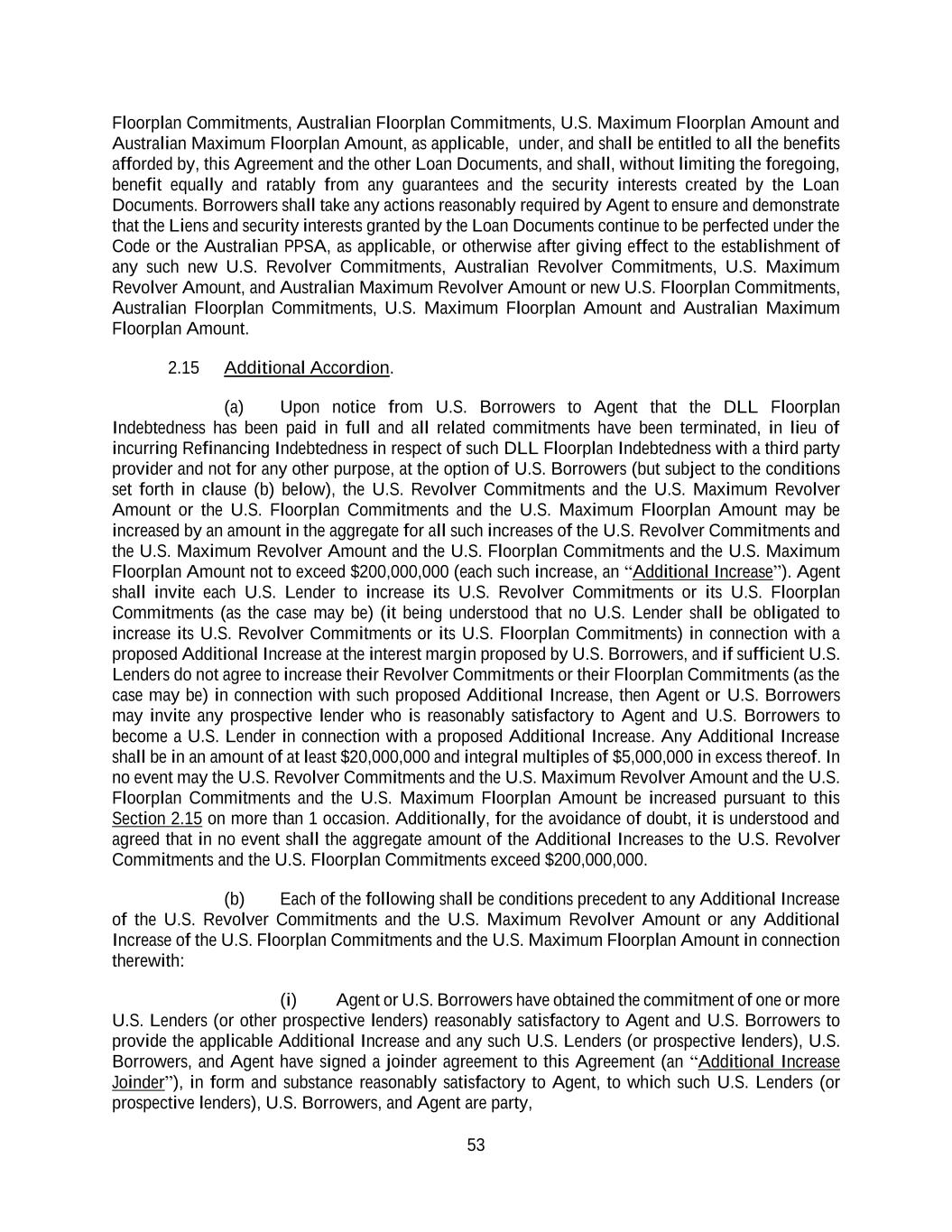53 Floorplan Commitments, Australian Floorplan Commitments, U.S. Maximum Floorplan Amount and Australian Maximum Floorplan Amount, as applicable, under, and shall be entitled to all the benefits afforded by, this Agreement and the other Loan Documents, and shall, without limiting the foregoing, benefit equally and ratably from any guarantees and the security interests created by the Loan Documents. Borrowers shall take any actions reasonably required by Agent to ensure and demonstrate that the Liens and security interests granted by the Loan Documents continue to be perfected under the Code or the Australian PPSA, as applicable, or otherwise after giving effect to the establishment of any such new U.S. Revolver Commitments, Australian Revolver Commitments, U.S. Maximum Revolver Amount, and Australian Maximum Revolver Amount or new U.S. Floorplan Commitments, Australian Floorplan Commitments, U.S. Maximum Floorplan Amount and Australian Maximum Floorplan Amount. 2.15 Additional Accordion. (a) Upon notice from U.S. Borrowers to Agent that the DLL Floorplan Indebtedness has been paid in full and all related commitments have been terminated, in lieu of incurring Refinancing Indebtedness in respect of such DLL Floorplan Indebtedness with a third party provider and not for any other purpose, at the option of U.S. Borrowers (but subject to the conditions set forth in clause (b) below), the U.S. Revolver Commitments and the U.S. Maximum Revolver Amount or the U.S. Floorplan Commitments and the U.S. Maximum Floorplan Amount may be increased by an amount in the aggregate for all such increases of the U.S. Revolver Commitments and the U.S. Maximum Revolver Amount and the U.S. Floorplan Commitments and the U.S. Maximum Floorplan Amount not to exceed $200,000,000 (each such increase, an “Additional Increase”). Agent shall invite each U.S. Lender to increase its U.S. Revolver Commitments or its U.S. Floorplan Commitments (as the case may be) (it being understood that no U.S. Lender shall be obligated to increase its U.S. Revolver Commitments or its U.S. Floorplan Commitments) in connection with a proposed Additional Increase at the interest margin proposed by U.S. Borrowers, and if sufficient U.S. Lenders do not agree to increase their Revolver Commitments or their Floorplan Commitments (as the case may be) in connection with such proposed Additional Increase, then Agent or U.S. Borrowers may invite any prospective lender who is reasonably satisfactory to Agent and U.S. Borrowers to become a U.S. Lender in connection with a proposed Additional Increase. Any Additional Increase shall be in an amount of at least $20,000,000 and integral multiples of $5,000,000 in excess thereof. In no event may the U.S. Revolver Commitments and the U.S. Maximum Revolver Amount and the U.S. Floorplan Commitments and the U.S. Maximum Floorplan Amount be increased pursuant to this Section 2.15 on more than 1 occasion. Additionally, for the avoidance of doubt, it is understood and agreed that in no event shall the aggregate amount of the Additional Increases to the U.S. Revolver Commitments and the U.S. Floorplan Commitments exceed $200,000,000. (b) Each of the following shall be conditions precedent to any Additional Increase of the U.S. Revolver Commitments and the U.S. Maximum Revolver Amount or any Additional Increase of the U.S. Floorplan Commitments and the U.S. Maximum Floorplan Amount in connection therewith: (i) Agent or U.S. Borrowers have obtained the commitment of one or more U.S. Lenders (or other prospective lenders) reasonably satisfactory to Agent and U.S. Borrowers to provide the applicable Additional Increase and any such U.S. Lenders (or prospective lenders), U.S. Borrowers, and Agent have signed a joinder agreement to this Agreement (an “Additional Increase Joinder”), in form and substance reasonably satisfactory to Agent, to which such U.S. Lenders (or prospective lenders), U.S. Borrowers, and Agent are party,