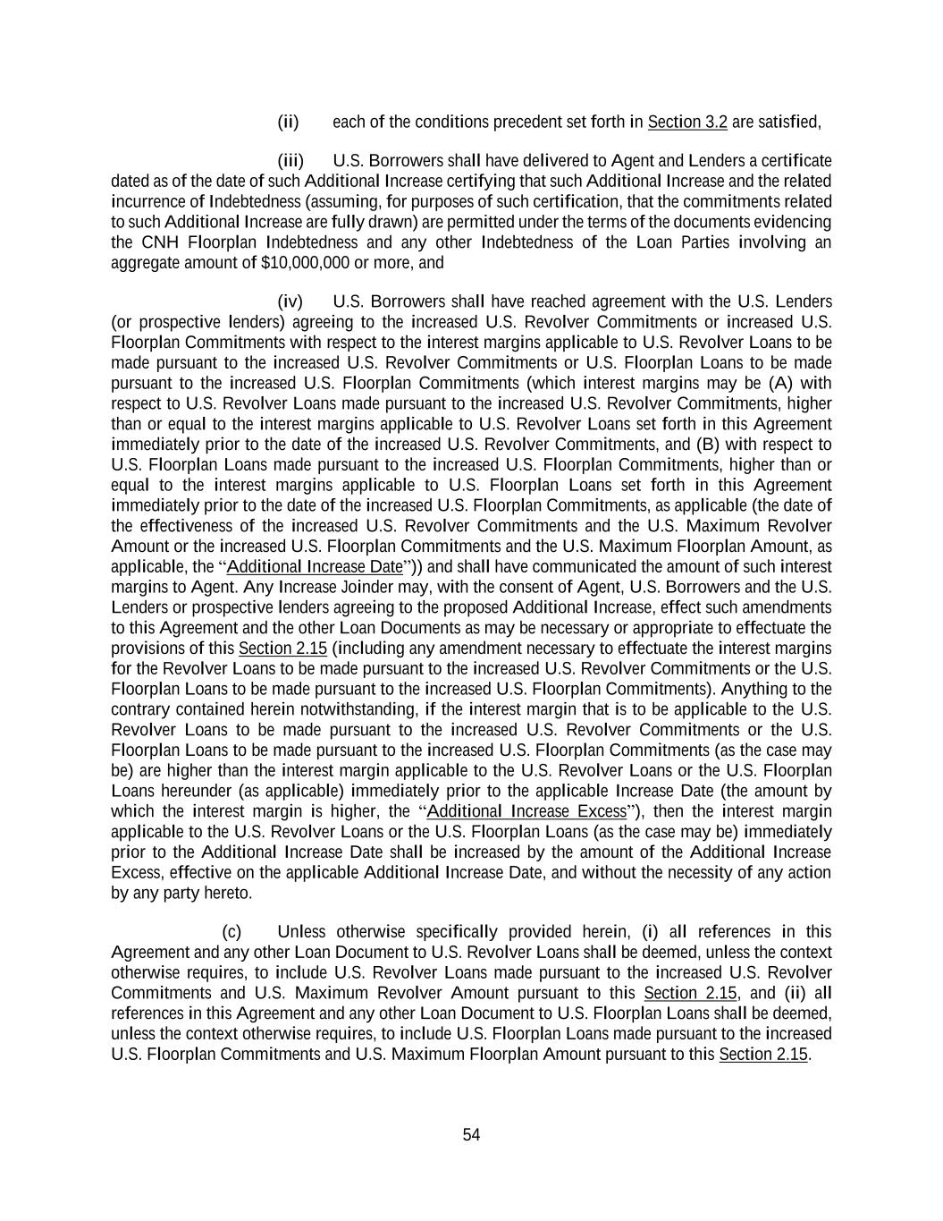 54 (ii) each of the conditions precedent set forth in Section 3.2 are satisfied, (iii) U.S. Borrowers shall have delivered to Agent and Lenders a certificate dated as of the date of such Additional Increase certifying that such Additional Increase and the related incurrence of Indebtedness (assuming, for purposes of such certification, that the commitments related to such Additional Increase are fully drawn) are permitted under the terms of the documents evidencing the CNH Floorplan Indebtedness and any other Indebtedness of the Loan Parties involving an aggregate amount of $10,000,000 or more, and (iv) U.S. Borrowers shall have reached agreement with the U.S. Lenders (or prospective lenders) agreeing to the increased U.S. Revolver Commitments or increased U.S. Floorplan Commitments with respect to the interest margins applicable to U.S. Revolver Loans to be made pursuant to the increased U.S. Revolver Commitments or U.S. Floorplan Loans to be made pursuant to the increased U.S. Floorplan Commitments (which interest margins may be (A) with respect to U.S. Revolver Loans made pursuant to the increased U.S. Revolver Commitments, higher than or equal to the interest margins applicable to U.S. Revolver Loans set forth in this Agreement immediately prior to the date of the increased U.S. Revolver Commitments, and (B) with respect to U.S. Floorplan Loans made pursuant to the increased U.S. Floorplan Commitments, higher than or equal to the interest margins applicable to U.S. Floorplan Loans set forth in this Agreement immediately prior to the date of the increased U.S. Floorplan Commitments, as applicable (the date of the effectiveness of the increased U.S. Revolver Commitments and the U.S. Maximum Revolver Amount or the increased U.S. Floorplan Commitments and the U.S. Maximum Floorplan Amount, as applicable, the “Additional Increase Date”)) and shall have communicated the amount of such interest margins to Agent. Any Increase Joinder may, with the consent of Agent, U.S. Borrowers and the U.S. Lenders or prospective lenders agreeing to the proposed Additional Increase, effect such amendments to this Agreement and the other Loan Documents as may be necessary or appropriate to effectuate the provisions of this Section 2.15 (including any amendment necessary to effectuate the interest margins for the Revolver Loans to be made pursuant to the increased U.S. Revolver Commitments or the U.S. Floorplan Loans to be made pursuant to the increased U.S. Floorplan Commitments). Anything to the contrary contained herein notwithstanding, if the interest margin that is to be applicable to the U.S. Revolver Loans to be made pursuant to the increased U.S. Revolver Commitments or the U.S. Floorplan Loans to be made pursuant to the increased U.S. Floorplan Commitments (as the case may be) are higher than the interest margin applicable to the U.S. Revolver Loans or the U.S. Floorplan Loans hereunder (as applicable) immediately prior to the applicable Increase Date (the amount by which the interest margin is higher, the “Additional Increase Excess”), then the interest margin applicable to the U.S. Revolver Loans or the U.S. Floorplan Loans (as the case may be) immediately prior to the Additional Increase Date shall be increased by the amount of the Additional Increase Excess, effective on the applicable Additional Increase Date, and without the necessity of any action by any party hereto. (c) Unless otherwise specifically provided herein, (i) all references in this Agreement and any other Loan Document to U.S. Revolver Loans shall be deemed, unless the context otherwise requires, to include U.S. Revolver Loans made pursuant to the increased U.S. Revolver Commitments and U.S. Maximum Revolver Amount pursuant to this Section 2.15, and (ii) all references in this Agreement and any other Loan Document to U.S. Floorplan Loans shall be deemed, unless the context otherwise requires, to include U.S. Floorplan Loans made pursuant to the increased U.S. Floorplan Commitments and U.S. Maximum Floorplan Amount pursuant to this Section 2.15.