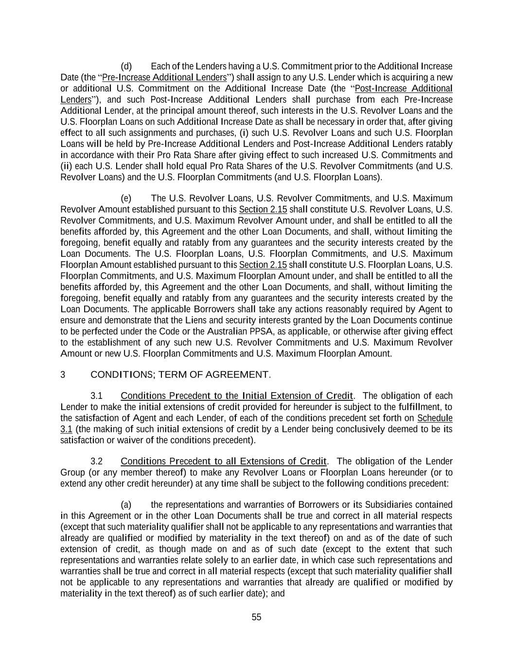 55 (d) Each of the Lenders having a U.S. Commitment prior to the Additional Increase Date (the “Pre-Increase Additional Lenders”) shall assign to any U.S. Lender which is acquiring a new or additional U.S. Commitment on the Additional Increase Date (the “Post-Increase Additional Lenders”), and such Post-Increase Additional Lenders shall purchase from each Pre-Increase Additional Lender, at the principal amount thereof, such interests in the U.S. Revolver Loans and the U.S. Floorplan Loans on such Additional Increase Date as shall be necessary in order that, after giving effect to all such assignments and purchases, (i) such U.S. Revolver Loans and such U.S. Floorplan Loans will be held by Pre-Increase Additional Lenders and Post-Increase Additional Lenders ratably in accordance with their Pro Rata Share after giving effect to such increased U.S. Commitments and (ii) each U.S. Lender shall hold equal Pro Rata Shares of the U.S. Revolver Commitments (and U.S. Revolver Loans) and the U.S. Floorplan Commitments (and U.S. Floorplan Loans). (e) The U.S. Revolver Loans, U.S. Revolver Commitments, and U.S. Maximum Revolver Amount established pursuant to this Section 2.15 shall constitute U.S. Revolver Loans, U.S. Revolver Commitments, and U.S. Maximum Revolver Amount under, and shall be entitled to all the benefits afforded by, this Agreement and the other Loan Documents, and shall, without limiting the foregoing, benefit equally and ratably from any guarantees and the security interests created by the Loan Documents. The U.S. Floorplan Loans, U.S. Floorplan Commitments, and U.S. Maximum Floorplan Amount established pursuant to this Section 2.15 shall constitute U.S. Floorplan Loans, U.S. Floorplan Commitments, and U.S. Maximum Floorplan Amount under, and shall be entitled to all the benefits afforded by, this Agreement and the other Loan Documents, and shall, without limiting the foregoing, benefit equally and ratably from any guarantees and the security interests created by the Loan Documents. The applicable Borrowers shall take any actions reasonably required by Agent to ensure and demonstrate that the Liens and security interests granted by the Loan Documents continue to be perfected under the Code or the Australian PPSA, as applicable, or otherwise after giving effect to the establishment of any such new U.S. Revolver Commitments and U.S. Maximum Revolver Amount or new U.S. Floorplan Commitments and U.S. Maximum Floorplan Amount. 3 CONDITIONS; TERM OF AGREEMENT. 3.1 Conditions Precedent to the Initial Extension of Credit. The obligation of each Lender to make the initial extensions of credit provided for hereunder is subject to the fulfillment, to the satisfaction of Agent and each Lender, of each of the conditions precedent set forth on Schedule 3.1 (the making of such initial extensions of credit by a Lender being conclusively deemed to be its satisfaction or waiver of the conditions precedent). 3.2 Conditions Precedent to all Extensions of Credit. The obligation of the Lender Group (or any member thereof) to make any Revolver Loans or Floorplan Loans hereunder (or to extend any other credit hereunder) at any time shall be subject to the following conditions precedent: (a) the representations and warranties of Borrowers or its Subsidiaries contained in this Agreement or in the other Loan Documents shall be true and correct in all material respects (except that such materiality qualifier shall not be applicable to any representations and warranties that already are qualified or modified by materiality in the text thereof) on and as of the date of such extension of credit, as though made on and as of such date (except to the extent that such representations and warranties relate solely to an earlier date, in which case such representations and warranties shall be true and correct in all material respects (except that such materiality qualifier shall not be applicable to any representations and warranties that already are qualified or modified by materiality in the text thereof) as of such earlier date); and