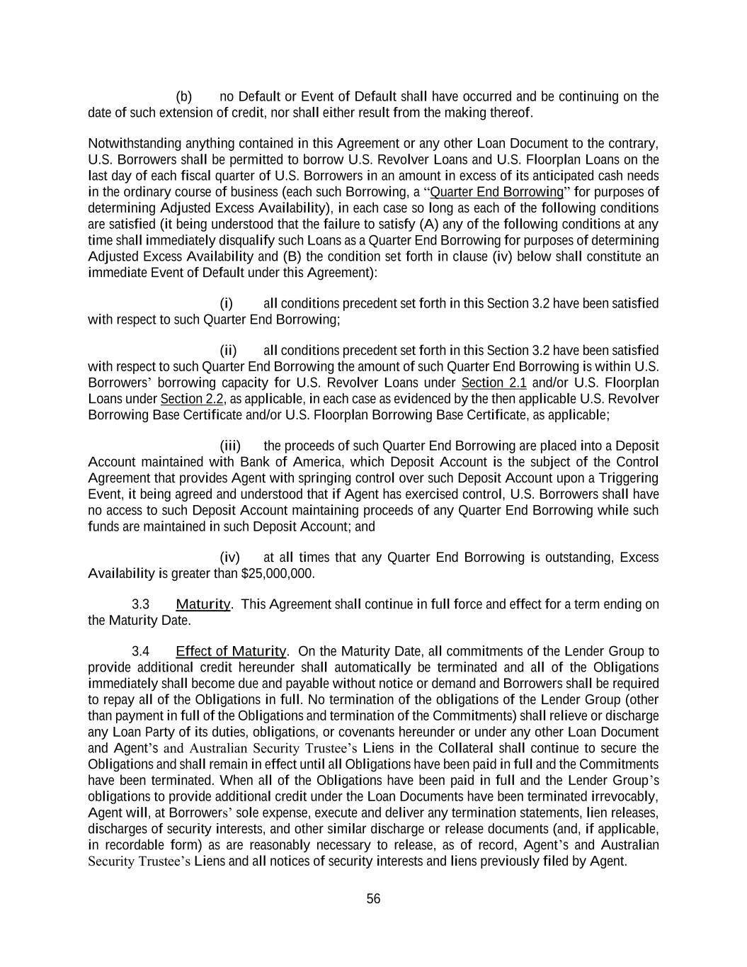 56 (b) no Default or Event of Default shall have occurred and be continuing on the date of such extension of credit, nor shall either result from the making thereof. Notwithstanding anything contained in this Agreement or any other Loan Document to the contrary, U.S. Borrowers shall be permitted to borrow U.S. Revolver Loans and U.S. Floorplan Loans on the last day of each fiscal quarter of U.S. Borrowers in an amount in excess of its anticipated cash needs in the ordinary course of business (each such Borrowing, a “Quarter End Borrowing” for purposes of determining Adjusted Excess Availability), in each case so long as each of the following conditions are satisfied (it being understood that the failure to satisfy (A) any of the following conditions at any time shall immediately disqualify such Loans as a Quarter End Borrowing for purposes of determining Adjusted Excess Availability and (B) the condition set forth in clause (iv) below shall constitute an immediate Event of Default under this Agreement): (i) all conditions precedent set forth in this Section 3.2 have been satisfied with respect to such Quarter End Borrowing; (ii) all conditions precedent set forth in this Section 3.2 have been satisfied with respect to such Quarter End Borrowing the amount of such Quarter End Borrowing is within U.S. Borrowers’ borrowing capacity for U.S. Revolver Loans under Section 2.1 and/or U.S. Floorplan Loans under Section 2.2, as applicable, in each case as evidenced by the then applicable U.S. Revolver Borrowing Base Certificate and/or U.S. Floorplan Borrowing Base Certificate, as applicable; (iii) the proceeds of such Quarter End Borrowing are placed into a Deposit Account maintained with Bank of America, which Deposit Account is the subject of the Control Agreement that provides Agent with springing control over such Deposit Account upon a Triggering Event, it being agreed and understood that if Agent has exercised control, U.S. Borrowers shall have no access to such Deposit Account maintaining proceeds of any Quarter End Borrowing while such funds are maintained in such Deposit Account; and (iv) at all times that any Quarter End Borrowing is outstanding, Excess Availability is greater than $25,000,000. 3.3 Maturity. This Agreement shall continue in full force and effect for a term ending on the Maturity Date. 3.4 Effect of Maturity. On the Maturity Date, all commitments of the Lender Group to provide additional credit hereunder shall automatically be terminated and all of the Obligations immediately shall become due and payable without notice or demand and Borrowers shall be required to repay all of the Obligations in full. No termination of the obligations of the Lender Group (other than payment in full of the Obligations and termination of the Commitments) shall relieve or discharge any Loan Party of its duties, obligations, or covenants hereunder or under any other Loan Document and Agent’s and Australian Security Trustee’s Liens in the Collateral shall continue to secure the Obligations and shall remain in effect until all Obligations have been paid in full and the Commitments have been terminated. When all of the Obligations have been paid in full and the Lender Group’s obligations to provide additional credit under the Loan Documents have been terminated irrevocably, Agent will, at Borrowers’ sole expense, execute and deliver any termination statements, lien releases, discharges of security interests, and other similar discharge or release documents (and, if applicable, in recordable form) as are reasonably necessary to release, as of record, Agent’s and Australian Security Trustee’s Liens and all notices of security interests and liens previously filed by Agent.