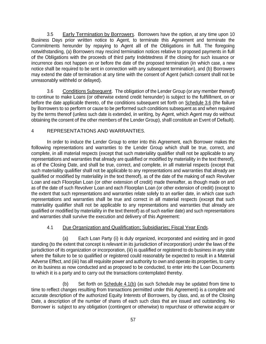 57 3.5 Early Termination by Borrowers. Borrowers have the option, at any time upon 10 Business Days prior written notice to Agent, to terminate this Agreement and terminate the Commitments hereunder by repaying to Agent all of the Obligations in full. The foregoing notwithstanding, (a) Borrowers may rescind termination notices relative to proposed payments in full of the Obligations with the proceeds of third party Indebtedness if the closing for such issuance or incurrence does not happen on or before the date of the proposed termination (in which case, a new notice shall be required to be sent in connection with any subsequent termination), and (b) Borrowers may extend the date of termination at any time with the consent of Agent (which consent shall not be unreasonably withheld or delayed). 3.6 Conditions Subsequent. The obligation of the Lender Group (or any member thereof) to continue to make Loans (or otherwise extend credit hereunder) is subject to the fulfillment, on or before the date applicable thereto, of the conditions subsequent set forth on Schedule 3.6 (the failure by Borrowers to so perform or cause to be performed such conditions subsequent as and when required by the terms thereof (unless such date is extended, in writing, by Agent, which Agent may do without obtaining the consent of the other members of the Lender Group), shall constitute an Event of Default). 4 REPRESENTATIONS AND WARRANTIES. In order to induce the Lender Group to enter into this Agreement, each Borrower makes the following representations and warranties to the Lender Group which shall be true, correct, and complete, in all material respects (except that such materiality qualifier shall not be applicable to any representations and warranties that already are qualified or modified by materiality in the text thereof), as of the Closing Date, and shall be true, correct, and complete, in all material respects (except that such materiality qualifier shall not be applicable to any representations and warranties that already are qualified or modified by materiality in the text thereof), as of the date of the making of each Revolver Loan and each Floorplan Loan (or other extension of credit) made thereafter, as though made on and as of the date of such Revolver Loan and each Floorplan Loan (or other extension of credit) (except to the extent that such representations and warranties relate solely to an earlier date, in which case such representations and warranties shall be true and correct in all material respects (except that such materiality qualifier shall not be applicable to any representations and warranties that already are qualified or modified by materiality in the text thereof) as of such earlier date) and such representations and warranties shall survive the execution and delivery of this Agreement: 4.1 Due Organization and Qualification; Subsidiaries; Fiscal Year Ends. (a) Each Loan Party (i) is duly organized, incorporated and existing and in good standing (to the extent that concept is relevant in its jurisdiction of incorporation) under the laws of the jurisdiction of its organization or incorporation, (ii) is qualified or registered to do business in any state where the failure to be so qualified or registered could reasonably be expected to result in a Material Adverse Effect, and (iii) has all requisite power and authority to own and operate its properties, to carry on its business as now conducted and as proposed to be conducted, to enter into the Loan Documents to which it is a party and to carry out the transactions contemplated thereby. (b) Set forth on Schedule 4.1(b) (as such Schedule may be updated from time to time to reflect changes resulting from transactions permitted under this Agreement) is a complete and accurate description of the authorized Equity Interests of Borrowers, by class, and, as of the Closing Date, a description of the number of shares of each such class that are issued and outstanding. No Borrower is subject to any obligation (contingent or otherwise) to repurchase or otherwise acquire or