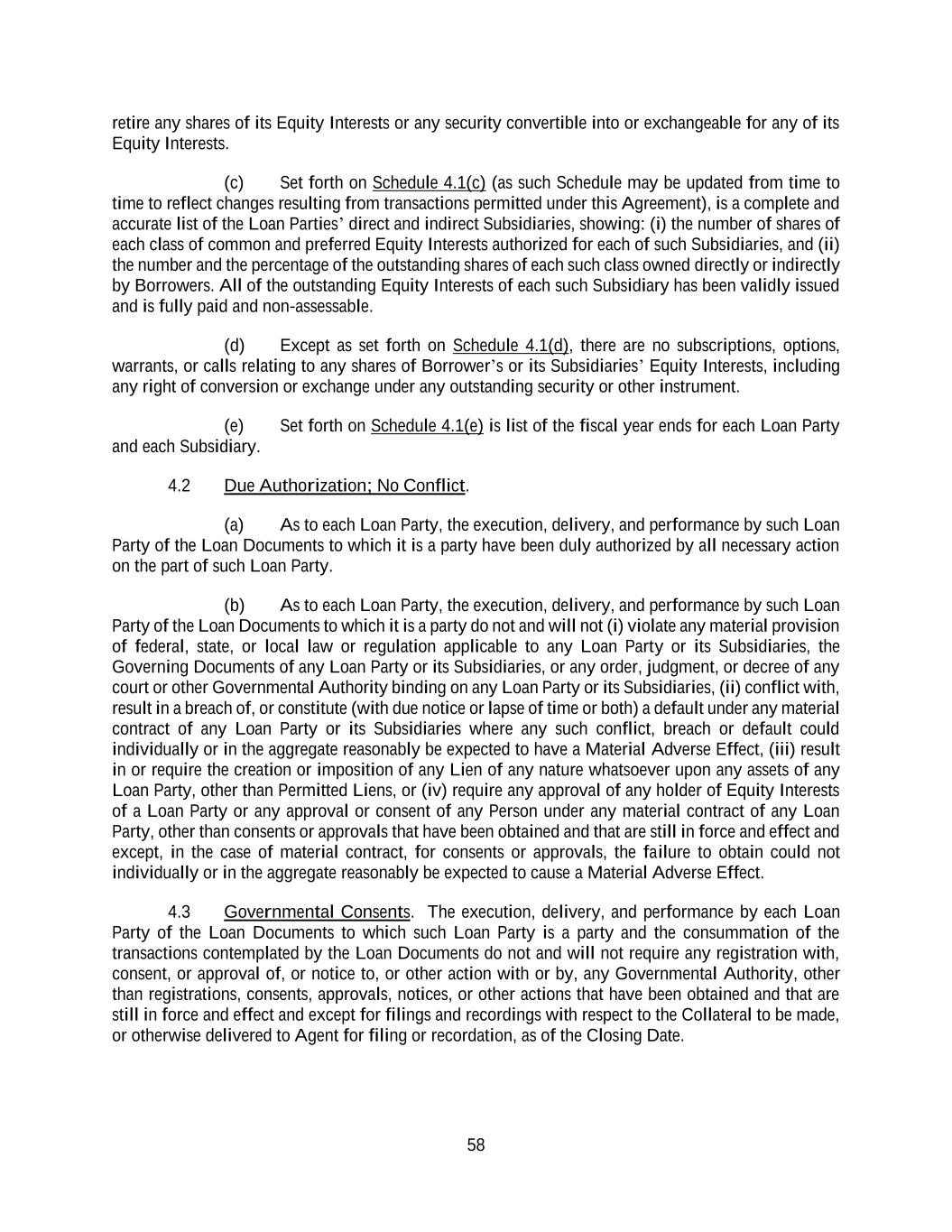 58 retire any shares of its Equity Interests or any security convertible into or exchangeable for any of its Equity Interests. (c) Set forth on Schedule 4.1(c) (as such Schedule may be updated from time to time to reflect changes resulting from transactions permitted under this Agreement), is a complete and accurate list of the Loan Parties’ direct and indirect Subsidiaries, showing: (i) the number of shares of each class of common and preferred Equity Interests authorized for each of such Subsidiaries, and (ii) the number and the percentage of the outstanding shares of each such class owned directly or indirectly by Borrowers. All of the outstanding Equity Interests of each such Subsidiary has been validly issued and is fully paid and non-assessable. (d) Except as set forth on Schedule 4.1(d), there are no subscriptions, options, warrants, or calls relating to any shares of Borrower’s or its Subsidiaries’ Equity Interests, including any right of conversion or exchange under any outstanding security or other instrument. (e) Set forth on Schedule 4.1(e) is list of the fiscal year ends for each Loan Party and each Subsidiary. 4.2 Due Authorization; No Conflict. (a) As to each Loan Party, the execution, delivery, and performance by such Loan Party of the Loan Documents to which it is a party have been duly authorized by all necessary action on the part of such Loan Party. (b) As to each Loan Party, the execution, delivery, and performance by such Loan Party of the Loan Documents to which it is a party do not and will not (i) violate any material provision of federal, state, or local law or regulation applicable to any Loan Party or its Subsidiaries, the Governing Documents of any Loan Party or its Subsidiaries, or any order, judgment, or decree of any court or other Governmental Authority binding on any Loan Party or its Subsidiaries, (ii) conflict with, result in a breach of, or constitute (with due notice or lapse of time or both) a default under any material contract of any Loan Party or its Subsidiaries where any such conflict, breach or default could individually or in the aggregate reasonably be expected to have a Material Adverse Effect, (iii) result in or require the creation or imposition of any Lien of any nature whatsoever upon any assets of any Loan Party, other than Permitted Liens, or (iv) require any approval of any holder of Equity Interests of a Loan Party or any approval or consent of any Person under any material contract of any Loan Party, other than consents or approvals that have been obtained and that are still in force and effect and except, in the case of material contract, for consents or approvals, the failure to obtain could not individually or in the aggregate reasonably be expected to cause a Material Adverse Effect. 4.3 Governmental Consents. The execution, delivery, and performance by each Loan Party of the Loan Documents to which such Loan Party is a party and the consummation of the transactions contemplated by the Loan Documents do not and will not require any registration with, consent, or approval of, or notice to, or other action with or by, any Governmental Authority, other than registrations, consents, approvals, notices, or other actions that have been obtained and that are still in force and effect and except for filings and recordings with respect to the Collateral to be made, or otherwise delivered to Agent for filing or recordation, as of the Closing Date.