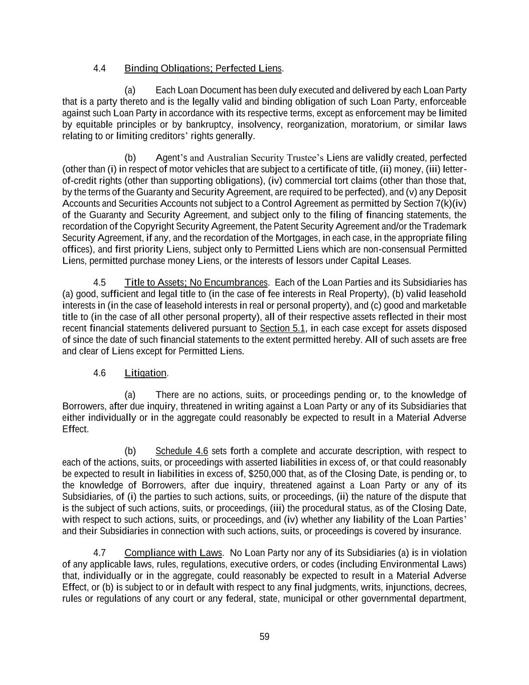 59 4.4 Binding Obligations; Perfected Liens. (a) Each Loan Document has been duly executed and delivered by each Loan Party that is a party thereto and is the legally valid and binding obligation of such Loan Party, enforceable against such Loan Party in accordance with its respective terms, except as enforcement may be limited by equitable principles or by bankruptcy, insolvency, reorganization, moratorium, or similar laws relating to or limiting creditors’ rights generally. (b) Agent’s and Australian Security Trustee’s Liens are validly created, perfected (other than (i) in respect of motor vehicles that are subject to a certificate of title, (ii) money, (iii) letter- of-credit rights (other than supporting obligations), (iv) commercial tort claims (other than those that, by the terms of the Guaranty and Security Agreement, are required to be perfected), and (v) any Deposit Accounts and Securities Accounts not subject to a Control Agreement as permitted by Section 7(k)(iv) of the Guaranty and Security Agreement, and subject only to the filing of financing statements, the recordation of the Copyright Security Agreement, the Patent Security Agreement and/or the Trademark Security Agreement, if any, and the recordation of the Mortgages, in each case, in the appropriate filing offices), and first priority Liens, subject only to Permitted Liens which are non-consensual Permitted Liens, permitted purchase money Liens, or the interests of lessors under Capital Leases. 4.5 Title to Assets; No Encumbrances. Each of the Loan Parties and its Subsidiaries has (a) good, sufficient and legal title to (in the case of fee interests in Real Property), (b) valid leasehold interests in (in the case of leasehold interests in real or personal property), and (c) good and marketable title to (in the case of all other personal property), all of their respective assets reflected in their most recent financial statements delivered pursuant to Section 5.1, in each case except for assets disposed of since the date of such financial statements to the extent permitted hereby. All of such assets are free and clear of Liens except for Permitted Liens. 4.6 Litigation. (a) There are no actions, suits, or proceedings pending or, to the knowledge of Borrowers, after due inquiry, threatened in writing against a Loan Party or any of its Subsidiaries that either individually or in the aggregate could reasonably be expected to result in a Material Adverse Effect. (b) Schedule 4.6 sets forth a complete and accurate description, with respect to each of the actions, suits, or proceedings with asserted liabilities in excess of, or that could reasonably be expected to result in liabilities in excess of, $250,000 that, as of the Closing Date, is pending or, to the knowledge of Borrowers, after due inquiry, threatened against a Loan Party or any of its Subsidiaries, of (i) the parties to such actions, suits, or proceedings, (ii) the nature of the dispute that is the subject of such actions, suits, or proceedings, (iii) the procedural status, as of the Closing Date, with respect to such actions, suits, or proceedings, and (iv) whether any liability of the Loan Parties’ and their Subsidiaries in connection with such actions, suits, or proceedings is covered by insurance. 4.7 Compliance with Laws. No Loan Party nor any of its Subsidiaries (a) is in violation of any applicable laws, rules, regulations, executive orders, or codes (including Environmental Laws) that, individually or in the aggregate, could reasonably be expected to result in a Material Adverse Effect, or (b) is subject to or in default with respect to any final judgments, writs, injunctions, decrees, rules or regulations of any court or any federal, state, municipal or other governmental department,