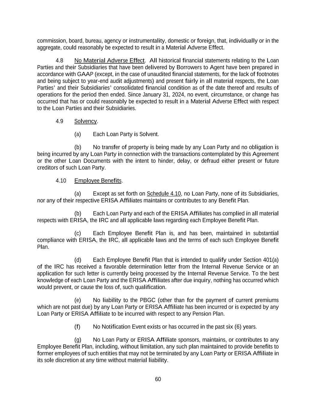 60 commission, board, bureau, agency or instrumentality, domestic or foreign, that, individually or in the aggregate, could reasonably be expected to result in a Material Adverse Effect. 4.8 No Material Adverse Effect. All historical financial statements relating to the Loan Parties and their Subsidiaries that have been delivered by Borrowers to Agent have been prepared in accordance with GAAP (except, in the case of unaudited financial statements, for the lack of footnotes and being subject to year-end audit adjustments) and present fairly in all material respects, the Loan Parties’ and their Subsidiaries’ consolidated financial condition as of the date thereof and results of operations for the period then ended. Since January 31, 2024, no event, circumstance, or change has occurred that has or could reasonably be expected to result in a Material Adverse Effect with respect to the Loan Parties and their Subsidiaries. 4.9 Solvency. (a) Each Loan Party is Solvent. (b) No transfer of property is being made by any Loan Party and no obligation is being incurred by any Loan Party in connection with the transactions contemplated by this Agreement or the other Loan Documents with the intent to hinder, delay, or defraud either present or future creditors of such Loan Party. 4.10 Employee Benefits. (a) Except as set forth on Schedule 4.10, no Loan Party, none of its Subsidiaries, nor any of their respective ERISA Affiliates maintains or contributes to any Benefit Plan. (b) Each Loan Party and each of the ERISA Affiliates has complied in all material respects with ERISA, the IRC and all applicable laws regarding each Employee Benefit Plan. (c) Each Employee Benefit Plan is, and has been, maintained in substantial compliance with ERISA, the IRC, all applicable laws and the terms of each such Employee Benefit Plan. (d) Each Employee Benefit Plan that is intended to qualify under Section 401(a) of the IRC has received a favorable determination letter from the Internal Revenue Service or an application for such letter is currently being processed by the Internal Revenue Service. To the best knowledge of each Loan Party and the ERISA Affiliates after due inquiry, nothing has occurred which would prevent, or cause the loss of, such qualification. (e) No liability to the PBGC (other than for the payment of current premiums which are not past due) by any Loan Party or ERISA Affiliate has been incurred or is expected by any Loan Party or ERISA Affiliate to be incurred with respect to any Pension Plan. (f) No Notification Event exists or has occurred in the past six (6) years. (g) No Loan Party or ERISA Affiliate sponsors, maintains, or contributes to any Employee Benefit Plan, including, without limitation, any such plan maintained to provide benefits to former employees of such entities that may not be terminated by any Loan Party or ERISA Affiliate in its sole discretion at any time without material liability.