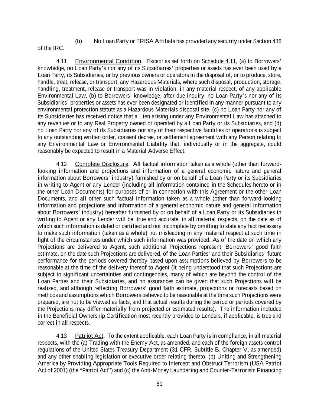 61 (h) No Loan Party or ERISA Affiliate has provided any security under Section 436 of the IRC. 4.11 Environmental Condition. Except as set forth on Schedule 4.11, (a) to Borrowers’ knowledge, no Loan Party’s nor any of its Subsidiaries’ properties or assets has ever been used by a Loan Party, its Subsidiaries, or by previous owners or operators in the disposal of, or to produce, store, handle, treat, release, or transport, any Hazardous Materials, where such disposal, production, storage, handling, treatment, release or transport was in violation, in any material respect, of any applicable Environmental Law, (b) to Borrowers’ knowledge, after due inquiry, no Loan Party’s nor any of its Subsidiaries’ properties or assets has ever been designated or identified in any manner pursuant to any environmental protection statute as a Hazardous Materials disposal site, (c) no Loan Party nor any of its Subsidiaries has received notice that a Lien arising under any Environmental Law has attached to any revenues or to any Real Property owned or operated by a Loan Party or its Subsidiaries, and (d) no Loan Party nor any of its Subsidiaries nor any of their respective facilities or operations is subject to any outstanding written order, consent decree, or settlement agreement with any Person relating to any Environmental Law or Environmental Liability that, individually or in the aggregate, could reasonably be expected to result in a Material Adverse Effect. 4.12 Complete Disclosure. All factual information taken as a whole (other than forward- looking information and projections and information of a general economic nature and general information about Borrowers’ industry) furnished by or on behalf of a Loan Party or its Subsidiaries in writing to Agent or any Lender (including all information contained in the Schedules hereto or in the other Loan Documents) for purposes of or in connection with this Agreement or the other Loan Documents, and all other such factual information taken as a whole (other than forward-looking information and projections and information of a general economic nature and general information about Borrowers’ industry) hereafter furnished by or on behalf of a Loan Party or its Subsidiaries in writing to Agent or any Lender will be, true and accurate, in all material respects, on the date as of which such information is dated or certified and not incomplete by omitting to state any fact necessary to make such information (taken as a whole) not misleading in any material respect at such time in light of the circumstances under which such information was provided. As of the date on which any Projections are delivered to Agent, such additional Projections represent, Borrowers’ good faith estimate, on the date such Projections are delivered, of the Loan Parties’ and their Subsidiaries’ future performance for the periods covered thereby based upon assumptions believed by Borrowers to be reasonable at the time of the delivery thereof to Agent (it being understood that such Projections are subject to significant uncertainties and contingencies, many of which are beyond the control of the Loan Parties and their Subsidiaries, and no assurances can be given that such Projections will be realized, and although reflecting Borrowers’ good faith estimate, projections or forecasts based on methods and assumptions which Borrowers believed to be reasonable at the time such Projections were prepared, are not to be viewed as facts, and that actual results during the period or periods covered by the Projections may differ materially from projected or estimated results). The information included in the Beneficial Ownership Certification most recently provided to Lenders, if applicable, is true and correct in all respects. 4.13 Patriot Act. To the extent applicable, each Loan Party is in compliance, in all material respects, with the (a) Trading with the Enemy Act, as amended, and each of the foreign assets control regulations of the United States Treasury Department (31 CFR, Subtitle B, Chapter V, as amended) and any other enabling legislation or executive order relating thereto, (b) Uniting and Strengthening America by Providing Appropriate Tools Required to Intercept and Obstruct Terrorism (USA Patriot Act of 2001) (the “Patriot Act”) and (c) the Anti-Money Laundering and Counter-Terrorism Financing