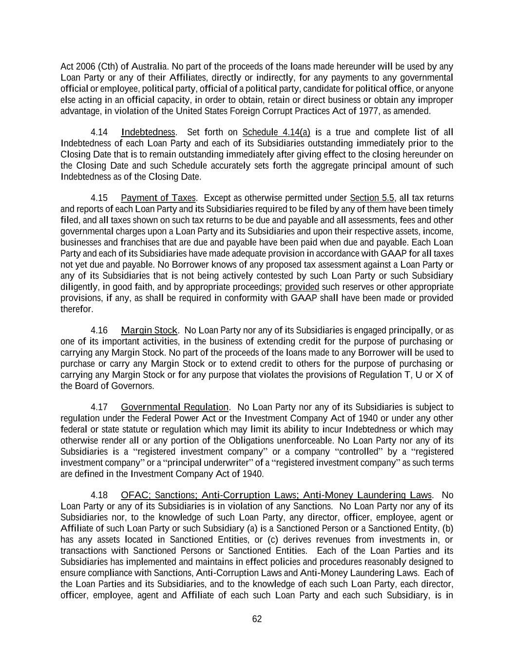 62 Act 2006 (Cth) of Australia. No part of the proceeds of the loans made hereunder will be used by any Loan Party or any of their Affiliates, directly or indirectly, for any payments to any governmental official or employee, political party, official of a political party, candidate for political office, or anyone else acting in an official capacity, in order to obtain, retain or direct business or obtain any improper advantage, in violation of the United States Foreign Corrupt Practices Act of 1977, as amended. 4.14 Indebtedness. Set forth on Schedule 4.14(a) is a true and complete list of all Indebtedness of each Loan Party and each of its Subsidiaries outstanding immediately prior to the Closing Date that is to remain outstanding immediately after giving effect to the closing hereunder on the Closing Date and such Schedule accurately sets forth the aggregate principal amount of such Indebtedness as of the Closing Date. 4.15 Payment of Taxes. Except as otherwise permitted under Section 5.5, all tax returns and reports of each Loan Party and its Subsidiaries required to be filed by any of them have been timely filed, and all taxes shown on such tax returns to be due and payable and all assessments, fees and other governmental charges upon a Loan Party and its Subsidiaries and upon their respective assets, income, businesses and franchises that are due and payable have been paid when due and payable. Each Loan Party and each of its Subsidiaries have made adequate provision in accordance with GAAP for all taxes not yet due and payable. No Borrower knows of any proposed tax assessment against a Loan Party or any of its Subsidiaries that is not being actively contested by such Loan Party or such Subsidiary diligently, in good faith, and by appropriate proceedings; provided such reserves or other appropriate provisions, if any, as shall be required in conformity with GAAP shall have been made or provided therefor. 4.16 Margin Stock. No Loan Party nor any of its Subsidiaries is engaged principally, or as one of its important activities, in the business of extending credit for the purpose of purchasing or carrying any Margin Stock. No part of the proceeds of the loans made to any Borrower will be used to purchase or carry any Margin Stock or to extend credit to others for the purpose of purchasing or carrying any Margin Stock or for any purpose that violates the provisions of Regulation T, U or X of the Board of Governors. 4.17 Governmental Regulation. No Loan Party nor any of its Subsidiaries is subject to regulation under the Federal Power Act or the Investment Company Act of 1940 or under any other federal or state statute or regulation which may limit its ability to incur Indebtedness or which may otherwise render all or any portion of the Obligations unenforceable. No Loan Party nor any of its Subsidiaries is a “registered investment company” or a company “controlled” by a “registered investment company” or a “principal underwriter” of a “registered investment company” as such terms are defined in the Investment Company Act of 1940. 4.18 OFAC; Sanctions; Anti-Corruption Laws; Anti-Money Laundering Laws. No Loan Party or any of its Subsidiaries is in violation of any Sanctions. No Loan Party nor any of its Subsidiaries nor, to the knowledge of such Loan Party, any director, officer, employee, agent or Affiliate of such Loan Party or such Subsidiary (a) is a Sanctioned Person or a Sanctioned Entity, (b) has any assets located in Sanctioned Entities, or (c) derives revenues from investments in, or transactions with Sanctioned Persons or Sanctioned Entities. Each of the Loan Parties and its Subsidiaries has implemented and maintains in effect policies and procedures reasonably designed to ensure compliance with Sanctions, Anti-Corruption Laws and Anti-Money Laundering Laws. Each of the Loan Parties and its Subsidiaries, and to the knowledge of each such Loan Party, each director, officer, employee, agent and Affiliate of each such Loan Party and each such Subsidiary, is in