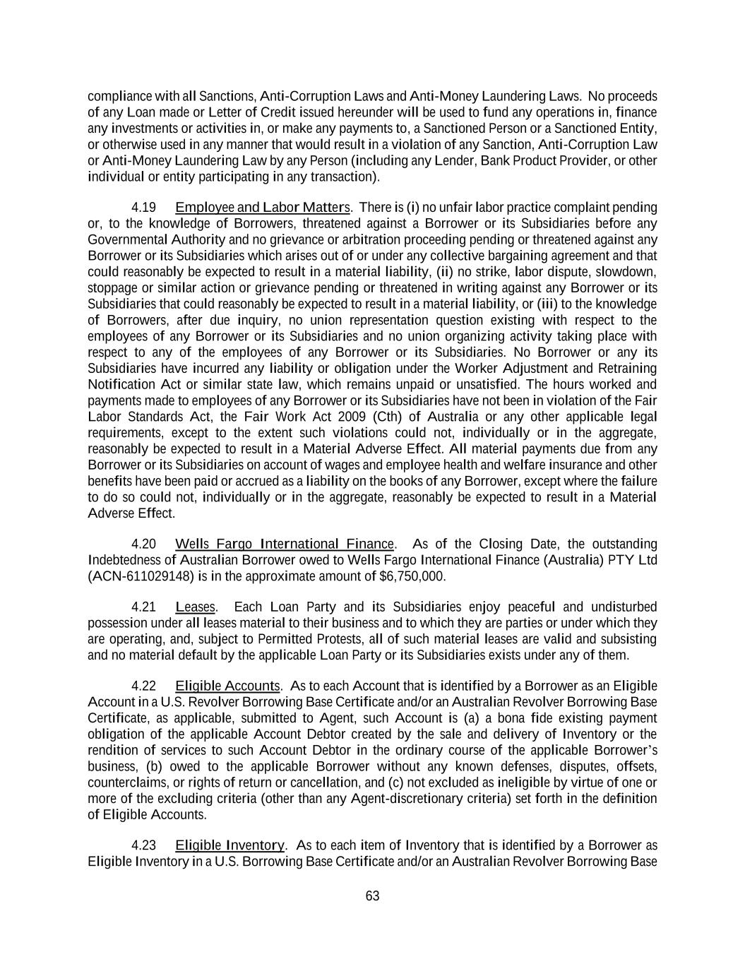 63 compliance with all Sanctions, Anti-Corruption Laws and Anti-Money Laundering Laws. No proceeds of any Loan made or Letter of Credit issued hereunder will be used to fund any operations in, finance any investments or activities in, or make any payments to, a Sanctioned Person or a Sanctioned Entity, or otherwise used in any manner that would result in a violation of any Sanction, Anti-Corruption Law or Anti-Money Laundering Law by any Person (including any Lender, Bank Product Provider, or other individual or entity participating in any transaction). 4.19 Employee and Labor Matters. There is (i) no unfair labor practice complaint pending or, to the knowledge of Borrowers, threatened against a Borrower or its Subsidiaries before any Governmental Authority and no grievance or arbitration proceeding pending or threatened against any Borrower or its Subsidiaries which arises out of or under any collective bargaining agreement and that could reasonably be expected to result in a material liability, (ii) no strike, labor dispute, slowdown, stoppage or similar action or grievance pending or threatened in writing against any Borrower or its Subsidiaries that could reasonably be expected to result in a material liability, or (iii) to the knowledge of Borrowers, after due inquiry, no union representation question existing with respect to the employees of any Borrower or its Subsidiaries and no union organizing activity taking place with respect to any of the employees of any Borrower or its Subsidiaries. No Borrower or any its Subsidiaries have incurred any liability or obligation under the Worker Adjustment and Retraining Notification Act or similar state law, which remains unpaid or unsatisfied. The hours worked and payments made to employees of any Borrower or its Subsidiaries have not been in violation of the Fair Labor Standards Act, the Fair Work Act 2009 (Cth) of Australia or any other applicable legal requirements, except to the extent such violations could not, individually or in the aggregate, reasonably be expected to result in a Material Adverse Effect. All material payments due from any Borrower or its Subsidiaries on account of wages and employee health and welfare insurance and other benefits have been paid or accrued as a liability on the books of any Borrower, except where the failure to do so could not, individually or in the aggregate, reasonably be expected to result in a Material Adverse Effect. 4.20 Wells Fargo International Finance. As of the Closing Date, the outstanding Indebtedness of Australian Borrower owed to Wells Fargo International Finance (Australia) PTY Ltd (ACN-611029148) is in the approximate amount of $6,750,000. 4.21 Leases. Each Loan Party and its Subsidiaries enjoy peaceful and undisturbed possession under all leases material to their business and to which they are parties or under which they are operating, and, subject to Permitted Protests, all of such material leases are valid and subsisting and no material default by the applicable Loan Party or its Subsidiaries exists under any of them. 4.22 Eligible Accounts. As to each Account that is identified by a Borrower as an Eligible Account in a U.S. Revolver Borrowing Base Certificate and/or an Australian Revolver Borrowing Base Certificate, as applicable, submitted to Agent, such Account is (a) a bona fide existing payment obligation of the applicable Account Debtor created by the sale and delivery of Inventory or the rendition of services to such Account Debtor in the ordinary course of the applicable Borrower’s business, (b) owed to the applicable Borrower without any known defenses, disputes, offsets, counterclaims, or rights of return or cancellation, and (c) not excluded as ineligible by virtue of one or more of the excluding criteria (other than any Agent-discretionary criteria) set forth in the definition of Eligible Accounts. 4.23 Eligible Inventory. As to each item of Inventory that is identified by a Borrower as Eligible Inventory in a U.S. Borrowing Base Certificate and/or an Australian Revolver Borrowing Base