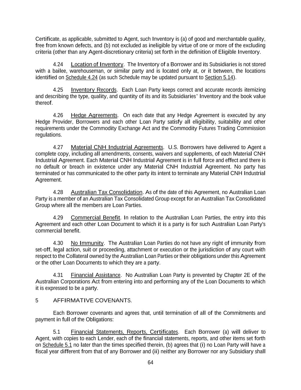 64 Certificate, as applicable, submitted to Agent, such Inventory is (a) of good and merchantable quality, free from known defects, and (b) not excluded as ineligible by virtue of one or more of the excluding criteria (other than any Agent-discretionary criteria) set forth in the definition of Eligible Inventory. 4.24 Location of Inventory. The Inventory of a Borrower and its Subsidiaries is not stored with a bailee, warehouseman, or similar party and is located only at, or it between, the locations identified on Schedule 4.24 (as such Schedule may be updated pursuant to Section 5.14). 4.25 Inventory Records. Each Loan Party keeps correct and accurate records itemizing and describing the type, quality, and quantity of its and its Subsidiaries’ Inventory and the book value thereof. 4.26 Hedge Agreements. On each date that any Hedge Agreement is executed by any Hedge Provider, Borrowers and each other Loan Party satisfy all eligibility, suitability and other requirements under the Commodity Exchange Act and the Commodity Futures Trading Commission regulations. 4.27 Material CNH Industrial Agreements. U.S. Borrowers have delivered to Agent a complete copy, including all amendments, consents, waivers and supplements, of each Material CNH Industrial Agreement. Each Material CNH Industrial Agreement is in full force and effect and there is no default or breach in existence under any Material CNH Industrial Agreement. No party has terminated or has communicated to the other party its intent to terminate any Material CNH Industrial Agreement. 4.28 Australian Tax Consolidation. As of the date of this Agreement, no Australian Loan Party is a member of an Australian Tax Consolidated Group except for an Australian Tax Consolidated Group where all the members are Loan Parties. 4.29 Commercial Benefit. In relation to the Australian Loan Parties, the entry into this Agreement and each other Loan Document to which it is a party is for such Australian Loan Party's commercial benefit. 4.30 No Immunity. The Australian Loan Parties do not have any right of immunity from set-off, legal action, suit or proceeding, attachment or execution or the jurisdiction of any court with respect to the Collateral owned by the Australian Loan Parties or their obligations under this Agreement or the other Loan Documents to which they are a party. 4.31 Financial Assistance. No Australian Loan Party is prevented by Chapter 2E of the Australian Corporations Act from entering into and performing any of the Loan Documents to which it is expressed to be a party. 5 AFFIRMATIVE COVENANTS. Each Borrower covenants and agrees that, until termination of all of the Commitments and payment in full of the Obligations: 5.1 Financial Statements, Reports, Certificates. Each Borrower (a) will deliver to Agent, with copies to each Lender, each of the financial statements, reports, and other items set forth on Schedule 5.1 no later than the times specified therein, (b) agrees that (i) no Loan Party will have a fiscal year different from that of any Borrower and (ii) neither any Borrower nor any Subsidiary shall