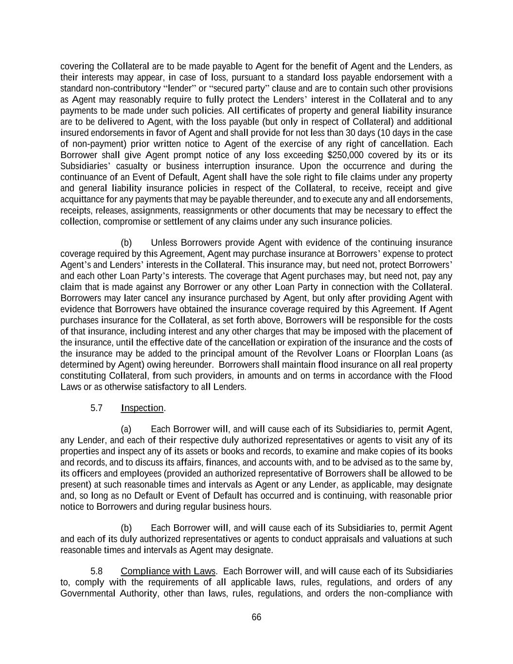 66 covering the Collateral are to be made payable to Agent for the benefit of Agent and the Lenders, as their interests may appear, in case of loss, pursuant to a standard loss payable endorsement with a standard non-contributory “lender” or “secured party” clause and are to contain such other provisions as Agent may reasonably require to fully protect the Lenders’ interest in the Collateral and to any payments to be made under such policies. All certificates of property and general liability insurance are to be delivered to Agent, with the loss payable (but only in respect of Collateral) and additional insured endorsements in favor of Agent and shall provide for not less than 30 days (10 days in the case of non-payment) prior written notice to Agent of the exercise of any right of cancellation. Each Borrower shall give Agent prompt notice of any loss exceeding $250,000 covered by its or its Subsidiaries’ casualty or business interruption insurance. Upon the occurrence and during the continuance of an Event of Default, Agent shall have the sole right to file claims under any property and general liability insurance policies in respect of the Collateral, to receive, receipt and give acquittance for any payments that may be payable thereunder, and to execute any and all endorsements, receipts, releases, assignments, reassignments or other documents that may be necessary to effect the collection, compromise or settlement of any claims under any such insurance policies. (b) Unless Borrowers provide Agent with evidence of the continuing insurance coverage required by this Agreement, Agent may purchase insurance at Borrowers’ expense to protect Agent’s and Lenders’ interests in the Collateral. This insurance may, but need not, protect Borrowers’ and each other Loan Party’s interests. The coverage that Agent purchases may, but need not, pay any claim that is made against any Borrower or any other Loan Party in connection with the Collateral. Borrowers may later cancel any insurance purchased by Agent, but only after providing Agent with evidence that Borrowers have obtained the insurance coverage required by this Agreement. If Agent purchases insurance for the Collateral, as set forth above, Borrowers will be responsible for the costs of that insurance, including interest and any other charges that may be imposed with the placement of the insurance, until the effective date of the cancellation or expiration of the insurance and the costs of the insurance may be added to the principal amount of the Revolver Loans or Floorplan Loans (as determined by Agent) owing hereunder. Borrowers shall maintain flood insurance on all real property constituting Collateral, from such providers, in amounts and on terms in accordance with the Flood Laws or as otherwise satisfactory to all Lenders. 5.7 Inspection. (a) Each Borrower will, and will cause each of its Subsidiaries to, permit Agent, any Lender, and each of their respective duly authorized representatives or agents to visit any of its properties and inspect any of its assets or books and records, to examine and make copies of its books and records, and to discuss its affairs, finances, and accounts with, and to be advised as to the same by, its officers and employees (provided an authorized representative of Borrowers shall be allowed to be present) at such reasonable times and intervals as Agent or any Lender, as applicable, may designate and, so long as no Default or Event of Default has occurred and is continuing, with reasonable prior notice to Borrowers and during regular business hours. (b) Each Borrower will, and will cause each of its Subsidiaries to, permit Agent and each of its duly authorized representatives or agents to conduct appraisals and valuations at such reasonable times and intervals as Agent may designate. 5.8 Compliance with Laws. Each Borrower will, and will cause each of its Subsidiaries to, comply with the requirements of all applicable laws, rules, regulations, and orders of any Governmental Authority, other than laws, rules, regulations, and orders the non-compliance with