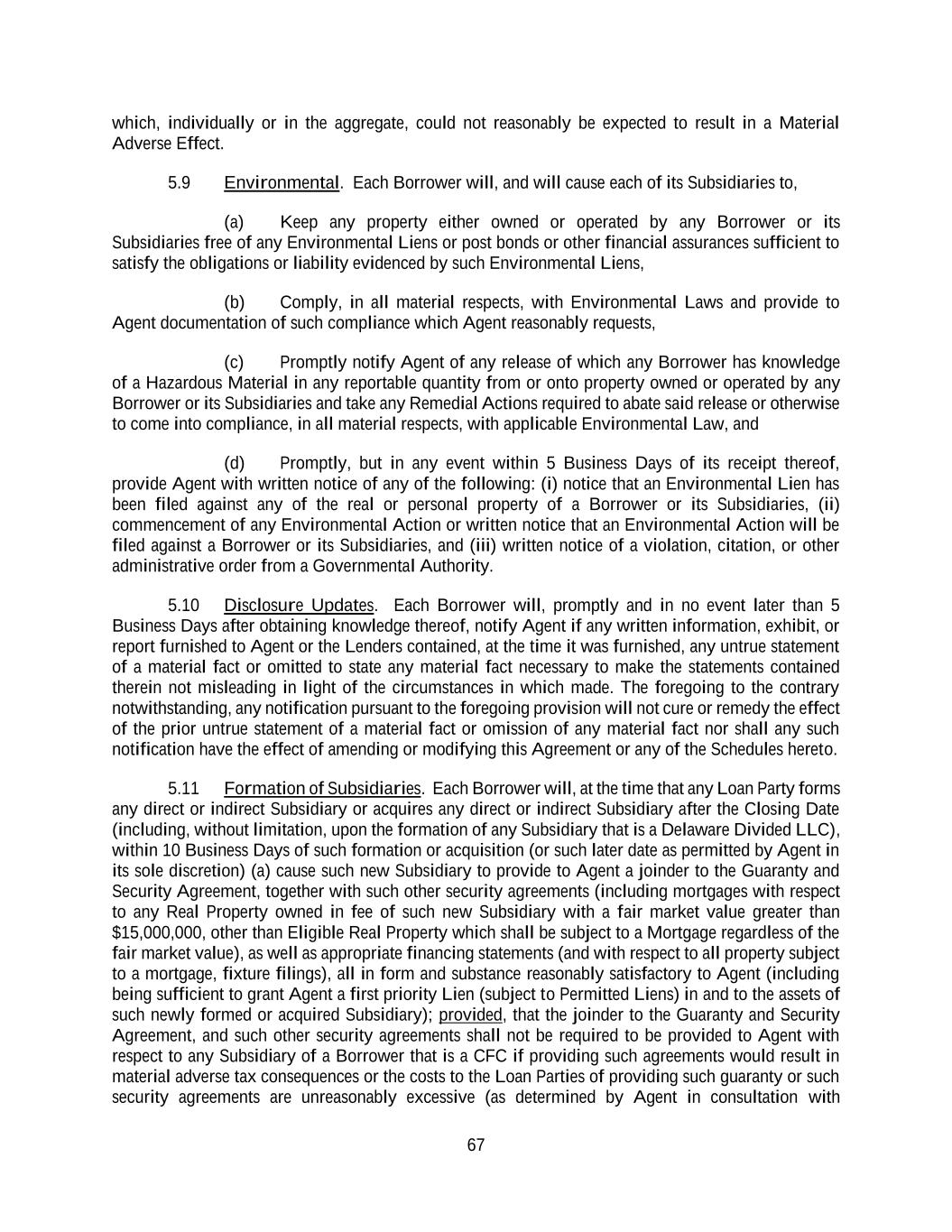 67 which, individually or in the aggregate, could not reasonably be expected to result in a Material Adverse Effect. 5.9 Environmental. Each Borrower will, and will cause each of its Subsidiaries to, (a) Keep any property either owned or operated by any Borrower or its Subsidiaries free of any Environmental Liens or post bonds or other financial assurances sufficient to satisfy the obligations or liability evidenced by such Environmental Liens, (b) Comply, in all material respects, with Environmental Laws and provide to Agent documentation of such compliance which Agent reasonably requests, (c) Promptly notify Agent of any release of which any Borrower has knowledge of a Hazardous Material in any reportable quantity from or onto property owned or operated by any Borrower or its Subsidiaries and take any Remedial Actions required to abate said release or otherwise to come into compliance, in all material respects, with applicable Environmental Law, and (d) Promptly, but in any event within 5 Business Days of its receipt thereof, provide Agent with written notice of any of the following: (i) notice that an Environmental Lien has been filed against any of the real or personal property of a Borrower or its Subsidiaries, (ii) commencement of any Environmental Action or written notice that an Environmental Action will be filed against a Borrower or its Subsidiaries, and (iii) written notice of a violation, citation, or other administrative order from a Governmental Authority. 5.10 Disclosure Updates. Each Borrower will, promptly and in no event later than 5 Business Days after obtaining knowledge thereof, notify Agent if any written information, exhibit, or report furnished to Agent or the Lenders contained, at the time it was furnished, any untrue statement of a material fact or omitted to state any material fact necessary to make the statements contained therein not misleading in light of the circumstances in which made. The foregoing to the contrary notwithstanding, any notification pursuant to the foregoing provision will not cure or remedy the effect of the prior untrue statement of a material fact or omission of any material fact nor shall any such notification have the effect of amending or modifying this Agreement or any of the Schedules hereto. 5.11 Formation of Subsidiaries. Each Borrower will, at the time that any Loan Party forms any direct or indirect Subsidiary or acquires any direct or indirect Subsidiary after the Closing Date (including, without limitation, upon the formation of any Subsidiary that is a Delaware Divided LLC), within 10 Business Days of such formation or acquisition (or such later date as permitted by Agent in its sole discretion) (a) cause such new Subsidiary to provide to Agent a joinder to the Guaranty and Security Agreement, together with such other security agreements (including mortgages with respect to any Real Property owned in fee of such new Subsidiary with a fair market value greater than $15,000,000, other than Eligible Real Property which shall be subject to a Mortgage regardless of the fair market value), as well as appropriate financing statements (and with respect to all property subject to a mortgage, fixture filings), all in form and substance reasonably satisfactory to Agent (including being sufficient to grant Agent a first priority Lien (subject to Permitted Liens) in and to the assets of such newly formed or acquired Subsidiary); provided, that the joinder to the Guaranty and Security Agreement, and such other security agreements shall not be required to be provided to Agent with respect to any Subsidiary of a Borrower that is a CFC if providing such agreements would result in material adverse tax consequences or the costs to the Loan Parties of providing such guaranty or such security agreements are unreasonably excessive (as determined by Agent in consultation with