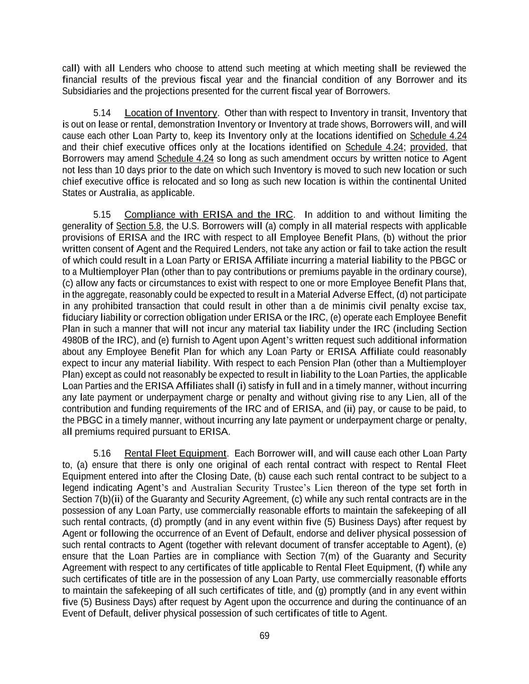69 call) with all Lenders who choose to attend such meeting at which meeting shall be reviewed the financial results of the previous fiscal year and the financial condition of any Borrower and its Subsidiaries and the projections presented for the current fiscal year of Borrowers. 5.14 Location of Inventory. Other than with respect to Inventory in transit, Inventory that is out on lease or rental, demonstration Inventory or Inventory at trade shows, Borrowers will, and will cause each other Loan Party to, keep its Inventory only at the locations identified on Schedule 4.24 and their chief executive offices only at the locations identified on Schedule 4.24; provided, that Borrowers may amend Schedule 4.24 so long as such amendment occurs by written notice to Agent not less than 10 days prior to the date on which such Inventory is moved to such new location or such chief executive office is relocated and so long as such new location is within the continental United States or Australia, as applicable. 5.15 Compliance with ERISA and the IRC. In addition to and without limiting the generality of Section 5.8, the U.S. Borrowers will (a) comply in all material respects with applicable provisions of ERISA and the IRC with respect to all Employee Benefit Plans, (b) without the prior written consent of Agent and the Required Lenders, not take any action or fail to take action the result of which could result in a Loan Party or ERISA Affiliate incurring a material liability to the PBGC or to a Multiemployer Plan (other than to pay contributions or premiums payable in the ordinary course), (c) allow any facts or circumstances to exist with respect to one or more Employee Benefit Plans that, in the aggregate, reasonably could be expected to result in a Material Adverse Effect, (d) not participate in any prohibited transaction that could result in other than a de minimis civil penalty excise tax, fiduciary liability or correction obligation under ERISA or the IRC, (e) operate each Employee Benefit Plan in such a manner that will not incur any material tax liability under the IRC (including Section 4980B of the IRC), and (e) furnish to Agent upon Agent’s written request such additional information about any Employee Benefit Plan for which any Loan Party or ERISA Affiliate could reasonably expect to incur any material liability. With respect to each Pension Plan (other than a Multiemployer Plan) except as could not reasonably be expected to result in liability to the Loan Parties, the applicable Loan Parties and the ERISA Affiliates shall (i) satisfy in full and in a timely manner, without incurring any late payment or underpayment charge or penalty and without giving rise to any Lien, all of the contribution and funding requirements of the IRC and of ERISA, and (ii) pay, or cause to be paid, to the PBGC in a timely manner, without incurring any late payment or underpayment charge or penalty, all premiums required pursuant to ERISA. 5.16 Rental Fleet Equipment. Each Borrower will, and will cause each other Loan Party to, (a) ensure that there is only one original of each rental contract with respect to Rental Fleet Equipment entered into after the Closing Date, (b) cause each such rental contract to be subject to a legend indicating Agent’s and Australian Security Trustee’s Lien thereon of the type set forth in Section 7(b)(ii) of the Guaranty and Security Agreement, (c) while any such rental contracts are in the possession of any Loan Party, use commercially reasonable efforts to maintain the safekeeping of all such rental contracts, (d) promptly (and in any event within five (5) Business Days) after request by Agent or following the occurrence of an Event of Default, endorse and deliver physical possession of such rental contracts to Agent (together with relevant document of transfer acceptable to Agent), (e) ensure that the Loan Parties are in compliance with Section 7(m) of the Guaranty and Security Agreement with respect to any certificates of title applicable to Rental Fleet Equipment, (f) while any such certificates of title are in the possession of any Loan Party, use commercially reasonable efforts to maintain the safekeeping of all such certificates of title, and (g) promptly (and in any event within five (5) Business Days) after request by Agent upon the occurrence and during the continuance of an Event of Default, deliver physical possession of such certificates of title to Agent.