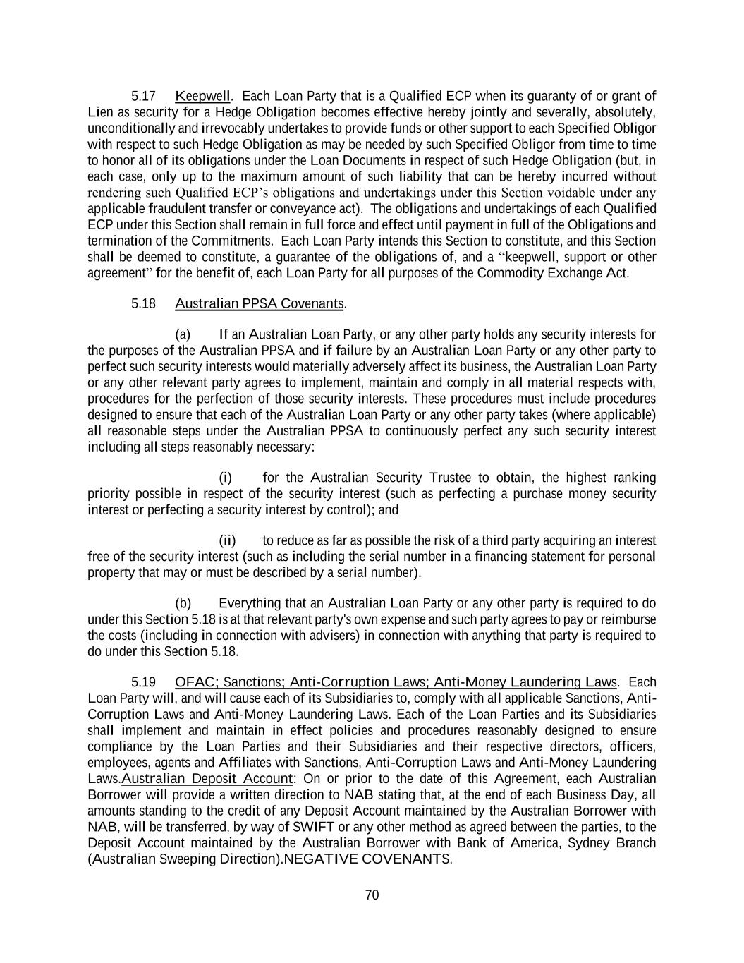 70 5.17 Keepwell. Each Loan Party that is a Qualified ECP when its guaranty of or grant of Lien as security for a Hedge Obligation becomes effective hereby jointly and severally, absolutely, unconditionally and irrevocably undertakes to provide funds or other support to each Specified Obligor with respect to such Hedge Obligation as may be needed by such Specified Obligor from time to time to honor all of its obligations under the Loan Documents in respect of such Hedge Obligation (but, in each case, only up to the maximum amount of such liability that can be hereby incurred without rendering such Qualified ECP’s obligations and undertakings under this Section voidable under any applicable fraudulent transfer or conveyance act). The obligations and undertakings of each Qualified ECP under this Section shall remain in full force and effect until payment in full of the Obligations and termination of the Commitments. Each Loan Party intends this Section to constitute, and this Section shall be deemed to constitute, a guarantee of the obligations of, and a “keepwell, support or other agreement” for the benefit of, each Loan Party for all purposes of the Commodity Exchange Act. 5.18 Australian PPSA Covenants. (a) If an Australian Loan Party, or any other party holds any security interests for the purposes of the Australian PPSA and if failure by an Australian Loan Party or any other party to perfect such security interests would materially adversely affect its business, the Australian Loan Party or any other relevant party agrees to implement, maintain and comply in all material respects with, procedures for the perfection of those security interests. These procedures must include procedures designed to ensure that each of the Australian Loan Party or any other party takes (where applicable) all reasonable steps under the Australian PPSA to continuously perfect any such security interest including all steps reasonably necessary: (i) for the Australian Security Trustee to obtain, the highest ranking priority possible in respect of the security interest (such as perfecting a purchase money security interest or perfecting a security interest by control); and (ii) to reduce as far as possible the risk of a third party acquiring an interest free of the security interest (such as including the serial number in a financing statement for personal property that may or must be described by a serial number). (b) Everything that an Australian Loan Party or any other party is required to do under this Section 5.18 is at that relevant party's own expense and such party agrees to pay or reimburse the costs (including in connection with advisers) in connection with anything that party is required to do under this Section 5.18. 5.19 OFAC; Sanctions; Anti-Corruption Laws; Anti-Money Laundering Laws. Each Loan Party will, and will cause each of its Subsidiaries to, comply with all applicable Sanctions, Anti- Corruption Laws and Anti-Money Laundering Laws. Each of the Loan Parties and its Subsidiaries shall implement and maintain in effect policies and procedures reasonably designed to ensure compliance by the Loan Parties and their Subsidiaries and their respective directors, officers, employees, agents and Affiliates with Sanctions, Anti-Corruption Laws and Anti-Money Laundering Laws.Australian Deposit Account: On or prior to the date of this Agreement, each Australian Borrower will provide a written direction to NAB stating that, at the end of each Business Day, all amounts standing to the credit of any Deposit Account maintained by the Australian Borrower with NAB, will be transferred, by way of SWIFT or any other method as agreed between the parties, to the Deposit Account maintained by the Australian Borrower with Bank of America, Sydney Branch (Australian Sweeping Direction).NEGATIVE COVENANTS.