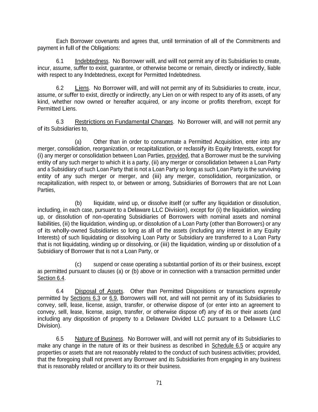 71 Each Borrower covenants and agrees that, until termination of all of the Commitments and payment in full of the Obligations: 6.1 Indebtedness. No Borrower will, and will not permit any of its Subsidiaries to create, incur, assume, suffer to exist, guarantee, or otherwise become or remain, directly or indirectly, liable with respect to any Indebtedness, except for Permitted Indebtedness. 6.2 Liens. No Borrower will, and will not permit any of its Subsidiaries to create, incur, assume, or suffer to exist, directly or indirectly, any Lien on or with respect to any of its assets, of any kind, whether now owned or hereafter acquired, or any income or profits therefrom, except for Permitted Liens. 6.3 Restrictions on Fundamental Changes. No Borrower will, and will not permit any of its Subsidiaries to, (a) Other than in order to consummate a Permitted Acquisition, enter into any merger, consolidation, reorganization, or recapitalization, or reclassify its Equity Interests, except for (i) any merger or consolidation between Loan Parties, provided, that a Borrower must be the surviving entity of any such merger to which it is a party, (ii) any merger or consolidation between a Loan Party and a Subsidiary of such Loan Party that is not a Loan Party so long as such Loan Party is the surviving entity of any such merger or merger, and (iii) any merger, consolidation, reorganization, or recapitalization, with respect to, or between or among, Subsidiaries of Borrowers that are not Loan Parties, (b) liquidate, wind up, or dissolve itself (or suffer any liquidation or dissolution, including, in each case, pursuant to a Delaware LLC Division), except for (i) the liquidation, winding up, or dissolution of non-operating Subsidiaries of Borrowers with nominal assets and nominal liabilities, (ii) the liquidation, winding up, or dissolution of a Loan Party (other than Borrowers) or any of its wholly-owned Subsidiaries so long as all of the assets (including any interest in any Equity Interests) of such liquidating or dissolving Loan Party or Subsidiary are transferred to a Loan Party that is not liquidating, winding up or dissolving, or (iii) the liquidation, winding up or dissolution of a Subsidiary of Borrower that is not a Loan Party, or (c) suspend or cease operating a substantial portion of its or their business, except as permitted pursuant to clauses (a) or (b) above or in connection with a transaction permitted under Section 6.4. 6.4 Disposal of Assets. Other than Permitted Dispositions or transactions expressly permitted by Sections 6.3 or 6.9, Borrowers will not, and will not permit any of its Subsidiaries to convey, sell, lease, license, assign, transfer, or otherwise dispose of (or enter into an agreement to convey, sell, lease, license, assign, transfer, or otherwise dispose of) any of its or their assets (and including any disposition of property to a Delaware Divided LLC pursuant to a Delaware LLC Division). 6.5 Nature of Business. No Borrower will, and will not permit any of its Subsidiaries to make any change in the nature of its or their business as described in Schedule 6.5 or acquire any properties or assets that are not reasonably related to the conduct of such business activities; provided, that the foregoing shall not prevent any Borrower and its Subsidiaries from engaging in any business that is reasonably related or ancillary to its or their business.