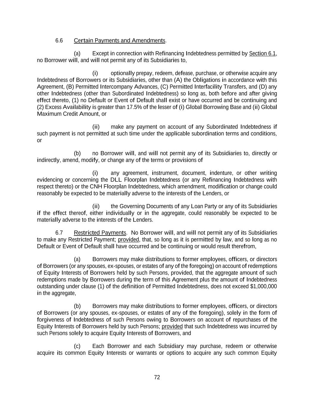 72 6.6 Certain Payments and Amendments. (a) Except in connection with Refinancing Indebtedness permitted by Section 6.1, no Borrower will, and will not permit any of its Subsidiaries to, (i) optionally prepay, redeem, defease, purchase, or otherwise acquire any Indebtedness of Borrowers or its Subsidiaries, other than (A) the Obligations in accordance with this Agreement, (B) Permitted Intercompany Advances, (C) Permitted Interfacility Transfers, and (D) any other Indebtedness (other than Subordinated Indebtedness) so long as, both before and after giving effect thereto, (1) no Default or Event of Default shall exist or have occurred and be continuing and (2) Excess Availability is greater than 17.5% of the lesser of (i) Global Borrowing Base and (ii) Global Maximum Credit Amount, or (ii) make any payment on account of any Subordinated Indebtedness if such payment is not permitted at such time under the applicable subordination terms and conditions, or (b) no Borrower will, and will not permit any of its Subsidiaries to, directly or indirectly, amend, modify, or change any of the terms or provisions of (i) any agreement, instrument, document, indenture, or other writing evidencing or concerning the DLL Floorplan Indebtedness (or any Refinancing Indebtedness with respect thereto) or the CNH Floorplan Indebtedness, which amendment, modification or change could reasonably be expected to be materially adverse to the interests of the Lenders, or (ii) the Governing Documents of any Loan Party or any of its Subsidiaries if the effect thereof, either individually or in the aggregate, could reasonably be expected to be materially adverse to the interests of the Lenders. 6.7 Restricted Payments. No Borrower will, and will not permit any of its Subsidiaries to make any Restricted Payment; provided, that, so long as it is permitted by law, and so long as no Default or Event of Default shall have occurred and be continuing or would result therefrom, (a) Borrowers may make distributions to former employees, officers, or directors of Borrowers (or any spouses, ex-spouses, or estates of any of the foregoing) on account of redemptions of Equity Interests of Borrowers held by such Persons, provided, that the aggregate amount of such redemptions made by Borrowers during the term of this Agreement plus the amount of Indebtedness outstanding under clause (1) of the definition of Permitted Indebtedness, does not exceed $1,000,000 in the aggregate, (b) Borrowers may make distributions to former employees, officers, or directors of Borrowers (or any spouses, ex-spouses, or estates of any of the foregoing), solely in the form of forgiveness of Indebtedness of such Persons owing to Borrowers on account of repurchases of the Equity Interests of Borrowers held by such Persons; provided that such Indebtedness was incurred by such Persons solely to acquire Equity Interests of Borrowers, and (c) Each Borrower and each Subsidiary may purchase, redeem or otherwise acquire its common Equity Interests or warrants or options to acquire any such common Equity