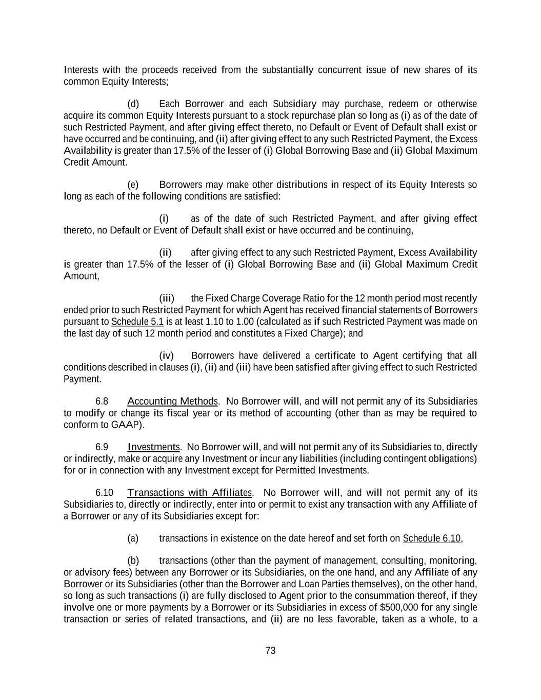 73 Interests with the proceeds received from the substantially concurrent issue of new shares of its common Equity Interests; (d) Each Borrower and each Subsidiary may purchase, redeem or otherwise acquire its common Equity Interests pursuant to a stock repurchase plan so long as (i) as of the date of such Restricted Payment, and after giving effect thereto, no Default or Event of Default shall exist or have occurred and be continuing, and (ii) after giving effect to any such Restricted Payment, the Excess Availability is greater than 17.5% of the lesser of (i) Global Borrowing Base and (ii) Global Maximum Credit Amount. (e) Borrowers may make other distributions in respect of its Equity Interests so long as each of the following conditions are satisfied: (i) as of the date of such Restricted Payment, and after giving effect thereto, no Default or Event of Default shall exist or have occurred and be continuing, (ii) after giving effect to any such Restricted Payment, Excess Availability is greater than 17.5% of the lesser of (i) Global Borrowing Base and (ii) Global Maximum Credit Amount, (iii) the Fixed Charge Coverage Ratio for the 12 month period most recently ended prior to such Restricted Payment for which Agent has received financial statements of Borrowers pursuant to Schedule 5.1 is at least 1.10 to 1.00 (calculated as if such Restricted Payment was made on the last day of such 12 month period and constitutes a Fixed Charge); and (iv) Borrowers have delivered a certificate to Agent certifying that all conditions described in clauses (i), (ii) and (iii) have been satisfied after giving effect to such Restricted Payment. 6.8 Accounting Methods. No Borrower will, and will not permit any of its Subsidiaries to modify or change its fiscal year or its method of accounting (other than as may be required to conform to GAAP). 6.9 Investments. No Borrower will, and will not permit any of its Subsidiaries to, directly or indirectly, make or acquire any Investment or incur any liabilities (including contingent obligations) for or in connection with any Investment except for Permitted Investments. 6.10 Transactions with Affiliates. No Borrower will, and will not permit any of its Subsidiaries to, directly or indirectly, enter into or permit to exist any transaction with any Affiliate of a Borrower or any of its Subsidiaries except for: (a) transactions in existence on the date hereof and set forth on Schedule 6.10, (b) transactions (other than the payment of management, consulting, monitoring, or advisory fees) between any Borrower or its Subsidiaries, on the one hand, and any Affiliate of any Borrower or its Subsidiaries (other than the Borrower and Loan Parties themselves), on the other hand, so long as such transactions (i) are fully disclosed to Agent prior to the consummation thereof, if they involve one or more payments by a Borrower or its Subsidiaries in excess of $500,000 for any single transaction or series of related transactions, and (ii) are no less favorable, taken as a whole, to a
