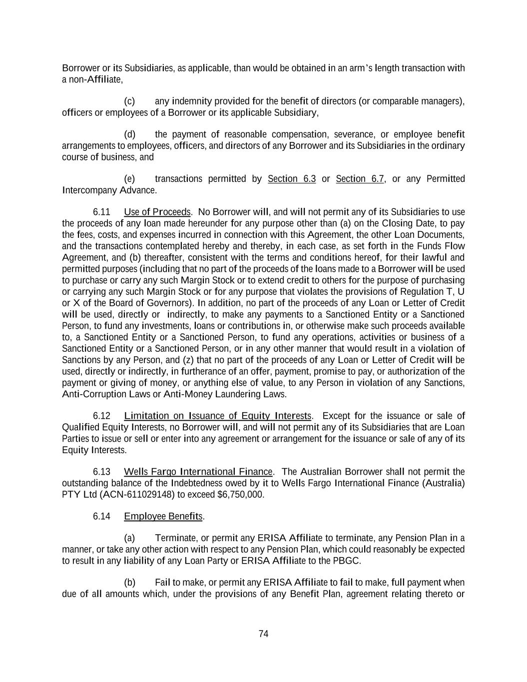 74 Borrower or its Subsidiaries, as applicable, than would be obtained in an arm’s length transaction with a non-Affiliate, (c) any indemnity provided for the benefit of directors (or comparable managers), officers or employees of a Borrower or its applicable Subsidiary, (d) the payment of reasonable compensation, severance, or employee benefit arrangements to employees, officers, and directors of any Borrower and its Subsidiaries in the ordinary course of business, and (e) transactions permitted by Section 6.3 or Section 6.7, or any Permitted Intercompany Advance. 6.11 Use of Proceeds. No Borrower will, and will not permit any of its Subsidiaries to use the proceeds of any loan made hereunder for any purpose other than (a) on the Closing Date, to pay the fees, costs, and expenses incurred in connection with this Agreement, the other Loan Documents, and the transactions contemplated hereby and thereby, in each case, as set forth in the Funds Flow Agreement, and (b) thereafter, consistent with the terms and conditions hereof, for their lawful and permitted purposes (including that no part of the proceeds of the loans made to a Borrower will be used to purchase or carry any such Margin Stock or to extend credit to others for the purpose of purchasing or carrying any such Margin Stock or for any purpose that violates the provisions of Regulation T, U or X of the Board of Governors). In addition, no part of the proceeds of any Loan or Letter of Credit will be used, directly or indirectly, to make any payments to a Sanctioned Entity or a Sanctioned Person, to fund any investments, loans or contributions in, or otherwise make such proceeds available to, a Sanctioned Entity or a Sanctioned Person, to fund any operations, activities or business of a Sanctioned Entity or a Sanctioned Person, or in any other manner that would result in a violation of Sanctions by any Person, and (z) that no part of the proceeds of any Loan or Letter of Credit will be used, directly or indirectly, in furtherance of an offer, payment, promise to pay, or authorization of the payment or giving of money, or anything else of value, to any Person in violation of any Sanctions, Anti-Corruption Laws or Anti-Money Laundering Laws. 6.12 Limitation on Issuance of Equity Interests. Except for the issuance or sale of Qualified Equity Interests, no Borrower will, and will not permit any of its Subsidiaries that are Loan Parties to issue or sell or enter into any agreement or arrangement for the issuance or sale of any of its Equity Interests. 6.13 Wells Fargo International Finance. The Australian Borrower shall not permit the outstanding balance of the Indebtedness owed by it to Wells Fargo International Finance (Australia) PTY Ltd (ACN-611029148) to exceed $6,750,000. 6.14 Employee Benefits. (a) Terminate, or permit any ERISA Affiliate to terminate, any Pension Plan in a manner, or take any other action with respect to any Pension Plan, which could reasonably be expected to result in any liability of any Loan Party or ERISA Affiliate to the PBGC. (b) Fail to make, or permit any ERISA Affiliate to fail to make, full payment when due of all amounts which, under the provisions of any Benefit Plan, agreement relating thereto or