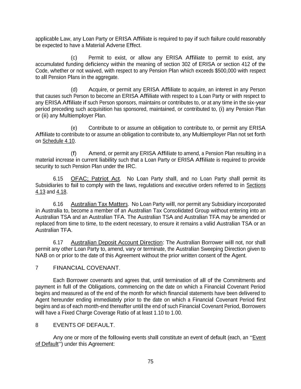 75 applicable Law, any Loan Party or ERISA Affiliate is required to pay if such failure could reasonably be expected to have a Material Adverse Effect. (c) Permit to exist, or allow any ERISA Affiliate to permit to exist, any accumulated funding deficiency within the meaning of section 302 of ERISA or section 412 of the Code, whether or not waived, with respect to any Pension Plan which exceeds $500,000 with respect to all Pension Plans in the aggregate. (d) Acquire, or permit any ERISA Affiliate to acquire, an interest in any Person that causes such Person to become an ERISA Affiliate with respect to a Loan Party or with respect to any ERISA Affiliate if such Person sponsors, maintains or contributes to, or at any time in the six-year period preceding such acquisition has sponsored, maintained, or contributed to, (i) any Pension Plan or (ii) any Multiemployer Plan. (e) Contribute to or assume an obligation to contribute to, or permit any ERISA Affiliate to contribute to or assume an obligation to contribute to, any Multiemployer Plan not set forth on Schedule 4.10. (f) Amend, or permit any ERISA Affiliate to amend, a Pension Plan resulting in a material increase in current liability such that a Loan Party or ERISA Affiliate is required to provide security to such Pension Plan under the IRC. 6.15 OFAC; Patriot Act. No Loan Party shall, and no Loan Party shall permit its Subsidiaries to fail to comply with the laws, regulations and executive orders referred to in Sections 4.13 and 4.18. 6.16 Australian Tax Matters. No Loan Party will, nor permit any Subsidiary incorporated in Australia to, become a member of an Australian Tax Consolidated Group without entering into an Australian TSA and an Australian TFA. The Australian TSA and Australian TFA may be amended or replaced from time to time, to the extent necessary, to ensure it remains a valid Australian TSA or an Australian TFA. 6.17 Australian Deposit Account Direction: The Australian Borrower will not, nor shall permit any other Loan Party to, amend, vary or terminate, the Australian Sweeping Direction given to NAB on or prior to the date of this Agreement without the prior written consent of the Agent. 7 FINANCIAL COVENANT. Each Borrower covenants and agrees that, until termination of all of the Commitments and payment in full of the Obligations, commencing on the date on which a Financial Covenant Period begins and measured as of the end of the month for which financial statements have been delivered to Agent hereunder ending immediately prior to the date on which a Financial Covenant Period first begins and as of each month-end thereafter until the end of such Financial Covenant Period, Borrowers will have a Fixed Charge Coverage Ratio of at least 1.10 to 1.00. 8 EVENTS OF DEFAULT. Any one or more of the following events shall constitute an event of default (each, an “Event of Default”) under this Agreement: