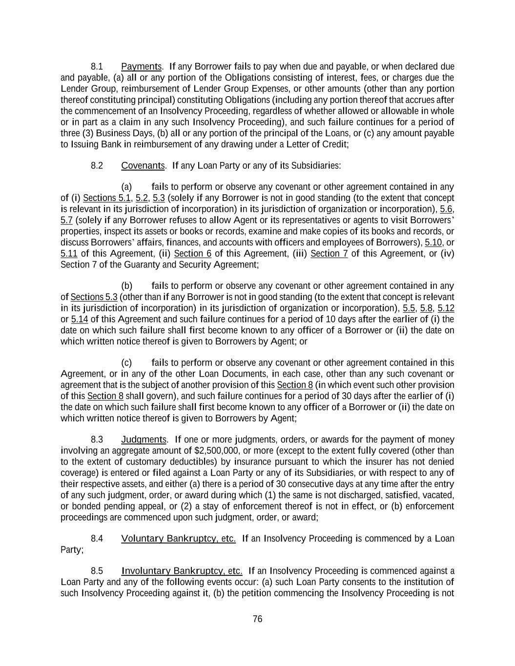 76 8.1 Payments. If any Borrower fails to pay when due and payable, or when declared due and payable, (a) all or any portion of the Obligations consisting of interest, fees, or charges due the Lender Group, reimbursement of Lender Group Expenses, or other amounts (other than any portion thereof constituting principal) constituting Obligations (including any portion thereof that accrues after the commencement of an Insolvency Proceeding, regardless of whether allowed or allowable in whole or in part as a claim in any such Insolvency Proceeding), and such failure continues for a period of three (3) Business Days, (b) all or any portion of the principal of the Loans, or (c) any amount payable to Issuing Bank in reimbursement of any drawing under a Letter of Credit; 8.2 Covenants. If any Loan Party or any of its Subsidiaries: (a) fails to perform or observe any covenant or other agreement contained in any of (i) Sections 5.1, 5.2, 5.3 (solely if any Borrower is not in good standing (to the extent that concept is relevant in its jurisdiction of incorporation) in its jurisdiction of organization or incorporation), 5.6, 5.7 (solely if any Borrower refuses to allow Agent or its representatives or agents to visit Borrowers’ properties, inspect its assets or books or records, examine and make copies of its books and records, or discuss Borrowers’ affairs, finances, and accounts with officers and employees of Borrowers), 5.10, or 5.11 of this Agreement, (ii) Section 6 of this Agreement, (iii) Section 7 of this Agreement, or (iv) Section 7 of the Guaranty and Security Agreement; (b) fails to perform or observe any covenant or other agreement contained in any of Sections 5.3 (other than if any Borrower is not in good standing (to the extent that concept is relevant in its jurisdiction of incorporation) in its jurisdiction of organization or incorporation), 5.5, 5.8, 5.12 or 5.14 of this Agreement and such failure continues for a period of 10 days after the earlier of (i) the date on which such failure shall first become known to any officer of a Borrower or (ii) the date on which written notice thereof is given to Borrowers by Agent; or (c) fails to perform or observe any covenant or other agreement contained in this Agreement, or in any of the other Loan Documents, in each case, other than any such covenant or agreement that is the subject of another provision of this Section 8 (in which event such other provision of this Section 8 shall govern), and such failure continues for a period of 30 days after the earlier of (i) the date on which such failure shall first become known to any officer of a Borrower or (ii) the date on which written notice thereof is given to Borrowers by Agent; 8.3 Judgments. If one or more judgments, orders, or awards for the payment of money involving an aggregate amount of $2,500,000, or more (except to the extent fully covered (other than to the extent of customary deductibles) by insurance pursuant to which the insurer has not denied coverage) is entered or filed against a Loan Party or any of its Subsidiaries, or with respect to any of their respective assets, and either (a) there is a period of 30 consecutive days at any time after the entry of any such judgment, order, or award during which (1) the same is not discharged, satisfied, vacated, or bonded pending appeal, or (2) a stay of enforcement thereof is not in effect, or (b) enforcement proceedings are commenced upon such judgment, order, or award; 8.4 Voluntary Bankruptcy, etc. If an Insolvency Proceeding is commenced by a Loan Party; 8.5 Involuntary Bankruptcy, etc. If an Insolvency Proceeding is commenced against a Loan Party and any of the following events occur: (a) such Loan Party consents to the institution of such Insolvency Proceeding against it, (b) the petition commencing the Insolvency Proceeding is not