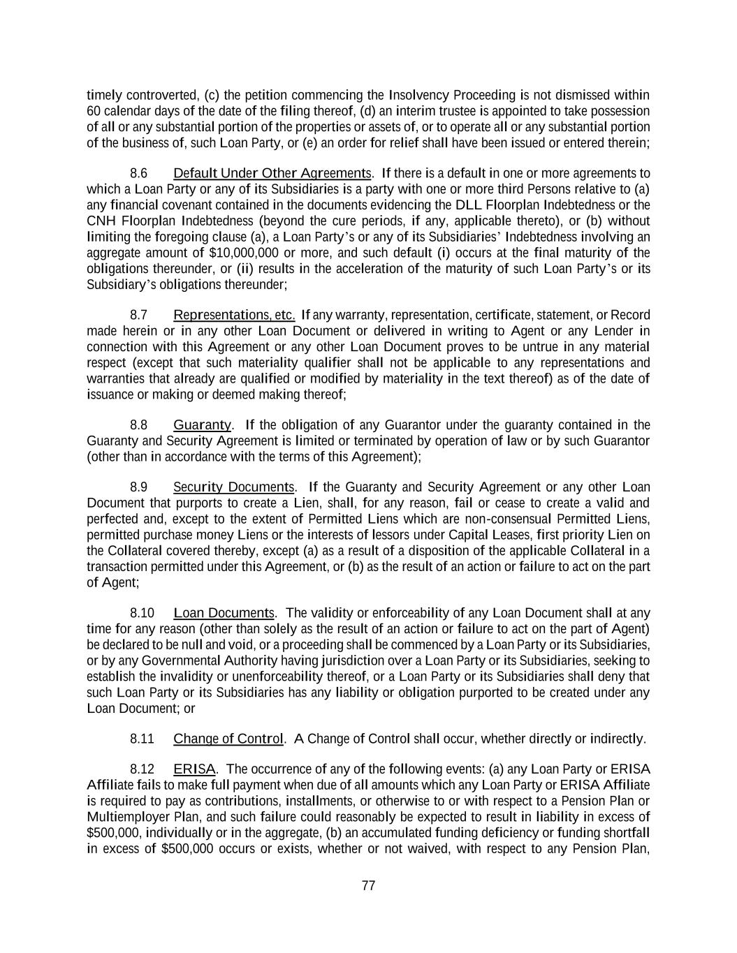77 timely controverted, (c) the petition commencing the Insolvency Proceeding is not dismissed within 60 calendar days of the date of the filing thereof, (d) an interim trustee is appointed to take possession of all or any substantial portion of the properties or assets of, or to operate all or any substantial portion of the business of, such Loan Party, or (e) an order for relief shall have been issued or entered therein; 8.6 Default Under Other Agreements. If there is a default in one or more agreements to which a Loan Party or any of its Subsidiaries is a party with one or more third Persons relative to (a) any financial covenant contained in the documents evidencing the DLL Floorplan Indebtedness or the CNH Floorplan Indebtedness (beyond the cure periods, if any, applicable thereto), or (b) without limiting the foregoing clause (a), a Loan Party’s or any of its Subsidiaries’ Indebtedness involving an aggregate amount of $10,000,000 or more, and such default (i) occurs at the final maturity of the obligations thereunder, or (ii) results in the acceleration of the maturity of such Loan Party’s or its Subsidiary’s obligations thereunder; 8.7 Representations, etc. If any warranty, representation, certificate, statement, or Record made herein or in any other Loan Document or delivered in writing to Agent or any Lender in connection with this Agreement or any other Loan Document proves to be untrue in any material respect (except that such materiality qualifier shall not be applicable to any representations and warranties that already are qualified or modified by materiality in the text thereof) as of the date of issuance or making or deemed making thereof; 8.8 Guaranty. If the obligation of any Guarantor under the guaranty contained in the Guaranty and Security Agreement is limited or terminated by operation of law or by such Guarantor (other than in accordance with the terms of this Agreement); 8.9 Security Documents. If the Guaranty and Security Agreement or any other Loan Document that purports to create a Lien, shall, for any reason, fail or cease to create a valid and perfected and, except to the extent of Permitted Liens which are non-consensual Permitted Liens, permitted purchase money Liens or the interests of lessors under Capital Leases, first priority Lien on the Collateral covered thereby, except (a) as a result of a disposition of the applicable Collateral in a transaction permitted under this Agreement, or (b) as the result of an action or failure to act on the part of Agent; 8.10 Loan Documents. The validity or enforceability of any Loan Document shall at any time for any reason (other than solely as the result of an action or failure to act on the part of Agent) be declared to be null and void, or a proceeding shall be commenced by a Loan Party or its Subsidiaries, or by any Governmental Authority having jurisdiction over a Loan Party or its Subsidiaries, seeking to establish the invalidity or unenforceability thereof, or a Loan Party or its Subsidiaries shall deny that such Loan Party or its Subsidiaries has any liability or obligation purported to be created under any Loan Document; or 8.11 Change of Control. A Change of Control shall occur, whether directly or indirectly. 8.12 ERISA. The occurrence of any of the following events: (a) any Loan Party or ERISA Affiliate fails to make full payment when due of all amounts which any Loan Party or ERISA Affiliate is required to pay as contributions, installments, or otherwise to or with respect to a Pension Plan or Multiemployer Plan, and such failure could reasonably be expected to result in liability in excess of $500,000, individually or in the aggregate, (b) an accumulated funding deficiency or funding shortfall in excess of $500,000 occurs or exists, whether or not waived, with respect to any Pension Plan,