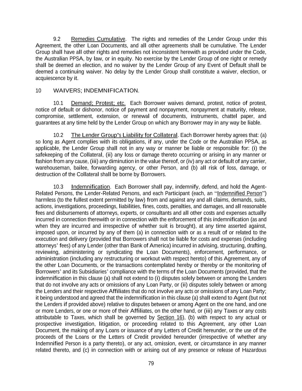79 9.2 Remedies Cumulative. The rights and remedies of the Lender Group under this Agreement, the other Loan Documents, and all other agreements shall be cumulative. The Lender Group shall have all other rights and remedies not inconsistent herewith as provided under the Code, the Australian PPSA, by law, or in equity. No exercise by the Lender Group of one right or remedy shall be deemed an election, and no waiver by the Lender Group of any Event of Default shall be deemed a continuing waiver. No delay by the Lender Group shall constitute a waiver, election, or acquiescence by it. 10 WAIVERS; INDEMNIFICATION. 10.1 Demand; Protest; etc. Each Borrower waives demand, protest, notice of protest, notice of default or dishonor, notice of payment and nonpayment, nonpayment at maturity, release, compromise, settlement, extension, or renewal of documents, instruments, chattel paper, and guarantees at any time held by the Lender Group on which any Borrower may in any way be liable. 10.2 The Lender Group’s Liability for Collateral. Each Borrower hereby agrees that: (a) so long as Agent complies with its obligations, if any, under the Code or the Australian PPSA, as applicable, the Lender Group shall not in any way or manner be liable or responsible for: (i) the safekeeping of the Collateral, (ii) any loss or damage thereto occurring or arising in any manner or fashion from any cause, (iii) any diminution in the value thereof, or (iv) any act or default of any carrier, warehouseman, bailee, forwarding agency, or other Person, and (b) all risk of loss, damage, or destruction of the Collateral shall be borne by Borrowers. 10.3 Indemnification. Each Borrower shall pay, indemnify, defend, and hold the Agent- Related Persons, the Lender-Related Persons, and each Participant (each, an “Indemnified Person”) harmless (to the fullest extent permitted by law) from and against any and all claims, demands, suits, actions, investigations, proceedings, liabilities, fines, costs, penalties, and damages, and all reasonable fees and disbursements of attorneys, experts, or consultants and all other costs and expenses actually incurred in connection therewith or in connection with the enforcement of this indemnification (as and when they are incurred and irrespective of whether suit is brought), at any time asserted against, imposed upon, or incurred by any of them (a) in connection with or as a result of or related to the execution and delivery (provided that Borrowers shall not be liable for costs and expenses (including attorneys’ fees) of any Lender (other than Bank of America) incurred in advising, structuring, drafting, reviewing, administering or syndicating the Loan Documents), enforcement, performance, or administration (including any restructuring or workout with respect hereto) of this Agreement, any of the other Loan Documents, or the transactions contemplated hereby or thereby or the monitoring of Borrowers’ and its Subsidiaries’ compliance with the terms of the Loan Documents (provided, that the indemnification in this clause (a) shall not extend to (i) disputes solely between or among the Lenders that do not involve any acts or omissions of any Loan Party, or (ii) disputes solely between or among the Lenders and their respective Affiliates that do not involve any acts or omissions of any Loan Party; it being understood and agreed that the indemnification in this clause (a) shall extend to Agent (but not the Lenders if provided above) relative to disputes between or among Agent on the one hand, and one or more Lenders, or one or more of their Affiliates, on the other hand, or (iii) any Taxes or any costs attributable to Taxes, which shall be governed by Section 16), (b) with respect to any actual or prospective investigation, litigation, or proceeding related to this Agreement, any other Loan Document, the making of any Loans or issuance of any Letters of Credit hereunder, or the use of the proceeds of the Loans or the Letters of Credit provided hereunder (irrespective of whether any Indemnified Person is a party thereto), or any act, omission, event, or circumstance in any manner related thereto, and (c) in connection with or arising out of any presence or release of Hazardous