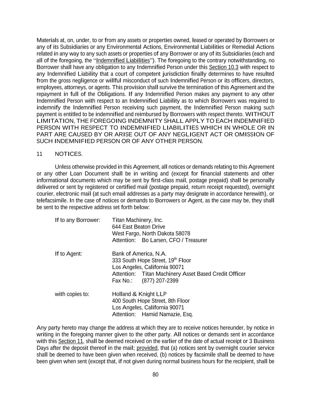 80 Materials at, on, under, to or from any assets or properties owned, leased or operated by Borrowers or any of its Subsidiaries or any Environmental Actions, Environmental Liabilities or Remedial Actions related in any way to any such assets or properties of any Borrower or any of its Subsidiaries (each and all of the foregoing, the “Indemnified Liabilities”). The foregoing to the contrary notwithstanding, no Borrower shall have any obligation to any Indemnified Person under this Section 10.3 with respect to any Indemnified Liability that a court of competent jurisdiction finally determines to have resulted from the gross negligence or willful misconduct of such Indemnified Person or its officers, directors, employees, attorneys, or agents. This provision shall survive the termination of this Agreement and the repayment in full of the Obligations. If any Indemnified Person makes any payment to any other Indemnified Person with respect to an Indemnified Liability as to which Borrowers was required to indemnify the Indemnified Person receiving such payment, the Indemnified Person making such payment is entitled to be indemnified and reimbursed by Borrowers with respect thereto. WITHOUT LIMITATION, THE FOREGOING INDEMNITY SHALL APPLY TO EACH INDEMNIFIED PERSON WITH RESPECT TO INDEMNIFIED LIABILITIES WHICH IN WHOLE OR IN PART ARE CAUSED BY OR ARISE OUT OF ANY NEGLIGENT ACT OR OMISSION OF SUCH INDEMNIFIED PERSON OR OF ANY OTHER PERSON. 11 NOTICES. Unless otherwise provided in this Agreement, all notices or demands relating to this Agreement or any other Loan Document shall be in writing and (except for financial statements and other informational documents which may be sent by first-class mail, postage prepaid) shall be personally delivered or sent by registered or certified mail (postage prepaid, return receipt requested), overnight courier, electronic mail (at such email addresses as a party may designate in accordance herewith), or telefacsimile. In the case of notices or demands to Borrowers or Agent, as the case may be, they shall be sent to the respective address set forth below: If to any Borrower: Titan Machinery, Inc. 644 East Beaton Drive West Fargo, North Dakota 58078 Attention: Bo Larsen, CFO / Treasurer If to Agent: Bank of America, N.A. 333 South Hope Street, 19th Floor Los Angeles, California 90071 Attention: Titan Machinery Asset Based Credit Officer Fax No.: (877) 207-2399 with copies to: Holland & Knight LLP 400 South Hope Street, 8th Floor Los Angeles, California 90071 Attention: Hamid Namazie, Esq. Any party hereto may change the address at which they are to receive notices hereunder, by notice in writing in the foregoing manner given to the other party. All notices or demands sent in accordance with this Section 11, shall be deemed received on the earlier of the date of actual receipt or 3 Business Days after the deposit thereof in the mail; provided, that (a) notices sent by overnight courier service shall be deemed to have been given when received, (b) notices by facsimile shall be deemed to have been given when sent (except that, if not given during normal business hours for the recipient, shall be