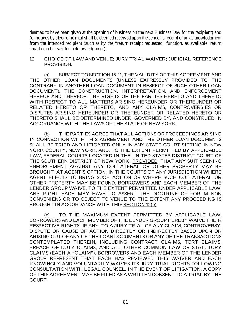 81 deemed to have been given at the opening of business on the next Business Day for the recipient) and (c) notices by electronic mail shall be deemed received upon the sender’s receipt of an acknowledgment from the intended recipient (such as by the “return receipt requested” function, as available, return email or other written acknowledgment). 12 CHOICE OF LAW AND VENUE; JURY TRIAL WAIVER; JUDICIAL REFERENCE PROVISION. (a) SUBJECT TO SECTION 15.21, THE VALIDITY OF THIS AGREEMENT AND THE OTHER LOAN DOCUMENTS (UNLESS EXPRESSLY PROVIDED TO THE CONTRARY IN ANOTHER LOAN DOCUMENT IN RESPECT OF SUCH OTHER LOAN DOCUMENT), THE CONSTRUCTION, INTERPRETATION, AND ENFORCEMENT HEREOF AND THEREOF, THE RIGHTS OF THE PARTIES HERETO AND THERETO WITH RESPECT TO ALL MATTERS ARISING HEREUNDER OR THEREUNDER OR RELATED HERETO OR THERETO, AND ANY CLAIMS, CONTROVERSIES OR DISPUTES ARISING HEREUNDER OR THEREUNDER OR RELATED HERETO OR THERETO SHALL BE DETERMINED UNDER, GOVERNED BY, AND CONSTRUED IN ACCORDANCE WITH THE LAWS OF THE STATE OF NEW YORK. (b) THE PARTIES AGREE THAT ALL ACTIONS OR PROCEEDINGS ARISING IN CONNECTION WITH THIS AGREEMENT AND THE OTHER LOAN DOCUMENTS SHALL BE TRIED AND LITIGATED ONLY IN ANY STATE COURT SITTING IN NEW YORK COUNTY, NEW YORK, AND, TO THE EXTENT PERMITTED BY APPLICABLE LAW, FEDERAL COURTS LOCATED IN THE UNITED STATES DISTRICT COURT OF THE SOUTHERN DISTRICT OF NEW YORK; PROVIDED, THAT ANY SUIT SEEKING ENFORCEMENT AGAINST ANY COLLATERAL OR OTHER PROPERTY MAY BE BROUGHT, AT AGENT’S OPTION, IN THE COURTS OF ANY JURISDICTION WHERE AGENT ELECTS TO BRING SUCH ACTION OR WHERE SUCH COLLATERAL OR OTHER PROPERTY MAY BE FOUND. BORROWERS AND EACH MEMBER OF THE LENDER GROUP WAIVE, TO THE EXTENT PERMITTED UNDER APPLICABLE LAW, ANY RIGHT EACH MAY HAVE TO ASSERT THE DOCTRINE OF FORUM NON CONVENIENS OR TO OBJECT TO VENUE TO THE EXTENT ANY PROCEEDING IS BROUGHT IN ACCORDANCE WITH THIS SECTION 12(b). (c) TO THE MAXIMUM EXTENT PERMITTED BY APPLICABLE LAW, BORROWERS AND EACH MEMBER OF THE LENDER GROUP HEREBY WAIVE THEIR RESPECTIVE RIGHTS, IF ANY, TO A JURY TRIAL OF ANY CLAIM, CONTROVERSY, DISPUTE OR CAUSE OF ACTION DIRECTLY OR INDIRECTLY BASED UPON OR ARISING OUT OF ANY OF THE LOAN DOCUMENTS OR ANY OF THE TRANSACTIONS CONTEMPLATED THEREIN, INCLUDING CONTRACT CLAIMS, TORT CLAIMS, BREACH OF DUTY CLAIMS, AND ALL OTHER COMMON LAW OR STATUTORY CLAIMS (EACH A “CLAIM”). BORROWERS AND EACH MEMBER OF THE LENDER GROUP REPRESENT THAT EACH HAS REVIEWED THIS WAIVER AND EACH KNOWINGLY AND VOLUNTARILY WAIVES ITS JURY TRIAL RIGHTS FOLLOWING CONSULTATION WITH LEGAL COUNSEL. IN THE EVENT OF LITIGATION, A COPY OF THIS AGREEMENT MAY BE FILED AS A WRITTEN CONSENT TO A TRIAL BY THE COURT.
