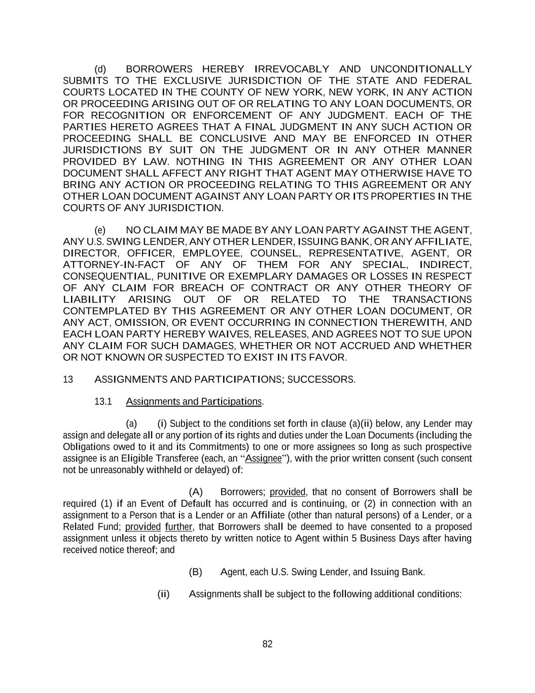 82 (d) BORROWERS HEREBY IRREVOCABLY AND UNCONDITIONALLY SUBMITS TO THE EXCLUSIVE JURISDICTION OF THE STATE AND FEDERAL COURTS LOCATED IN THE COUNTY OF NEW YORK, NEW YORK, IN ANY ACTION OR PROCEEDING ARISING OUT OF OR RELATING TO ANY LOAN DOCUMENTS, OR FOR RECOGNITION OR ENFORCEMENT OF ANY JUDGMENT. EACH OF THE PARTIES HERETO AGREES THAT A FINAL JUDGMENT IN ANY SUCH ACTION OR PROCEEDING SHALL BE CONCLUSIVE AND MAY BE ENFORCED IN OTHER JURISDICTIONS BY SUIT ON THE JUDGMENT OR IN ANY OTHER MANNER PROVIDED BY LAW. NOTHING IN THIS AGREEMENT OR ANY OTHER LOAN DOCUMENT SHALL AFFECT ANY RIGHT THAT AGENT MAY OTHERWISE HAVE TO BRING ANY ACTION OR PROCEEDING RELATING TO THIS AGREEMENT OR ANY OTHER LOAN DOCUMENT AGAINST ANY LOAN PARTY OR ITS PROPERTIES IN THE COURTS OF ANY JURISDICTION. (e) NO CLAIM MAY BE MADE BY ANY LOAN PARTY AGAINST THE AGENT, ANY U.S. SWING LENDER, ANY OTHER LENDER, ISSUING BANK, OR ANY AFFILIATE, DIRECTOR, OFFICER, EMPLOYEE, COUNSEL, REPRESENTATIVE, AGENT, OR ATTORNEY-IN-FACT OF ANY OF THEM FOR ANY SPECIAL, INDIRECT, CONSEQUENTIAL, PUNITIVE OR EXEMPLARY DAMAGES OR LOSSES IN RESPECT OF ANY CLAIM FOR BREACH OF CONTRACT OR ANY OTHER THEORY OF LIABILITY ARISING OUT OF OR RELATED TO THE TRANSACTIONS CONTEMPLATED BY THIS AGREEMENT OR ANY OTHER LOAN DOCUMENT, OR ANY ACT, OMISSION, OR EVENT OCCURRING IN CONNECTION THEREWITH, AND EACH LOAN PARTY HEREBY WAIVES, RELEASES, AND AGREES NOT TO SUE UPON ANY CLAIM FOR SUCH DAMAGES, WHETHER OR NOT ACCRUED AND WHETHER OR NOT KNOWN OR SUSPECTED TO EXIST IN ITS FAVOR. 13 ASSIGNMENTS AND PARTICIPATIONS; SUCCESSORS. 13.1 Assignments and Participations. (a) (i) Subject to the conditions set forth in clause (a)(ii) below, any Lender may assign and delegate all or any portion of its rights and duties under the Loan Documents (including the Obligations owed to it and its Commitments) to one or more assignees so long as such prospective assignee is an Eligible Transferee (each, an “Assignee”), with the prior written consent (such consent not be unreasonably withheld or delayed) of: (A) Borrowers; provided, that no consent of Borrowers shall be required (1) if an Event of Default has occurred and is continuing, or (2) in connection with an assignment to a Person that is a Lender or an Affiliate (other than natural persons) of a Lender, or a Related Fund; provided further, that Borrowers shall be deemed to have consented to a proposed assignment unless it objects thereto by written notice to Agent within 5 Business Days after having received notice thereof; and (B) Agent, each U.S. Swing Lender, and Issuing Bank. (ii) Assignments shall be subject to the following additional conditions: