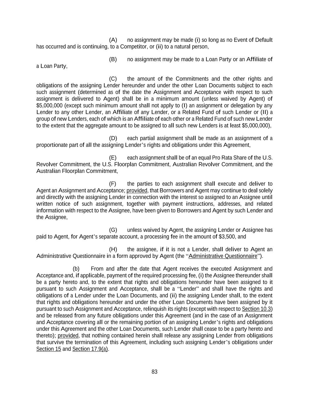 83 (A) no assignment may be made (i) so long as no Event of Default has occurred and is continuing, to a Competitor, or (ii) to a natural person, (B) no assignment may be made to a Loan Party or an Affiliate of a Loan Party, (C) the amount of the Commitments and the other rights and obligations of the assigning Lender hereunder and under the other Loan Documents subject to each such assignment (determined as of the date the Assignment and Acceptance with respect to such assignment is delivered to Agent) shall be in a minimum amount (unless waived by Agent) of $5,000,000 (except such minimum amount shall not apply to (I) an assignment or delegation by any Lender to any other Lender, an Affiliate of any Lender, or a Related Fund of such Lender or (II) a group of new Lenders, each of which is an Affiliate of each other or a Related Fund of such new Lender to the extent that the aggregate amount to be assigned to all such new Lenders is at least $5,000,000), (D) each partial assignment shall be made as an assignment of a proportionate part of all the assigning Lender’s rights and obligations under this Agreement, (E) each assignment shall be of an equal Pro Rata Share of the U.S. Revolver Commitment, the U.S. Floorplan Commitment, Australian Revolver Commitment, and the Australian Floorplan Commitment, (F) the parties to each assignment shall execute and deliver to Agent an Assignment and Acceptance; provided, that Borrowers and Agent may continue to deal solely and directly with the assigning Lender in connection with the interest so assigned to an Assignee until written notice of such assignment, together with payment instructions, addresses, and related information with respect to the Assignee, have been given to Borrowers and Agent by such Lender and the Assignee, (G) unless waived by Agent, the assigning Lender or Assignee has paid to Agent, for Agent’s separate account, a processing fee in the amount of $3,500, and (H) the assignee, if it is not a Lender, shall deliver to Agent an Administrative Questionnaire in a form approved by Agent (the “Administrative Questionnaire”). (b) From and after the date that Agent receives the executed Assignment and Acceptance and, if applicable, payment of the required processing fee, (i) the Assignee thereunder shall be a party hereto and, to the extent that rights and obligations hereunder have been assigned to it pursuant to such Assignment and Acceptance, shall be a “Lender” and shall have the rights and obligations of a Lender under the Loan Documents, and (ii) the assigning Lender shall, to the extent that rights and obligations hereunder and under the other Loan Documents have been assigned by it pursuant to such Assignment and Acceptance, relinquish its rights (except with respect to Section 10.3) and be released from any future obligations under this Agreement (and in the case of an Assignment and Acceptance covering all or the remaining portion of an assigning Lender’s rights and obligations under this Agreement and the other Loan Documents, such Lender shall cease to be a party hereto and thereto); provided, that nothing contained herein shall release any assigning Lender from obligations that survive the termination of this Agreement, including such assigning Lender’s obligations under Section 15 and Section 17.9(a).