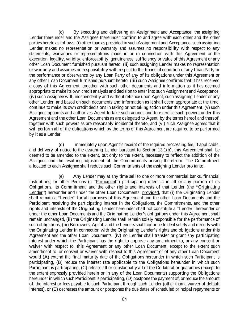 84 (c) By executing and delivering an Assignment and Acceptance, the assigning Lender thereunder and the Assignee thereunder confirm to and agree with each other and the other parties hereto as follows: (i) other than as provided in such Assignment and Acceptance, such assigning Lender makes no representation or warranty and assumes no responsibility with respect to any statements, warranties or representations made in or in connection with this Agreement or the execution, legality, validity, enforceability, genuineness, sufficiency or value of this Agreement or any other Loan Document furnished pursuant hereto, (ii) such assigning Lender makes no representation or warranty and assumes no responsibility with respect to the financial condition of any Loan Party or the performance or observance by any Loan Party of any of its obligations under this Agreement or any other Loan Document furnished pursuant hereto, (iii) such Assignee confirms that it has received a copy of this Agreement, together with such other documents and information as it has deemed appropriate to make its own credit analysis and decision to enter into such Assignment and Acceptance, (iv) such Assignee will, independently and without reliance upon Agent, such assigning Lender or any other Lender, and based on such documents and information as it shall deem appropriate at the time, continue to make its own credit decisions in taking or not taking action under this Agreement, (v) such Assignee appoints and authorizes Agent to take such actions and to exercise such powers under this Agreement and the other Loan Documents as are delegated to Agent, by the terms hereof and thereof, together with such powers as are reasonably incidental thereto, and (vi) such Assignee agrees that it will perform all of the obligations which by the terms of this Agreement are required to be performed by it as a Lender. (d) Immediately upon Agent’s receipt of the required processing fee, if applicable, and delivery of notice to the assigning Lender pursuant to Section 13.1(b), this Agreement shall be deemed to be amended to the extent, but only to the extent, necessary to reflect the addition of the Assignee and the resulting adjustment of the Commitments arising therefrom. The Commitment allocated to each Assignee shall reduce such Commitments of the assigning Lender pro tanto. (e) Any Lender may at any time sell to one or more commercial banks, financial institutions, or other Persons (a “Participant”) participating interests in all or any portion of its Obligations, its Commitment, and the other rights and interests of that Lender (the “Originating Lender”) hereunder and under the other Loan Documents; provided, that (i) the Originating Lender shall remain a “Lender” for all purposes of this Agreement and the other Loan Documents and the Participant receiving the participating interest in the Obligations, the Commitments, and the other rights and interests of the Originating Lender hereunder shall not constitute a “Lender” hereunder or under the other Loan Documents and the Originating Lender’s obligations under this Agreement shall remain unchanged, (ii) the Originating Lender shall remain solely responsible for the performance of such obligations, (iii) Borrowers, Agent, and the Lenders shall continue to deal solely and directly with the Originating Lender in connection with the Originating Lender’s rights and obligations under this Agreement and the other Loan Documents, (iv) no Lender shall transfer or grant any participating interest under which the Participant has the right to approve any amendment to, or any consent or waiver with respect to, this Agreement or any other Loan Document, except to the extent such amendment to, or consent or waiver with respect to this Agreement or of any other Loan Document would (A) extend the final maturity date of the Obligations hereunder in which such Participant is participating, (B) reduce the interest rate applicable to the Obligations hereunder in which such Participant is participating, (C) release all or substantially all of the Collateral or guaranties (except to the extent expressly provided herein or in any of the Loan Documents) supporting the Obligations hereunder in which such Participant is participating, (D) postpone the payment of, or reduce the amount of, the interest or fees payable to such Participant through such Lender (other than a waiver of default interest), or (E) decreases the amount or postpones the due dates of scheduled principal repayments or