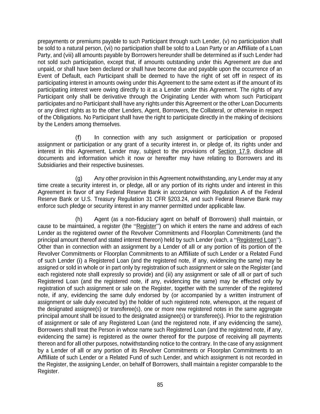 85 prepayments or premiums payable to such Participant through such Lender, (v) no participation shall be sold to a natural person, (vi) no participation shall be sold to a Loan Party or an Affiliate of a Loan Party, and (vii) all amounts payable by Borrowers hereunder shall be determined as if such Lender had not sold such participation, except that, if amounts outstanding under this Agreement are due and unpaid, or shall have been declared or shall have become due and payable upon the occurrence of an Event of Default, each Participant shall be deemed to have the right of set off in respect of its participating interest in amounts owing under this Agreement to the same extent as if the amount of its participating interest were owing directly to it as a Lender under this Agreement. The rights of any Participant only shall be derivative through the Originating Lender with whom such Participant participates and no Participant shall have any rights under this Agreement or the other Loan Documents or any direct rights as to the other Lenders, Agent, Borrowers, the Collateral, or otherwise in respect of the Obligations. No Participant shall have the right to participate directly in the making of decisions by the Lenders among themselves. (f) In connection with any such assignment or participation or proposed assignment or participation or any grant of a security interest in, or pledge of, its rights under and interest in this Agreement, Lender may, subject to the provisions of Section 17.9, disclose all documents and information which it now or hereafter may have relating to Borrowers and its Subsidiaries and their respective businesses. (g) Any other provision in this Agreement notwithstanding, any Lender may at any time create a security interest in, or pledge, all or any portion of its rights under and interest in this Agreement in favor of any Federal Reserve Bank in accordance with Regulation A of the Federal Reserve Bank or U.S. Treasury Regulation 31 CFR §203.24, and such Federal Reserve Bank may enforce such pledge or security interest in any manner permitted under applicable law. (h) Agent (as a non-fiduciary agent on behalf of Borrowers) shall maintain, or cause to be maintained, a register (the “Register”) on which it enters the name and address of each Lender as the registered owner of the Revolver Commitments and Floorplan Commitments (and the principal amount thereof and stated interest thereon) held by such Lender (each, a “Registered Loan”). Other than in connection with an assignment by a Lender of all or any portion of its portion of the Revolver Commitments or Floorplan Commitments to an Affiliate of such Lender or a Related Fund of such Lender (i) a Registered Loan (and the registered note, if any, evidencing the same) may be assigned or sold in whole or in part only by registration of such assignment or sale on the Register (and each registered note shall expressly so provide) and (ii) any assignment or sale of all or part of such Registered Loan (and the registered note, if any, evidencing the same) may be effected only by registration of such assignment or sale on the Register, together with the surrender of the registered note, if any, evidencing the same duly endorsed by (or accompanied by a written instrument of assignment or sale duly executed by) the holder of such registered note, whereupon, at the request of the designated assignee(s) or transferee(s), one or more new registered notes in the same aggregate principal amount shall be issued to the designated assignee(s) or transferee(s). Prior to the registration of assignment or sale of any Registered Loan (and the registered note, if any evidencing the same), Borrowers shall treat the Person in whose name such Registered Loan (and the registered note, if any, evidencing the same) is registered as the owner thereof for the purpose of receiving all payments thereon and for all other purposes, notwithstanding notice to the contrary. In the case of any assignment by a Lender of all or any portion of its Revolver Commitments or Floorplan Commitments to an Affiliate of such Lender or a Related Fund of such Lender, and which assignment is not recorded in the Register, the assigning Lender, on behalf of Borrowers, shall maintain a register comparable to the Register.