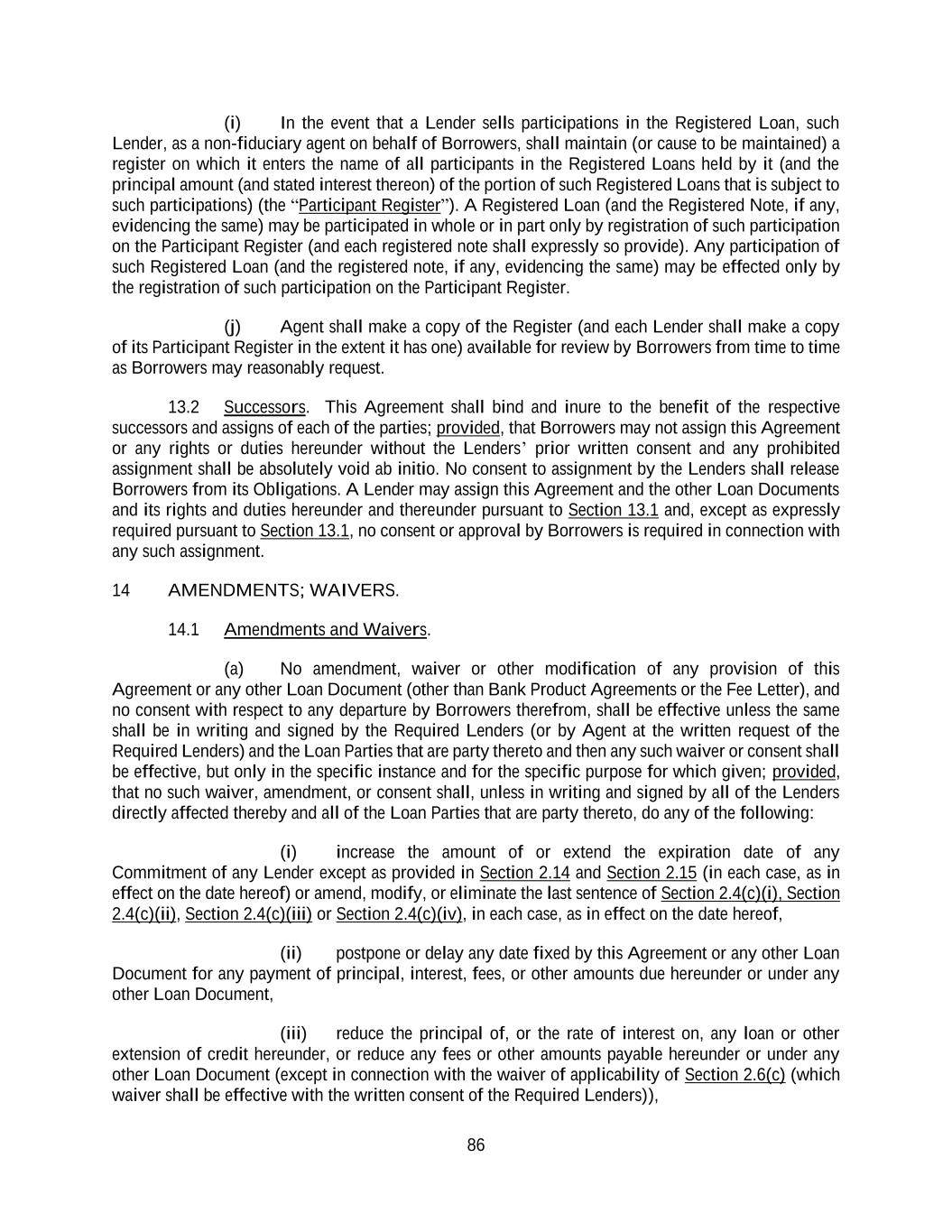 86 (i) In the event that a Lender sells participations in the Registered Loan, such Lender, as a non-fiduciary agent on behalf of Borrowers, shall maintain (or cause to be maintained) a register on which it enters the name of all participants in the Registered Loans held by it (and the principal amount (and stated interest thereon) of the portion of such Registered Loans that is subject to such participations) (the “Participant Register”). A Registered Loan (and the Registered Note, if any, evidencing the same) may be participated in whole or in part only by registration of such participation on the Participant Register (and each registered note shall expressly so provide). Any participation of such Registered Loan (and the registered note, if any, evidencing the same) may be effected only by the registration of such participation on the Participant Register. (j) Agent shall make a copy of the Register (and each Lender shall make a copy of its Participant Register in the extent it has one) available for review by Borrowers from time to time as Borrowers may reasonably request. 13.2 Successors. This Agreement shall bind and inure to the benefit of the respective successors and assigns of each of the parties; provided, that Borrowers may not assign this Agreement or any rights or duties hereunder without the Lenders’ prior written consent and any prohibited assignment shall be absolutely void ab initio. No consent to assignment by the Lenders shall release Borrowers from its Obligations. A Lender may assign this Agreement and the other Loan Documents and its rights and duties hereunder and thereunder pursuant to Section 13.1 and, except as expressly required pursuant to Section 13.1, no consent or approval by Borrowers is required in connection with any such assignment. 14 AMENDMENTS; WAIVERS. 14.1 Amendments and Waivers. (a) No amendment, waiver or other modification of any provision of this Agreement or any other Loan Document (other than Bank Product Agreements or the Fee Letter), and no consent with respect to any departure by Borrowers therefrom, shall be effective unless the same shall be in writing and signed by the Required Lenders (or by Agent at the written request of the Required Lenders) and the Loan Parties that are party thereto and then any such waiver or consent shall be effective, but only in the specific instance and for the specific purpose for which given; provided, that no such waiver, amendment, or consent shall, unless in writing and signed by all of the Lenders directly affected thereby and all of the Loan Parties that are party thereto, do any of the following: (i) increase the amount of or extend the expiration date of any Commitment of any Lender except as provided in Section 2.14 and Section 2.15 (in each case, as in effect on the date hereof) or amend, modify, or eliminate the last sentence of Section 2.4(c)(i), Section 2.4(c)(ii), Section 2.4(c)(iii) or Section 2.4(c)(iv), in each case, as in effect on the date hereof, (ii) postpone or delay any date fixed by this Agreement or any other Loan Document for any payment of principal, interest, fees, or other amounts due hereunder or under any other Loan Document, (iii) reduce the principal of, or the rate of interest on, any loan or other extension of credit hereunder, or reduce any fees or other amounts payable hereunder or under any other Loan Document (except in connection with the waiver of applicability of Section 2.6(c) (which waiver shall be effective with the written consent of the Required Lenders)),