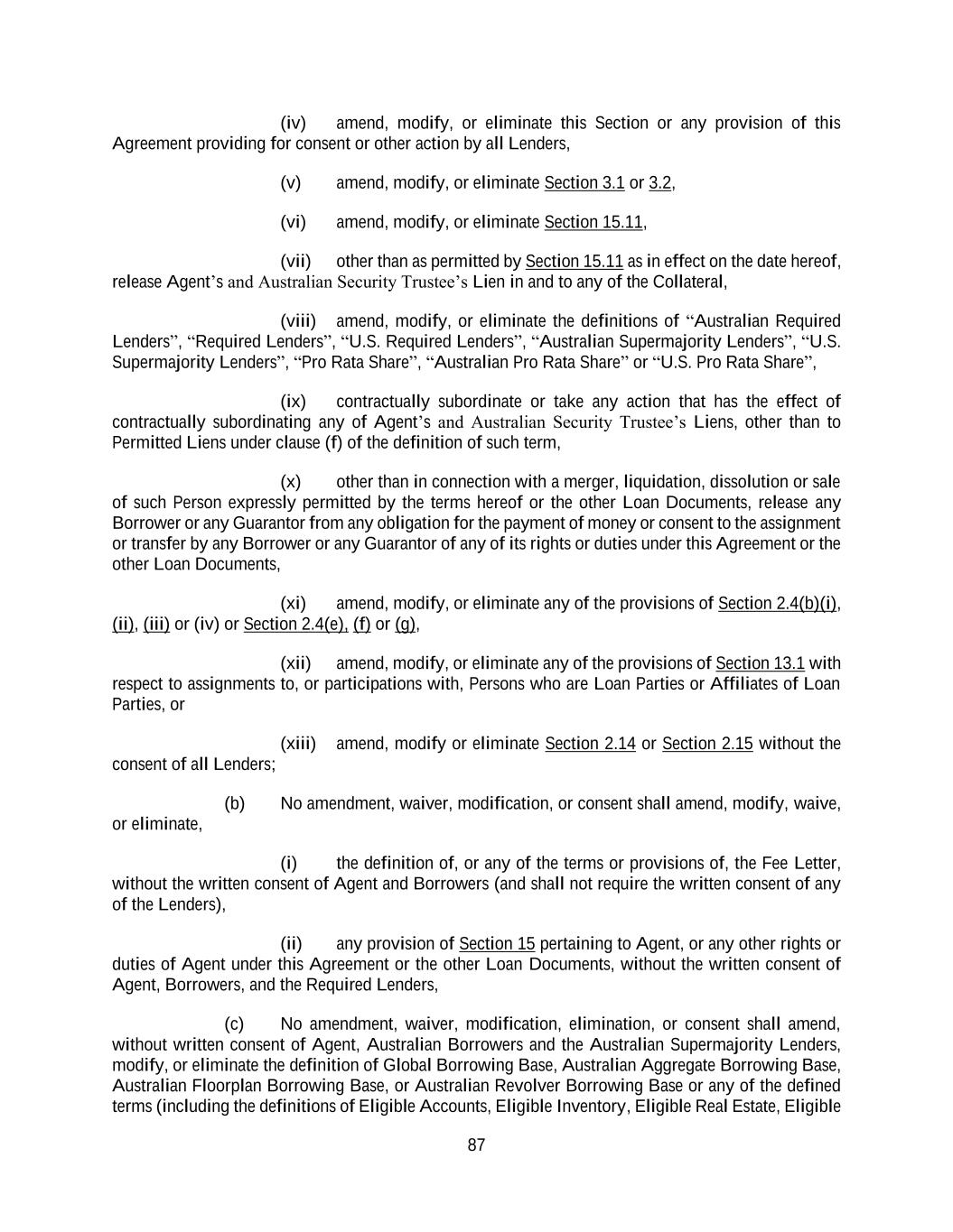 87 (iv) amend, modify, or eliminate this Section or any provision of this Agreement providing for consent or other action by all Lenders, (v) amend, modify, or eliminate Section 3.1 or 3.2, (vi) amend, modify, or eliminate Section 15.11, (vii) other than as permitted by Section 15.11 as in effect on the date hereof, release Agent’s and Australian Security Trustee’s Lien in and to any of the Collateral, (viii) amend, modify, or eliminate the definitions of “Australian Required Lenders”, “Required Lenders”, “U.S. Required Lenders”, “Australian Supermajority Lenders”, “U.S. Supermajority Lenders”, “Pro Rata Share”, “Australian Pro Rata Share” or “U.S. Pro Rata Share”, (ix) contractually subordinate or take any action that has the effect of contractually subordinating any of Agent’s and Australian Security Trustee’s Liens, other than to Permitted Liens under clause (f) of the definition of such term, (x) other than in connection with a merger, liquidation, dissolution or sale of such Person expressly permitted by the terms hereof or the other Loan Documents, release any Borrower or any Guarantor from any obligation for the payment of money or consent to the assignment or transfer by any Borrower or any Guarantor of any of its rights or duties under this Agreement or the other Loan Documents, (xi) amend, modify, or eliminate any of the provisions of Section 2.4(b)(i), (ii), (iii) or (iv) or Section 2.4(e), (f) or (g), (xii) amend, modify, or eliminate any of the provisions of Section 13.1 with respect to assignments to, or participations with, Persons who are Loan Parties or Affiliates of Loan Parties, or (xiii) amend, modify or eliminate Section 2.14 or Section 2.15 without the consent of all Lenders; (b) No amendment, waiver, modification, or consent shall amend, modify, waive, or eliminate, (i) the definition of, or any of the terms or provisions of, the Fee Letter, without the written consent of Agent and Borrowers (and shall not require the written consent of any of the Lenders), (ii) any provision of Section 15 pertaining to Agent, or any other rights or duties of Agent under this Agreement or the other Loan Documents, without the written consent of Agent, Borrowers, and the Required Lenders, (c) No amendment, waiver, modification, elimination, or consent shall amend, without written consent of Agent, Australian Borrowers and the Australian Supermajority Lenders, modify, or eliminate the definition of Global Borrowing Base, Australian Aggregate Borrowing Base, Australian Floorplan Borrowing Base, or Australian Revolver Borrowing Base or any of the defined terms (including the definitions of Eligible Accounts, Eligible Inventory, Eligible Real Estate, Eligible