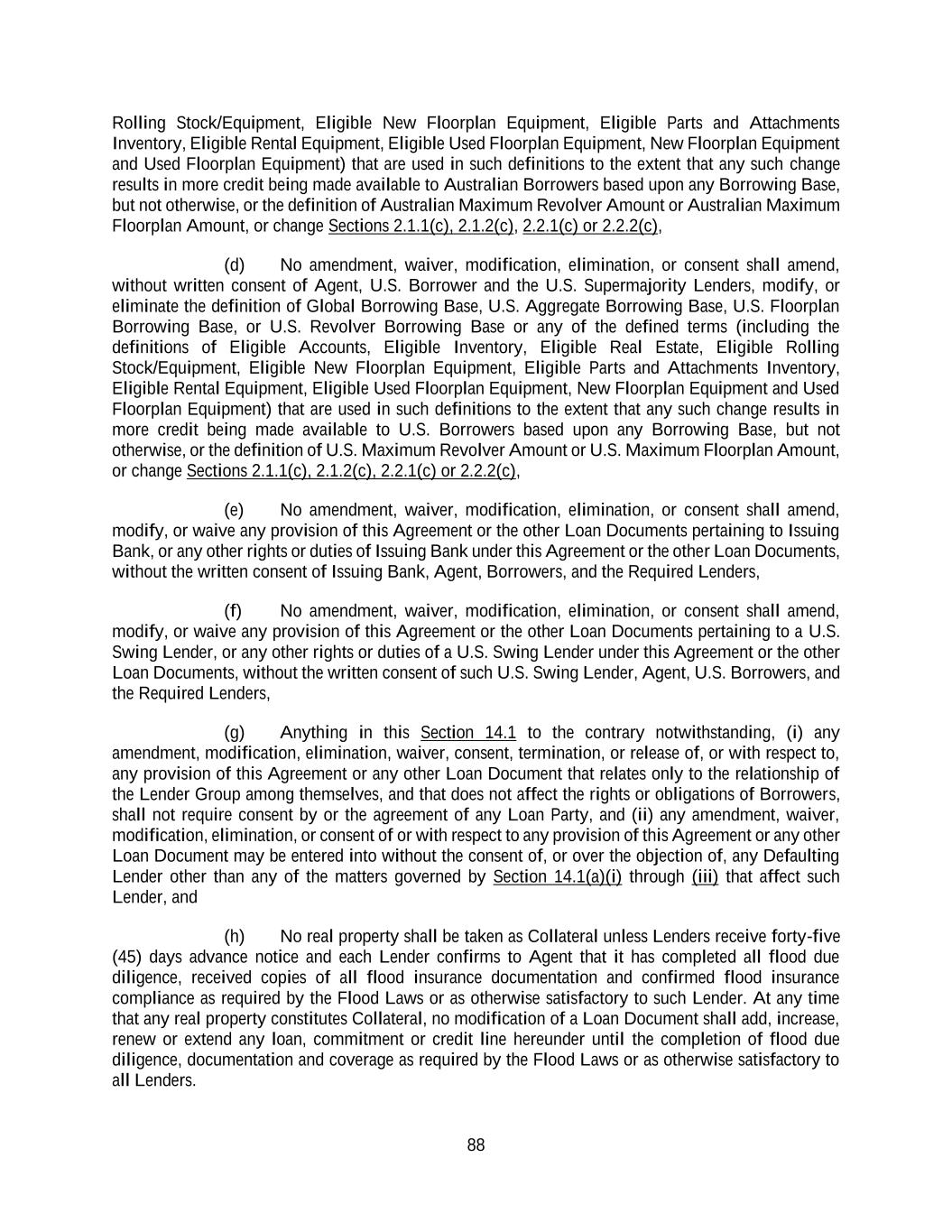 88 Rolling Stock/Equipment, Eligible New Floorplan Equipment, Eligible Parts and Attachments Inventory, Eligible Rental Equipment, Eligible Used Floorplan Equipment, New Floorplan Equipment and Used Floorplan Equipment) that are used in such definitions to the extent that any such change results in more credit being made available to Australian Borrowers based upon any Borrowing Base, but not otherwise, or the definition of Australian Maximum Revolver Amount or Australian Maximum Floorplan Amount, or change Sections 2.1.1(c), 2.1.2(c), 2.2.1(c) or 2.2.2(c), (d) No amendment, waiver, modification, elimination, or consent shall amend, without written consent of Agent, U.S. Borrower and the U.S. Supermajority Lenders, modify, or eliminate the definition of Global Borrowing Base, U.S. Aggregate Borrowing Base, U.S. Floorplan Borrowing Base, or U.S. Revolver Borrowing Base or any of the defined terms (including the definitions of Eligible Accounts, Eligible Inventory, Eligible Real Estate, Eligible Rolling Stock/Equipment, Eligible New Floorplan Equipment, Eligible Parts and Attachments Inventory, Eligible Rental Equipment, Eligible Used Floorplan Equipment, New Floorplan Equipment and Used Floorplan Equipment) that are used in such definitions to the extent that any such change results in more credit being made available to U.S. Borrowers based upon any Borrowing Base, but not otherwise, or the definition of U.S. Maximum Revolver Amount or U.S. Maximum Floorplan Amount, or change Sections 2.1.1(c), 2.1.2(c), 2.2.1(c) or 2.2.2(c), (e) No amendment, waiver, modification, elimination, or consent shall amend, modify, or waive any provision of this Agreement or the other Loan Documents pertaining to Issuing Bank, or any other rights or duties of Issuing Bank under this Agreement or the other Loan Documents, without the written consent of Issuing Bank, Agent, Borrowers, and the Required Lenders, (f) No amendment, waiver, modification, elimination, or consent shall amend, modify, or waive any provision of this Agreement or the other Loan Documents pertaining to a U.S. Swing Lender, or any other rights or duties of a U.S. Swing Lender under this Agreement or the other Loan Documents, without the written consent of such U.S. Swing Lender, Agent, U.S. Borrowers, and the Required Lenders, (g) Anything in this Section 14.1 to the contrary notwithstanding, (i) any amendment, modification, elimination, waiver, consent, termination, or release of, or with respect to, any provision of this Agreement or any other Loan Document that relates only to the relationship of the Lender Group among themselves, and that does not affect the rights or obligations of Borrowers, shall not require consent by or the agreement of any Loan Party, and (ii) any amendment, waiver, modification, elimination, or consent of or with respect to any provision of this Agreement or any other Loan Document may be entered into without the consent of, or over the objection of, any Defaulting Lender other than any of the matters governed by Section 14.1(a)(i) through (iii) that affect such Lender, and (h) No real property shall be taken as Collateral unless Lenders receive forty-five (45) days advance notice and each Lender confirms to Agent that it has completed all flood due diligence, received copies of all flood insurance documentation and confirmed flood insurance compliance as required by the Flood Laws or as otherwise satisfactory to such Lender. At any time that any real property constitutes Collateral, no modification of a Loan Document shall add, increase, renew or extend any loan, commitment or credit line hereunder until the completion of flood due diligence, documentation and coverage as required by the Flood Laws or as otherwise satisfactory to all Lenders.