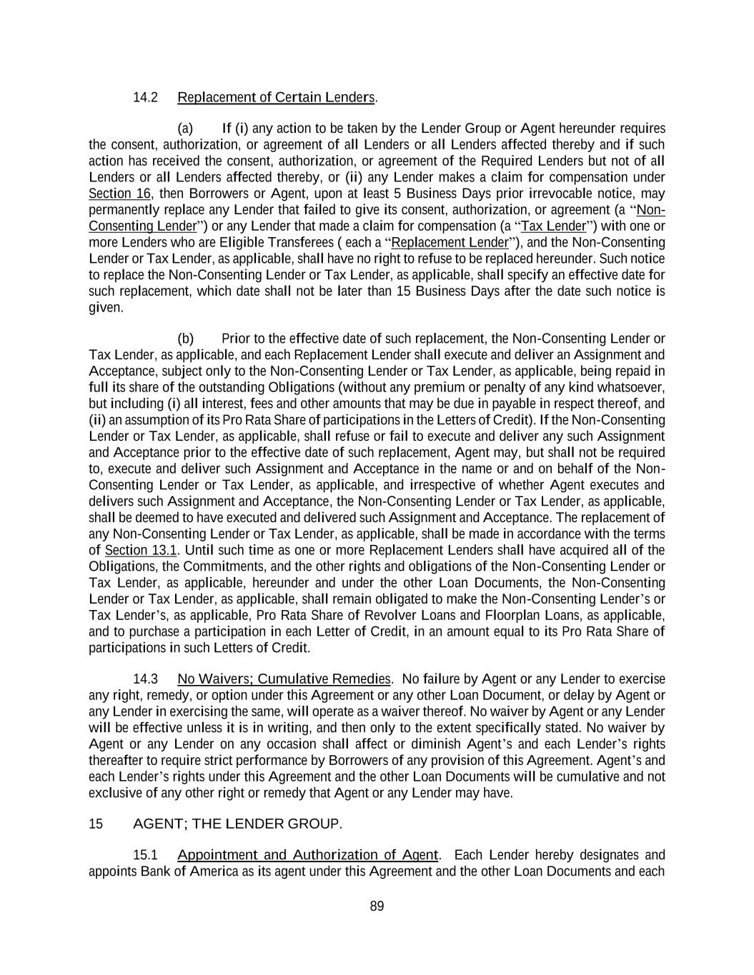 89 14.2 Replacement of Certain Lenders. (a) If (i) any action to be taken by the Lender Group or Agent hereunder requires the consent, authorization, or agreement of all Lenders or all Lenders affected thereby and if such action has received the consent, authorization, or agreement of the Required Lenders but not of all Lenders or all Lenders affected thereby, or (ii) any Lender makes a claim for compensation under Section 16, then Borrowers or Agent, upon at least 5 Business Days prior irrevocable notice, may permanently replace any Lender that failed to give its consent, authorization, or agreement (a “Non- Consenting Lender”) or any Lender that made a claim for compensation (a “Tax Lender”) with one or more Lenders who are Eligible Transferees ( each a “Replacement Lender”), and the Non-Consenting Lender or Tax Lender, as applicable, shall have no right to refuse to be replaced hereunder. Such notice to replace the Non-Consenting Lender or Tax Lender, as applicable, shall specify an effective date for such replacement, which date shall not be later than 15 Business Days after the date such notice is given. (b) Prior to the effective date of such replacement, the Non-Consenting Lender or Tax Lender, as applicable, and each Replacement Lender shall execute and deliver an Assignment and Acceptance, subject only to the Non-Consenting Lender or Tax Lender, as applicable, being repaid in full its share of the outstanding Obligations (without any premium or penalty of any kind whatsoever, but including (i) all interest, fees and other amounts that may be due in payable in respect thereof, and (ii) an assumption of its Pro Rata Share of participations in the Letters of Credit). If the Non-Consenting Lender or Tax Lender, as applicable, shall refuse or fail to execute and deliver any such Assignment and Acceptance prior to the effective date of such replacement, Agent may, but shall not be required to, execute and deliver such Assignment and Acceptance in the name or and on behalf of the Non- Consenting Lender or Tax Lender, as applicable, and irrespective of whether Agent executes and delivers such Assignment and Acceptance, the Non-Consenting Lender or Tax Lender, as applicable, shall be deemed to have executed and delivered such Assignment and Acceptance. The replacement of any Non-Consenting Lender or Tax Lender, as applicable, shall be made in accordance with the terms of Section 13.1. Until such time as one or more Replacement Lenders shall have acquired all of the Obligations, the Commitments, and the other rights and obligations of the Non-Consenting Lender or Tax Lender, as applicable, hereunder and under the other Loan Documents, the Non-Consenting Lender or Tax Lender, as applicable, shall remain obligated to make the Non-Consenting Lender’s or Tax Lender’s, as applicable, Pro Rata Share of Revolver Loans and Floorplan Loans, as applicable, and to purchase a participation in each Letter of Credit, in an amount equal to its Pro Rata Share of participations in such Letters of Credit. 14.3 No Waivers; Cumulative Remedies. No failure by Agent or any Lender to exercise any right, remedy, or option under this Agreement or any other Loan Document, or delay by Agent or any Lender in exercising the same, will operate as a waiver thereof. No waiver by Agent or any Lender will be effective unless it is in writing, and then only to the extent specifically stated. No waiver by Agent or any Lender on any occasion shall affect or diminish Agent’s and each Lender’s rights thereafter to require strict performance by Borrowers of any provision of this Agreement. Agent’s and each Lender’s rights under this Agreement and the other Loan Documents will be cumulative and not exclusive of any other right or remedy that Agent or any Lender may have. 15 AGENT; THE LENDER GROUP. 15.1 Appointment and Authorization of Agent. Each Lender hereby designates and appoints Bank of America as its agent under this Agreement and the other Loan Documents and each