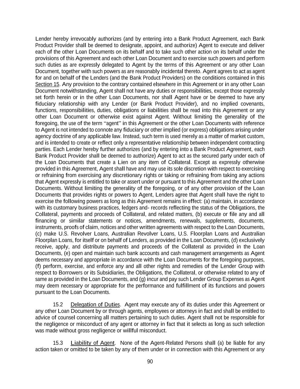 90 Lender hereby irrevocably authorizes (and by entering into a Bank Product Agreement, each Bank Product Provider shall be deemed to designate, appoint, and authorize) Agent to execute and deliver each of the other Loan Documents on its behalf and to take such other action on its behalf under the provisions of this Agreement and each other Loan Document and to exercise such powers and perform such duties as are expressly delegated to Agent by the terms of this Agreement or any other Loan Document, together with such powers as are reasonably incidental thereto. Agent agrees to act as agent for and on behalf of the Lenders (and the Bank Product Providers) on the conditions contained in this Section 15. Any provision to the contrary contained elsewhere in this Agreement or in any other Loan Document notwithstanding, Agent shall not have any duties or responsibilities, except those expressly set forth herein or in the other Loan Documents, nor shall Agent have or be deemed to have any fiduciary relationship with any Lender (or Bank Product Provider), and no implied covenants, functions, responsibilities, duties, obligations or liabilities shall be read into this Agreement or any other Loan Document or otherwise exist against Agent. Without limiting the generality of the foregoing, the use of the term “agent” in this Agreement or the other Loan Documents with reference to Agent is not intended to connote any fiduciary or other implied (or express) obligations arising under agency doctrine of any applicable law. Instead, such term is used merely as a matter of market custom, and is intended to create or reflect only a representative relationship between independent contracting parties. Each Lender hereby further authorizes (and by entering into a Bank Product Agreement, each Bank Product Provider shall be deemed to authorize) Agent to act as the secured party under each of the Loan Documents that create a Lien on any item of Collateral. Except as expressly otherwise provided in this Agreement, Agent shall have and may use its sole discretion with respect to exercising or refraining from exercising any discretionary rights or taking or refraining from taking any actions that Agent expressly is entitled to take or assert under or pursuant to this Agreement and the other Loan Documents. Without limiting the generality of the foregoing, or of any other provision of the Loan Documents that provides rights or powers to Agent, Lenders agree that Agent shall have the right to exercise the following powers as long as this Agreement remains in effect: (a) maintain, in accordance with its customary business practices, ledgers and- records reflecting the status of the Obligations, the Collateral, payments and proceeds of Collateral, and related matters, (b) execute or file any and all financing or similar statements or notices, amendments, renewals, supplements, documents, instruments, proofs of claim, notices and other written agreements with respect to the Loan Documents, (c) make U.S. Revolver Loans, Australian Revolver Loans, U.S. Floorplan Loans and Australian Floorplan Loans, for itself or on behalf of Lenders, as provided in the Loan Documents, (d) exclusively receive, apply, and distribute payments and proceeds of the Collateral as provided in the Loan Documents, (e) open and maintain such bank accounts and cash management arrangements as Agent deems necessary and appropriate in accordance with the Loan Documents for the foregoing purposes, (f) perform, exercise, and enforce any and all other rights and remedies of the Lender Group with respect to Borrowers or its Subsidiaries, the Obligations, the Collateral, or otherwise related to any of same as provided in the Loan Documents, and (g) incur and pay such Lender Group Expenses as Agent may deem necessary or appropriate for the performance and fulfillment of its functions and powers pursuant to the Loan Documents. 15.2 Delegation of Duties. Agent may execute any of its duties under this Agreement or any other Loan Document by or through agents, employees or attorneys in fact and shall be entitled to advice of counsel concerning all matters pertaining to such duties. Agent shall not be responsible for the negligence or misconduct of any agent or attorney in fact that it selects as long as such selection was made without gross negligence or willful misconduct. 15.3 Liability of Agent. None of the Agent-Related Persons shall (a) be liable for any action taken or omitted to be taken by any of them under or in connection with this Agreement or any