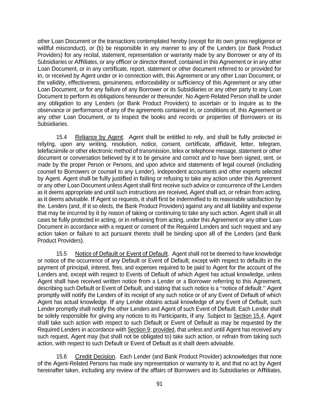 91 other Loan Document or the transactions contemplated hereby (except for its own gross negligence or willful misconduct), or (b) be responsible in any manner to any of the Lenders (or Bank Product Providers) for any recital, statement, representation or warranty made by any Borrower or any of its Subsidiaries or Affiliates, or any officer or director thereof, contained in this Agreement or in any other Loan Document, or in any certificate, report, statement or other document referred to or provided for in, or received by Agent under or in connection with, this Agreement or any other Loan Document, or the validity, effectiveness, genuineness, enforceability or sufficiency of this Agreement or any other Loan Document, or for any failure of any Borrower or its Subsidiaries or any other party to any Loan Document to perform its obligations hereunder or thereunder. No Agent-Related Person shall be under any obligation to any Lenders (or Bank Product Providers) to ascertain or to inquire as to the observance or performance of any of the agreements contained in, or conditions of, this Agreement or any other Loan Document, or to inspect the books and records or properties of Borrowers or its Subsidiaries. 15.4 Reliance by Agent. Agent shall be entitled to rely, and shall be fully protected in relying, upon any writing, resolution, notice, consent, certificate, affidavit, letter, telegram, telefacsimile or other electronic method of transmission, telex or telephone message, statement or other document or conversation believed by it to be genuine and correct and to have been signed, sent, or made by the proper Person or Persons, and upon advice and statements of legal counsel (including counsel to Borrowers or counsel to any Lender), independent accountants and other experts selected by Agent. Agent shall be fully justified in failing or refusing to take any action under this Agreement or any other Loan Document unless Agent shall first receive such advice or concurrence of the Lenders as it deems appropriate and until such instructions are received, Agent shall act, or refrain from acting, as it deems advisable. If Agent so requests, it shall first be indemnified to its reasonable satisfaction by the. Lenders (and, if it so elects, the Bank Product Providers) against any and all liability and expense that may be incurred by it by reason of taking or continuing to take any such action. Agent shall in all cases be fully protected in acting, or in refraining from acting, under this Agreement or any other Loan Document in accordance with a request or consent of the Required Lenders and such request and any action taken or failure to act pursuant thereto shall be binding upon all of the Lenders (and Bank Product Providers). 15.5 Notice of Default or Event of Default. Agent shall not be deemed to have knowledge or notice of the occurrence of any Default or Event of Default, except with respect to defaults in the payment of principal, interest, fees, and expenses required to be paid to Agent for the account of the Lenders and, except with respect to Events of Default of which Agent has actual knowledge, unless Agent shall have received written notice from a Lender or a Borrower referring to this Agreement, describing such Default or Event of Default, and stating that such notice is a “notice of default.” Agent promptly will notify the Lenders of its receipt of any such notice or of any Event of Default of which Agent has actual knowledge. If any Lender obtains actual knowledge of any Event of Default, such Lender promptly shall notify the other Lenders and Agent of such Event of Default. Each Lender shall be solely responsible for giving any notices to its Participants, if any. Subject to Section 15.4, Agent shall take such action with respect to such Default or Event of Default as may be requested by the Required Lenders in accordance with Section 9; provided, that unless and until Agent has received any such request, Agent may (but shall not be obligated to) take such action, or refrain from taking such action, with respect to such Default or Event of Default as it shall deem advisable. 15.6 Credit Decision. Each Lender (and Bank Product Provider) acknowledges that none of the Agent-Related Persons has made any representation or warranty to it, and that no act by Agent hereinafter taken, including any review of the affairs of Borrowers and its Subsidiaries or Affiliates,