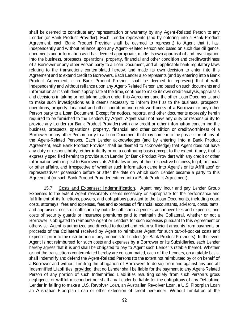 92 shall be deemed to constitute any representation or warranty by any Agent-Related Person to any Lender (or Bank Product Provider). Each Lender represents (and by entering into a Bank Product Agreement, each Bank Product Provider shall be deemed to represent) to Agent that it has, independently and without reliance upon any Agent-Related Person and based on such due diligence, documents and information as it has deemed appropriate, made its own appraisal of and investigation into the business, prospects, operations, property, financial and other condition and creditworthiness of a Borrower or any other Person party to a Loan Document, and all applicable bank regulatory laws relating to the transactions contemplated hereby, and made its own decision to enter into this Agreement and to extend credit to Borrowers. Each Lender also represents (and by entering into a Bank Product Agreement, each Bank Product Provider shall be deemed to represent) that it will, independently and without reliance upon any Agent-Related Person and based on such documents and information as it shall deem appropriate at the time, continue to make its own credit analysis, appraisals and decisions in taking or not taking action under this Agreement and the other Loan Documents, and to make such investigations as it deems necessary to inform itself as to the business, prospects, operations, property, financial and other condition and creditworthiness of a Borrower or any other Person party to a Loan Document. Except for notices, reports, and other documents expressly herein required to be furnished to the Lenders by Agent, Agent shall not have any duty or responsibility to provide any Lender (or Bank Product Provider) with any credit or other information concerning the business, prospects, operations, property, financial and other condition or creditworthiness of a Borrower or any other Person party to a Loan Document that may come into the possession of any of the Agent-Related Persons. Each Lender acknowledges (and by entering into a Bank Product Agreement, each Bank Product Provider shall be deemed to acknowledge) that Agent does not have any duty or responsibility, either initially or on a continuing basis (except to the extent, if any, that is expressly specified herein) to provide such Lender (or Bank Product Provider) with any credit or other information with respect to Borrowers, its Affiliates or any of their respective business, legal, financial or other affairs, and irrespective of whether such information came into Agent’s or its Affiliates’ or representatives’ possession before or after the date on which such Lender became a party to this Agreement (or such Bank Product Provider entered into a Bank Product Agreement). 15.7 Costs and Expenses; Indemnification. Agent may incur and pay Lender Group Expenses to the extent Agent reasonably deems necessary or appropriate for the performance and fulfillment of its functions, powers, and obligations pursuant to the Loan Documents, including court costs, attorneys’ fees and expenses, fees and expenses of financial accountants, advisors, consultants, and appraisers, costs of collection by outside collection agencies, auctioneer fees and expenses, and costs of security guards or insurance premiums paid to maintain the Collateral, whether or not a Borrower is obligated to reimburse Agent or Lenders for such expenses pursuant to this Agreement or otherwise. Agent is authorized and directed to deduct and retain sufficient amounts from payments or proceeds of the Collateral received by Agent to reimburse Agent for such out-of-pocket costs and expenses prior to the distribution of any amounts to Lenders (or Bank Product Providers). In the event Agent is not reimbursed for such costs and expenses by a Borrower or its Subsidiaries, each Lender hereby agrees that it is and shall be obligated to pay to Agent such Lender’s ratable thereof. Whether or not the transactions contemplated hereby are consummated, each of the Lenders, on a ratable basis, shall indemnify and defend the Agent-Related Persons (to the extent not reimbursed by or on behalf of a Borrower and without limiting the obligation of Borrowers to do so) from and against any and all Indemnified Liabilities; provided, that no Lender shall be liable for the payment to any Agent-Related Person of any portion of such Indemnified Liabilities resulting solely from such Person’s gross negligence or willful misconduct nor shall any Lender be liable for the obligations of any Defaulting Lender in failing to make a U.S. Revolver Loan, an Australian Revolver Loan, a U.S. Floorplan Loan an Australian Floorplan Loan or other extension of credit hereunder. Without limitation of the