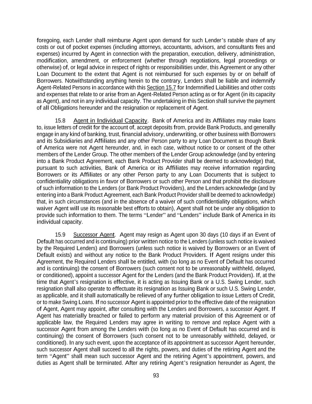 93 foregoing, each Lender shall reimburse Agent upon demand for such Lender’s ratable share of any costs or out of pocket expenses (including attorneys, accountants, advisors, and consultants fees and expenses) incurred by Agent in connection with the preparation, execution, delivery, administration, modification, amendment, or enforcement (whether through negotiations, legal proceedings or otherwise) of, or legal advice in respect of rights or responsibilities under, this Agreement or any other Loan Document to the extent that Agent is not reimbursed for such expenses by or on behalf of Borrowers. Notwithstanding anything herein to the contrary, Lenders shall be liable and indemnify Agent-Related Persons in accordance with this Section 15.7 for Indemnified Liabilities and other costs and expenses that relate to or arise from an Agent-Related Person acting as or for Agent (in its capacity as Agent), and not in any individual capacity. The undertaking in this Section shall survive the payment of all Obligations hereunder and the resignation or replacement of Agent. 15.8 Agent in Individual Capacity. Bank of America and its Affiliates may make loans to, issue letters of credit for the account of, accept deposits from, provide Bank Products, and generally engage in any kind of banking, trust, financial advisory, underwriting, or other business with Borrowers and its Subsidiaries and Affiliates and any other Person party to any Loan Document as though Bank of America were not Agent hereunder, and, in each case, without notice to or consent of the other members of the Lender Group. The other members of the Lender Group acknowledge (and by entering into a Bank Product Agreement, each Bank Product Provider shall be deemed to acknowledge) that, pursuant to such activities, Bank of America or its Affiliates may receive information regarding Borrowers or its Affiliates or any other Person party to any Loan Documents that is subject to confidentiality obligations in favor of Borrowers or such other Person and that prohibit the disclosure of such information to the Lenders (or Bank Product Providers), and the Lenders acknowledge (and by entering into a Bank Product Agreement, each Bank Product Provider shall be deemed to acknowledge) that, in such circumstances (and in the absence of a waiver of such confidentiality obligations, which waiver Agent will use its reasonable best efforts to obtain), Agent shall not be under any obligation to provide such information to them. The terms “Lender” and “Lenders” include Bank of America in its individual capacity. 15.9 Successor Agent. Agent may resign as Agent upon 30 days (10 days if an Event of Default has occurred and is continuing) prior written notice to the Lenders (unless such notice is waived by the Required Lenders) and Borrowers (unless such notice is waived by Borrowers or an Event of Default exists) and without any notice to the Bank Product Providers. If Agent resigns under this Agreement, the Required Lenders shall be entitled, with (so long as no Event of Default has occurred and is continuing) the consent of Borrowers (such consent not to be unreasonably withheld, delayed, or conditioned), appoint a successor Agent for the Lenders (and the Bank Product Providers). If, at the time that Agent’s resignation is effective, it is acting as Issuing Bank or a U.S. Swing Lender, such resignation shall also operate to effectuate its resignation as Issuing Bank or such U.S. Swing Lender, as applicable, and it shall automatically be relieved of any further obligation to issue Letters of Credit, or to make Swing Loans. If no successor Agent is appointed prior to the effective date of the resignation of Agent, Agent may appoint, after consulting with the Lenders and Borrowers, a successor Agent. If Agent has materially breached or failed to perform any material provision of this Agreement or of applicable law, the Required Lenders may agree in writing to remove and replace Agent with a successor Agent from among the Lenders with (so long as no Event of Default has occurred and is continuing) the consent of Borrowers (such consent not to be unreasonably withheld, delayed, or conditioned). In any such event, upon the acceptance of its appointment as successor Agent hereunder, such successor Agent shall succeed to all the rights, powers, and duties of the retiring Agent and the term “Agent” shall mean such successor Agent and the retiring Agent’s appointment, powers, and duties as Agent shall be terminated. After any retiring Agent’s resignation hereunder as Agent, the