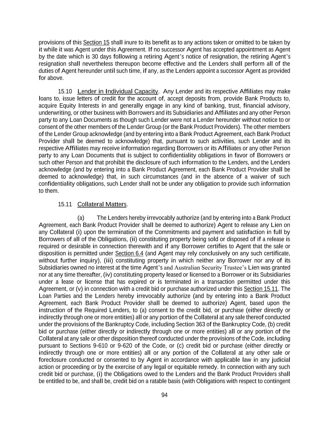94 provisions of this Section 15 shall inure to its benefit as to any actions taken or omitted to be taken by it while it was Agent under this Agreement. If no successor Agent has accepted appointment as Agent by the date which is 30 days following a retiring Agent’s notice of resignation, the retiring Agent’s resignation shall nevertheless thereupon become effective and the Lenders shall perform all of the duties of Agent hereunder until such time, if any, as the Lenders appoint a successor Agent as provided for above. 15.10 Lender in Individual Capacity. Any Lender and its respective Affiliates may make loans to, issue letters of credit for the account of, accept deposits from, provide Bank Products to, acquire Equity Interests in and generally engage in any kind of banking, trust, financial advisory, underwriting, or other business with Borrowers and its Subsidiaries and Affiliates and any other Person party to any Loan Documents as though such Lender were not a Lender hereunder without notice to or consent of the other members of the Lender Group (or the Bank Product Providers). The other members of the Lender Group acknowledge (and by entering into a Bank Product Agreement, each Bank Product Provider shall be deemed to acknowledge) that, pursuant to such activities, such Lender and its respective Affiliates may receive information regarding Borrowers or its Affiliates or any other Person party to any Loan Documents that is subject to confidentiality obligations in favor of Borrowers or such other Person and that prohibit the disclosure of such information to the Lenders, and the Lenders acknowledge (and by entering into a Bank Product Agreement, each Bank Product Provider shall be deemed to acknowledge) that, in such circumstances (and in the absence of a waiver of such confidentiality obligations, such Lender shall not be under any obligation to provide such information to them. 15.11 Collateral Matters. (a) The Lenders hereby irrevocably authorize (and by entering into a Bank Product Agreement, each Bank Product Provider shall be deemed to authorize) Agent to release any Lien on any Collateral (i) upon the termination of the Commitments and payment and satisfaction in full by Borrowers of all of the Obligations, (ii) constituting property being sold or disposed of if a release is required or desirable in connection therewith and if any Borrower certifies to Agent that the sale or disposition is permitted under Section 6.4 (and Agent may rely conclusively on any such certificate, without further inquiry), (iii) constituting property in which neither any Borrower nor any of its Subsidiaries owned no interest at the time Agent’s and Australian Security Trustee’s Lien was granted nor at any time thereafter, (iv) constituting property leased or licensed to a Borrower or its Subsidiaries under a lease or license that has expired or is terminated in a transaction permitted under this Agreement, or (v) in connection with a credit bid or purchase authorized under this Section 15.11. The Loan Parties and the Lenders hereby irrevocably authorize (and by entering into a Bank Product Agreement, each Bank Product Provider shall be deemed to authorize) Agent, based upon the instruction of the Required Lenders, to (a) consent to the credit bid, or purchase (either directly or indirectly through one or more entities) all or any portion of the Collateral at any sale thereof conducted under the provisions of the Bankruptcy Code, including Section 363 of the Bankruptcy Code, (b) credit bid or purchase (either directly or indirectly through one or more entities) all or any portion of the Collateral at any sale or other disposition thereof conducted under the provisions of the Code, including pursuant to Sections 9-610 or 9-620 of the Code, or (c) credit bid or purchase (either directly or indirectly through one or more entities) all or any portion of the Collateral at any other sale or foreclosure conducted or consented to by Agent in accordance with applicable law in any judicial action or proceeding or by the exercise of any legal or equitable remedy. In connection with any such credit bid or purchase, (i) the Obligations owed to the Lenders and the Bank Product Providers shall be entitled to be, and shall be, credit bid on a ratable basis (with Obligations with respect to contingent