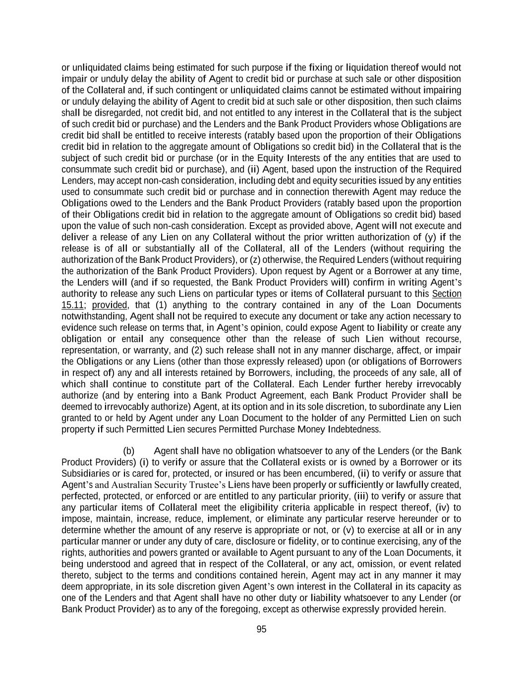 95 or unliquidated claims being estimated for such purpose if the fixing or liquidation thereof would not impair or unduly delay the ability of Agent to credit bid or purchase at such sale or other disposition of the Collateral and, if such contingent or unliquidated claims cannot be estimated without impairing or unduly delaying the ability of Agent to credit bid at such sale or other disposition, then such claims shall be disregarded, not credit bid, and not entitled to any interest in the Collateral that is the subject of such credit bid or purchase) and the Lenders and the Bank Product Providers whose Obligations are credit bid shall be entitled to receive interests (ratably based upon the proportion of their Obligations credit bid in relation to the aggregate amount of Obligations so credit bid) in the Collateral that is the subject of such credit bid or purchase (or in the Equity Interests of the any entities that are used to consummate such credit bid or purchase), and (ii) Agent, based upon the instruction of the Required Lenders, may accept non-cash consideration, including debt and equity securities issued by any entities used to consummate such credit bid or purchase and in connection therewith Agent may reduce the Obligations owed to the Lenders and the Bank Product Providers (ratably based upon the proportion of their Obligations credit bid in relation to the aggregate amount of Obligations so credit bid) based upon the value of such non-cash consideration. Except as provided above, Agent will not execute and deliver a release of any Lien on any Collateral without the prior written authorization of (y) if the release is of all or substantially all of the Collateral, all of the Lenders (without requiring the authorization of the Bank Product Providers), or (z) otherwise, the Required Lenders (without requiring the authorization of the Bank Product Providers). Upon request by Agent or a Borrower at any time, the Lenders will (and if so requested, the Bank Product Providers will) confirm in writing Agent’s authority to release any such Liens on particular types or items of Collateral pursuant to this Section 15.11; provided, that (1) anything to the contrary contained in any of the Loan Documents notwithstanding, Agent shall not be required to execute any document or take any action necessary to evidence such release on terms that, in Agent’s opinion, could expose Agent to liability or create any obligation or entail any consequence other than the release of such Lien without recourse, representation, or warranty, and (2) such release shall not in any manner discharge, affect, or impair the Obligations or any Liens (other than those expressly released) upon (or obligations of Borrowers in respect of) any and all interests retained by Borrowers, including, the proceeds of any sale, all of which shall continue to constitute part of the Collateral. Each Lender further hereby irrevocably authorize (and by entering into a Bank Product Agreement, each Bank Product Provider shall be deemed to irrevocably authorize) Agent, at its option and in its sole discretion, to subordinate any Lien granted to or held by Agent under any Loan Document to the holder of any Permitted Lien on such property if such Permitted Lien secures Permitted Purchase Money Indebtedness. (b) Agent shall have no obligation whatsoever to any of the Lenders (or the Bank Product Providers) (i) to verify or assure that the Collateral exists or is owned by a Borrower or its Subsidiaries or is cared for, protected, or insured or has been encumbered, (ii) to verify or assure that Agent’s and Australian Security Trustee’s Liens have been properly or sufficiently or lawfully created, perfected, protected, or enforced or are entitled to any particular priority, (iii) to verify or assure that any particular items of Collateral meet the eligibility criteria applicable in respect thereof, (iv) to impose, maintain, increase, reduce, implement, or eliminate any particular reserve hereunder or to determine whether the amount of any reserve is appropriate or not, or (v) to exercise at all or in any particular manner or under any duty of care, disclosure or fidelity, or to continue exercising, any of the rights, authorities and powers granted or available to Agent pursuant to any of the Loan Documents, it being understood and agreed that in respect of the Collateral, or any act, omission, or event related thereto, subject to the terms and conditions contained herein, Agent may act in any manner it may deem appropriate, in its sole discretion given Agent’s own interest in the Collateral in its capacity as one of the Lenders and that Agent shall have no other duty or liability whatsoever to any Lender (or Bank Product Provider) as to any of the foregoing, except as otherwise expressly provided herein.