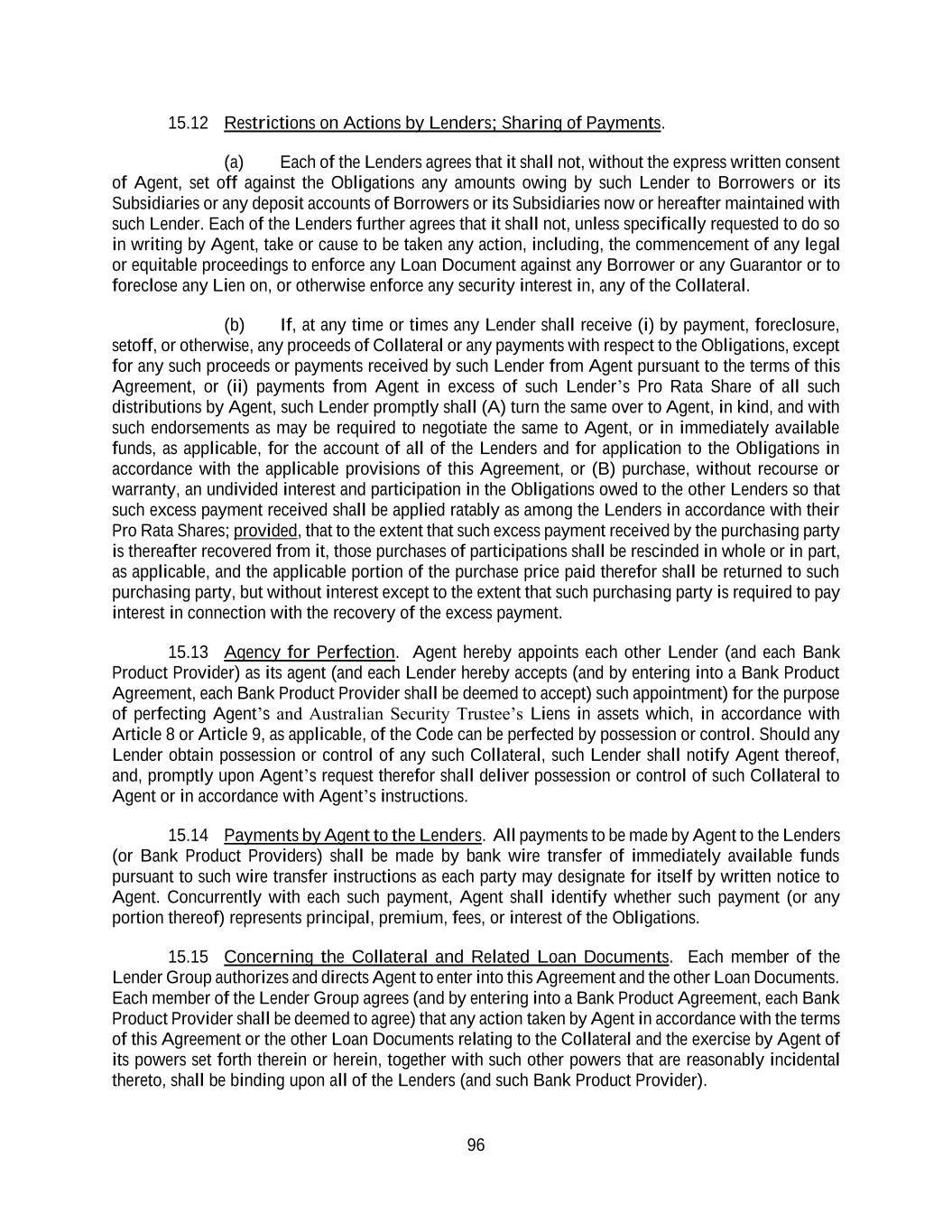 96 15.12 Restrictions on Actions by Lenders; Sharing of Payments. (a) Each of the Lenders agrees that it shall not, without the express written consent of Agent, set off against the Obligations any amounts owing by such Lender to Borrowers or its Subsidiaries or any deposit accounts of Borrowers or its Subsidiaries now or hereafter maintained with such Lender. Each of the Lenders further agrees that it shall not, unless specifically requested to do so in writing by Agent, take or cause to be taken any action, including, the commencement of any legal or equitable proceedings to enforce any Loan Document against any Borrower or any Guarantor or to foreclose any Lien on, or otherwise enforce any security interest in, any of the Collateral. (b) If, at any time or times any Lender shall receive (i) by payment, foreclosure, setoff, or otherwise, any proceeds of Collateral or any payments with respect to the Obligations, except for any such proceeds or payments received by such Lender from Agent pursuant to the terms of this Agreement, or (ii) payments from Agent in excess of such Lender’s Pro Rata Share of all such distributions by Agent, such Lender promptly shall (A) turn the same over to Agent, in kind, and with such endorsements as may be required to negotiate the same to Agent, or in immediately available funds, as applicable, for the account of all of the Lenders and for application to the Obligations in accordance with the applicable provisions of this Agreement, or (B) purchase, without recourse or warranty, an undivided interest and participation in the Obligations owed to the other Lenders so that such excess payment received shall be applied ratably as among the Lenders in accordance with their Pro Rata Shares; provided, that to the extent that such excess payment received by the purchasing party is thereafter recovered from it, those purchases of participations shall be rescinded in whole or in part, as applicable, and the applicable portion of the purchase price paid therefor shall be returned to such purchasing party, but without interest except to the extent that such purchasing party is required to pay interest in connection with the recovery of the excess payment. 15.13 Agency for Perfection. Agent hereby appoints each other Lender (and each Bank Product Provider) as its agent (and each Lender hereby accepts (and by entering into a Bank Product Agreement, each Bank Product Provider shall be deemed to accept) such appointment) for the purpose of perfecting Agent’s and Australian Security Trustee’s Liens in assets which, in accordance with Article 8 or Article 9, as applicable, of the Code can be perfected by possession or control. Should any Lender obtain possession or control of any such Collateral, such Lender shall notify Agent thereof, and, promptly upon Agent’s request therefor shall deliver possession or control of such Collateral to Agent or in accordance with Agent’s instructions. 15.14 Payments by Agent to the Lenders. All payments to be made by Agent to the Lenders (or Bank Product Providers) shall be made by bank wire transfer of immediately available funds pursuant to such wire transfer instructions as each party may designate for itself by written notice to Agent. Concurrently with each such payment, Agent shall identify whether such payment (or any portion thereof) represents principal, premium, fees, or interest of the Obligations. 15.15 Concerning the Collateral and Related Loan Documents. Each member of the Lender Group authorizes and directs Agent to enter into this Agreement and the other Loan Documents. Each member of the Lender Group agrees (and by entering into a Bank Product Agreement, each Bank Product Provider shall be deemed to agree) that any action taken by Agent in accordance with the terms of this Agreement or the other Loan Documents relating to the Collateral and the exercise by Agent of its powers set forth therein or herein, together with such other powers that are reasonably incidental thereto, shall be binding upon all of the Lenders (and such Bank Product Provider).