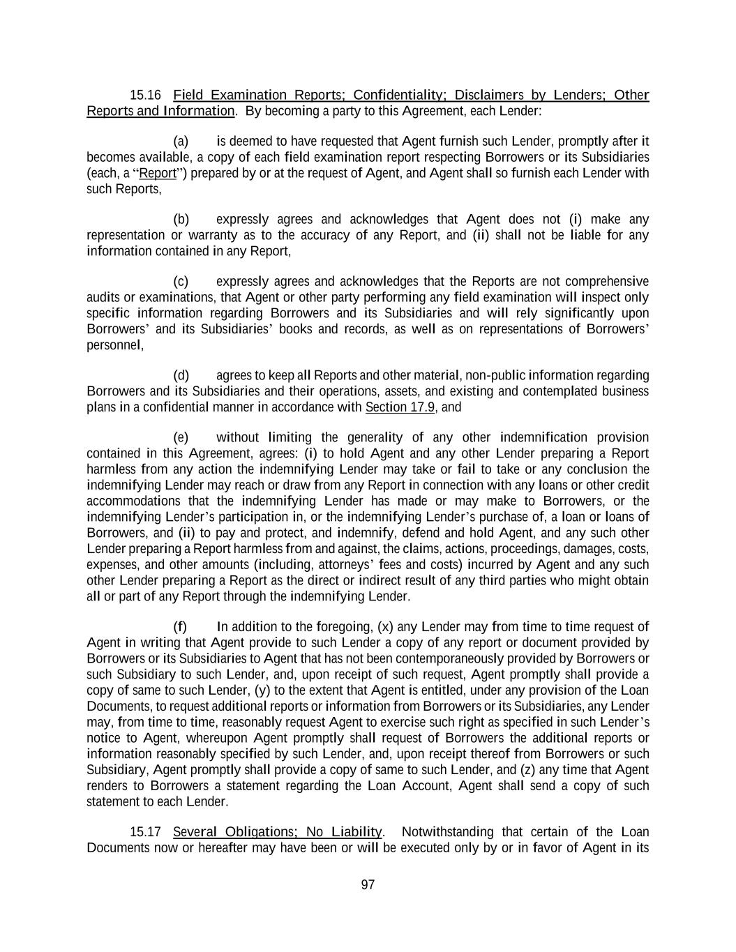 97 15.16 Field Examination Reports; Confidentiality; Disclaimers by Lenders; Other Reports and Information. By becoming a party to this Agreement, each Lender: (a) is deemed to have requested that Agent furnish such Lender, promptly after it becomes available, a copy of each field examination report respecting Borrowers or its Subsidiaries (each, a “Report”) prepared by or at the request of Agent, and Agent shall so furnish each Lender with such Reports, (b) expressly agrees and acknowledges that Agent does not (i) make any representation or warranty as to the accuracy of any Report, and (ii) shall not be liable for any information contained in any Report, (c) expressly agrees and acknowledges that the Reports are not comprehensive audits or examinations, that Agent or other party performing any field examination will inspect only specific information regarding Borrowers and its Subsidiaries and will rely significantly upon Borrowers’ and its Subsidiaries’ books and records, as well as on representations of Borrowers’ personnel, (d) agrees to keep all Reports and other material, non-public information regarding Borrowers and its Subsidiaries and their operations, assets, and existing and contemplated business plans in a confidential manner in accordance with Section 17.9, and (e) without limiting the generality of any other indemnification provision contained in this Agreement, agrees: (i) to hold Agent and any other Lender preparing a Report harmless from any action the indemnifying Lender may take or fail to take or any conclusion the indemnifying Lender may reach or draw from any Report in connection with any loans or other credit accommodations that the indemnifying Lender has made or may make to Borrowers, or the indemnifying Lender’s participation in, or the indemnifying Lender’s purchase of, a loan or loans of Borrowers, and (ii) to pay and protect, and indemnify, defend and hold Agent, and any such other Lender preparing a Report harmless from and against, the claims, actions, proceedings, damages, costs, expenses, and other amounts (including, attorneys’ fees and costs) incurred by Agent and any such other Lender preparing a Report as the direct or indirect result of any third parties who might obtain all or part of any Report through the indemnifying Lender. (f) In addition to the foregoing, (x) any Lender may from time to time request of Agent in writing that Agent provide to such Lender a copy of any report or document provided by Borrowers or its Subsidiaries to Agent that has not been contemporaneously provided by Borrowers or such Subsidiary to such Lender, and, upon receipt of such request, Agent promptly shall provide a copy of same to such Lender, (y) to the extent that Agent is entitled, under any provision of the Loan Documents, to request additional reports or information from Borrowers or its Subsidiaries, any Lender may, from time to time, reasonably request Agent to exercise such right as specified in such Lender’s notice to Agent, whereupon Agent promptly shall request of Borrowers the additional reports or information reasonably specified by such Lender, and, upon receipt thereof from Borrowers or such Subsidiary, Agent promptly shall provide a copy of same to such Lender, and (z) any time that Agent renders to Borrowers a statement regarding the Loan Account, Agent shall send a copy of such statement to each Lender. 15.17 Several Obligations; No Liability. Notwithstanding that certain of the Loan Documents now or hereafter may have been or will be executed only by or in favor of Agent in its