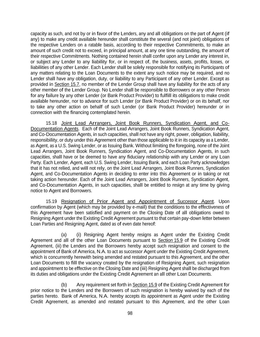 98 capacity as such, and not by or in favor of the Lenders, any and all obligations on the part of Agent (if any) to make any credit available hereunder shall constitute the several (and not joint) obligations of the respective Lenders on a ratable basis, according to their respective Commitments, to make an amount of such credit not to exceed, in principal amount, at any one time outstanding, the amount of their respective Commitments. Nothing contained herein shall confer upon any Lender any interest in, or subject any Lender to any liability for, or in respect of, the business, assets, profits, losses, or liabilities of any other Lender. Each Lender shall be solely responsible for notifying its Participants of any matters relating to the Loan Documents to the extent any such notice may be required, and no Lender shall have any obligation, duty, or liability to any Participant of any other Lender. Except as provided in Section 15.7, no member of the Lender Group shall have any liability for the acts of any other member of the Lender Group. No Lender shall be responsible to Borrowers or any other Person for any failure by any other Lender (or Bank Product Provider) to fulfill its obligations to make credit available hereunder, nor to advance for such Lender (or Bank Product Provider) or on its behalf, nor to take any other action on behalf of such Lender (or Bank Product Provider) hereunder or in connection with the financing contemplated herein. 15.18 Joint Lead Arrangers, Joint Book Runners, Syndication Agent, and Co- Documentation Agents. Each of the Joint Lead Arrangers, Joint Book Runners, Syndication Agent, and Co-Documentation Agents, in such capacities, shall not have any right, power, obligation, liability, responsibility, or duty under this Agreement other than those applicable to it in its capacity as a Lender, as Agent, as a U.S. Swing Lender, or as Issuing Bank. Without limiting the foregoing, none of the Joint Lead Arrangers, Joint Book Runners, Syndication Agent, and Co-Documentation Agents, in such capacities, shall have or be deemed to have any fiduciary relationship with any Lender or any Loan Party. Each Lender, Agent, each U.S. Swing Lender, Issuing Bank, and each Loan Party acknowledges that it has not relied, and will not rely, on the Joint Lead Arrangers, Joint Book Runners, Syndication Agent, and Co-Documentation Agents in deciding to enter into this Agreement or in taking or not taking action hereunder. Each of the Joint Lead Arrangers, Joint Book Runners, Syndication Agent, and Co-Documentation Agents, in such capacities, shall be entitled to resign at any time by giving notice to Agent and Borrowers. 15.19 Resignation of Prior Agent and Appointment of Successor Agent. Upon confirmation by Agent (which may be provided by e-mail) that the conditions to the effectiveness of this Agreement have been satisfied and payment on the Closing Date of all obligations owed to Resigning Agent under the Existing Credit Agreement pursuant to that certain pay-down letter between Loan Parties and Resigning Agent, dated as of even date hereof: (a) (i) Resigning Agent hereby resigns as Agent under the Existing Credit Agreement and all of the other Loan Documents pursuant to Section 15.9 of the Existing Credit Agreement, (ii) the Lenders and the Borrowers hereby accept such resignation and consent to the appointment of Bank of America, N.A. to act as successor Agent under the Existing Credit Agreement, which is concurrently herewith being amended and restated pursuant to this Agreement, and the other Loan Documents to fill the vacancy created by the resignation of Resigning Agent, such resignation and appointment to be effective on the Closing Date and (iii) Resigning Agent shall be discharged from its duties and obligations under the Existing Credit Agreement an all other Loan Documents. (b) Any requirement set forth in Section 15.9 of the Existing Credit Agreement for prior notice to the Lenders and the Borrowers of such resignation is hereby waived by each of the parties hereto. Bank of America, N.A. hereby accepts its appointment as Agent under the Existing Credit Agreement, as amended and restated pursuant to this Agreement, and the other Loan