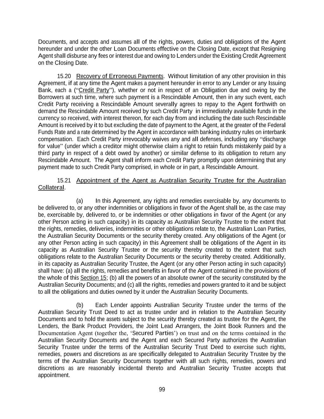 99 Documents, and accepts and assumes all of the rights, powers, duties and obligations of the Agent hereunder and under the other Loan Documents effective on the Closing Date, except that Resigning Agent shall disburse any fees or interest due and owing to Lenders under the Existing Credit Agreement on the Closing Date. 15.20 Recovery of Erroneous Payments. Without limitation of any other provision in this Agreement, if at any time the Agent makes a payment hereunder in error to any Lender or any Issuing Bank, each a (“Credit Party”), whether or not in respect of an Obligation due and owing by the Borrowers at such time, where such payment is a Rescindable Amount, then in any such event, each Credit Party receiving a Rescindable Amount severally agrees to repay to the Agent forthwith on demand the Rescindable Amount received by such Credit Party in immediately available funds in the currency so received, with interest thereon, for each day from and including the date such Rescindable Amount is received by it to but excluding the date of payment to the Agent, at the greater of the Federal Funds Rate and a rate determined by the Agent in accordance with banking industry rules on interbank compensation. Each Credit Party irrevocably waives any and all defenses, including any “discharge for value” (under which a creditor might otherwise claim a right to retain funds mistakenly paid by a third party in respect of a debt owed by another) or similar defense to its obligation to return any Rescindable Amount. The Agent shall inform each Credit Party promptly upon determining that any payment made to such Credit Party comprised, in whole or in part, a Rescindable Amount. 15.21 Appointment of the Agent as Australian Security Trustee for the Australian Collateral. (a) In this Agreement, any rights and remedies exercisable by, any documents to be delivered to, or any other indemnities or obligations in favor of the Agent shall be, as the case may be, exercisable by, delivered to, or be indemnities or other obligations in favor of the Agent (or any other Person acting in such capacity) in its capacity as Australian Security Trustee to the extent that the rights, remedies, deliveries, indemnities or other obligations relate to, the Australian Loan Parties, the Australian Security Documents or the security thereby created. Any obligations of the Agent (or any other Person acting in such capacity) in this Agreement shall be obligations of the Agent in its capacity as Australian Security Trustee or the security thereby created to the extent that such obligations relate to the Australian Security Documents or the security thereby created. Additionally, in its capacity as Australian Security Trustee, the Agent (or any other Person acting in such capacity) shall have: (a) all the rights, remedies and benefits in favor of the Agent contained in the provisions of the whole of this Section 15; (b) all the powers of an absolute owner of the security constituted by the Australian Security Documents; and (c) all the rights, remedies and powers granted to it and be subject to all the obligations and duties owned by it under the Australian Security Documents. (b) Each Lender appoints Australian Security Trustee under the terms of the Australian Security Trust Deed to act as trustee under and in relation to the Australian Security Documents and to hold the assets subject to the security thereby created as trustee for the Agent, the Lenders, the Bank Product Providers, the Joint Lead Arrangers, the Joint Book Runners and the Documentation Agent (together the, ‘Secured Parties’) on trust and on the terms contained in the Australian Security Documents and the Agent and each Secured Party authorizes the Australian Security Trustee under the terms of the Australian Security Trust Deed to exercise such rights, remedies, powers and discretions as are specifically delegated to Australian Security Trustee by the terms of the Australian Security Documents together with all such rights, remedies, powers and discretions as are reasonably incidental thereto and Australian Security Trustee accepts that appointment.