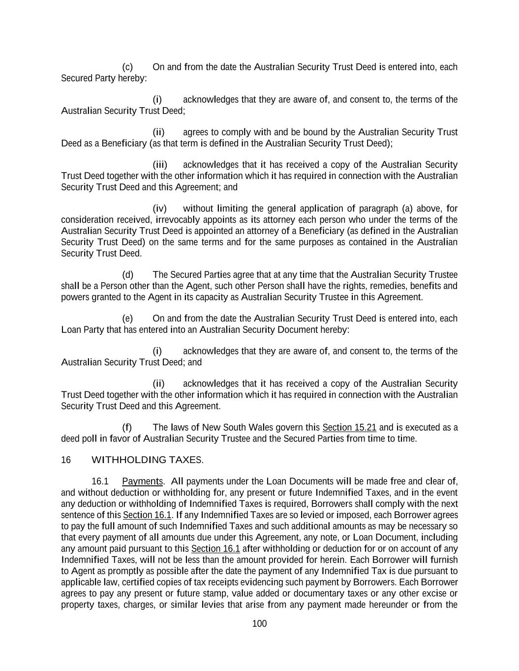 100 (c) On and from the date the Australian Security Trust Deed is entered into, each Secured Party hereby: (i) acknowledges that they are aware of, and consent to, the terms of the Australian Security Trust Deed; (ii) agrees to comply with and be bound by the Australian Security Trust Deed as a Beneficiary (as that term is defined in the Australian Security Trust Deed); (iii) acknowledges that it has received a copy of the Australian Security Trust Deed together with the other information which it has required in connection with the Australian Security Trust Deed and this Agreement; and (iv) without limiting the general application of paragraph (a) above, for consideration received, irrevocably appoints as its attorney each person who under the terms of the Australian Security Trust Deed is appointed an attorney of a Beneficiary (as defined in the Australian Security Trust Deed) on the same terms and for the same purposes as contained in the Australian Security Trust Deed. (d) The Secured Parties agree that at any time that the Australian Security Trustee shall be a Person other than the Agent, such other Person shall have the rights, remedies, benefits and powers granted to the Agent in its capacity as Australian Security Trustee in this Agreement. (e) On and from the date the Australian Security Trust Deed is entered into, each Loan Party that has entered into an Australian Security Document hereby: (i) acknowledges that they are aware of, and consent to, the terms of the Australian Security Trust Deed; and (ii) acknowledges that it has received a copy of the Australian Security Trust Deed together with the other information which it has required in connection with the Australian Security Trust Deed and this Agreement. (f) The laws of New South Wales govern this Section 15.21 and is executed as a deed poll in favor of Australian Security Trustee and the Secured Parties from time to time. 16 WITHHOLDING TAXES. 16.1 Payments. All payments under the Loan Documents will be made free and clear of, and without deduction or withholding for, any present or future Indemnified Taxes, and in the event any deduction or withholding of Indemnified Taxes is required, Borrowers shall comply with the next sentence of this Section 16.1. If any Indemnified Taxes are so levied or imposed, each Borrower agrees to pay the full amount of such Indemnified Taxes and such additional amounts as may be necessary so that every payment of all amounts due under this Agreement, any note, or Loan Document, including any amount paid pursuant to this Section 16.1 after withholding or deduction for or on account of any Indemnified Taxes, will not be less than the amount provided for herein. Each Borrower will furnish to Agent as promptly as possible after the date the payment of any Indemnified Tax is due pursuant to applicable law, certified copies of tax receipts evidencing such payment by Borrowers. Each Borrower agrees to pay any present or future stamp, value added or documentary taxes or any other excise or property taxes, charges, or similar levies that arise from any payment made hereunder or from the