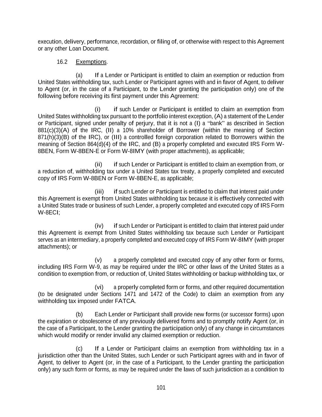 101 execution, delivery, performance, recordation, or filing of, or otherwise with respect to this Agreement or any other Loan Document. 16.2 Exemptions. (a) If a Lender or Participant is entitled to claim an exemption or reduction from United States withholding tax, such Lender or Participant agrees with and in favor of Agent, to deliver to Agent (or, in the case of a Participant, to the Lender granting the participation only) one of the following before receiving its first payment under this Agreement: (i) if such Lender or Participant is entitled to claim an exemption from United States withholding tax pursuant to the portfolio interest exception, (A) a statement of the Lender or Participant, signed under penalty of perjury, that it is not a (I) a “bank” as described in Section 881(c)(3)(A) of the IRC, (II) a 10% shareholder of Borrower (within the meaning of Section 871(h)(3)(B) of the IRC), or (III) a controlled foreign corporation related to Borrowers within the meaning of Section 864(d)(4) of the IRC, and (B) a properly completed and executed IRS Form W- 8BEN, Form W-8BEN-E or Form W-8IMY (with proper attachments), as applicable; (ii) if such Lender or Participant is entitled to claim an exemption from, or a reduction of, withholding tax under a United States tax treaty, a properly completed and executed copy of IRS Form W-8BEN or Form W-8BEN-E, as applicable; (iii) if such Lender or Participant is entitled to claim that interest paid under this Agreement is exempt from United States withholding tax because it is effectively connected with a United States trade or business of such Lender, a properly completed and executed copy of IRS Form W-8ECI; (iv) if such Lender or Participant is entitled to claim that interest paid under this Agreement is exempt from United States withholding tax because such Lender or Participant serves as an intermediary, a properly completed and executed copy of IRS Form W-8IMY (with proper attachments); or (v) a properly completed and executed copy of any other form or forms, including IRS Form W-9, as may be required under the IRC or other laws of the United States as a condition to exemption from, or reduction of, United States withholding or backup withholding tax, or (vi) a properly completed form or forms, and other required documentation (to be designated under Sections 1471 and 1472 of the Code) to claim an exemption from any withholding tax imposed under FATCA. (b) Each Lender or Participant shall provide new forms (or successor forms) upon the expiration or obsolescence of any previously delivered forms and to promptly notify Agent (or, in the case of a Participant, to the Lender granting the participation only) of any change in circumstances which would modify or render invalid any claimed exemption or reduction. (c) If a Lender or Participant claims an exemption from withholding tax in a jurisdiction other than the United States, such Lender or such Participant agrees with and in favor of Agent, to deliver to Agent (or, in the case of a Participant, to the Lender granting the participation only) any such form or forms, as may be required under the laws of such jurisdiction as a condition to