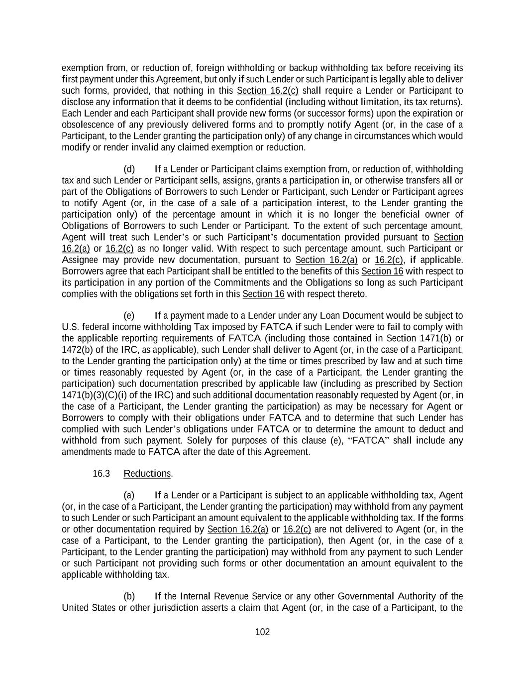 102 exemption from, or reduction of, foreign withholding or backup withholding tax before receiving its first payment under this Agreement, but only if such Lender or such Participant is legally able to deliver such forms, provided, that nothing in this Section 16.2(c) shall require a Lender or Participant to disclose any information that it deems to be confidential (including without limitation, its tax returns). Each Lender and each Participant shall provide new forms (or successor forms) upon the expiration or obsolescence of any previously delivered forms and to promptly notify Agent (or, in the case of a Participant, to the Lender granting the participation only) of any change in circumstances which would modify or render invalid any claimed exemption or reduction. (d) If a Lender or Participant claims exemption from, or reduction of, withholding tax and such Lender or Participant sells, assigns, grants a participation in, or otherwise transfers all or part of the Obligations of Borrowers to such Lender or Participant, such Lender or Participant agrees to notify Agent (or, in the case of a sale of a participation interest, to the Lender granting the participation only) of the percentage amount in which it is no longer the beneficial owner of Obligations of Borrowers to such Lender or Participant. To the extent of such percentage amount, Agent will treat such Lender’s or such Participant’s documentation provided pursuant to Section 16.2(a) or 16.2(c) as no longer valid. With respect to such percentage amount, such Participant or Assignee may provide new documentation, pursuant to Section 16.2(a) or 16.2(c), if applicable. Borrowers agree that each Participant shall be entitled to the benefits of this Section 16 with respect to its participation in any portion of the Commitments and the Obligations so long as such Participant complies with the obligations set forth in this Section 16 with respect thereto. (e) If a payment made to a Lender under any Loan Document would be subject to U.S. federal income withholding Tax imposed by FATCA if such Lender were to fail to comply with the applicable reporting requirements of FATCA (including those contained in Section 1471(b) or 1472(b) of the IRC, as applicable), such Lender shall deliver to Agent (or, in the case of a Participant, to the Lender granting the participation only) at the time or times prescribed by law and at such time or times reasonably requested by Agent (or, in the case of a Participant, the Lender granting the participation) such documentation prescribed by applicable law (including as prescribed by Section 1471(b)(3)(C)(i) of the IRC) and such additional documentation reasonably requested by Agent (or, in the case of a Participant, the Lender granting the participation) as may be necessary for Agent or Borrowers to comply with their obligations under FATCA and to determine that such Lender has complied with such Lender’s obligations under FATCA or to determine the amount to deduct and withhold from such payment. Solely for purposes of this clause (e), “FATCA” shall include any amendments made to FATCA after the date of this Agreement. 16.3 Reductions. (a) If a Lender or a Participant is subject to an applicable withholding tax, Agent (or, in the case of a Participant, the Lender granting the participation) may withhold from any payment to such Lender or such Participant an amount equivalent to the applicable withholding tax. If the forms or other documentation required by Section 16.2(a) or 16.2(c) are not delivered to Agent (or, in the case of a Participant, to the Lender granting the participation), then Agent (or, in the case of a Participant, to the Lender granting the participation) may withhold from any payment to such Lender or such Participant not providing such forms or other documentation an amount equivalent to the applicable withholding tax. (b) If the Internal Revenue Service or any other Governmental Authority of the United States or other jurisdiction asserts a claim that Agent (or, in the case of a Participant, to the