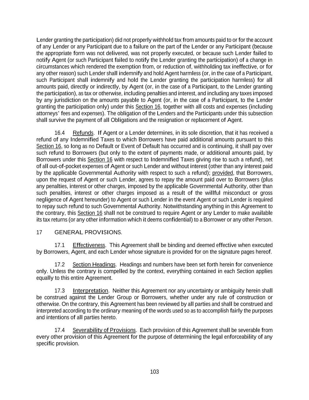103 Lender granting the participation) did not properly withhold tax from amounts paid to or for the account of any Lender or any Participant due to a failure on the part of the Lender or any Participant (because the appropriate form was not delivered, was not properly executed, or because such Lender failed to notify Agent (or such Participant failed to notify the Lender granting the participation) of a change in circumstances which rendered the exemption from, or reduction of, withholding tax ineffective, or for any other reason) such Lender shall indemnify and hold Agent harmless (or, in the case of a Participant, such Participant shall indemnify and hold the Lender granting the participation harmless) for all amounts paid, directly or indirectly, by Agent (or, in the case of a Participant, to the Lender granting the participation), as tax or otherwise, including penalties and interest, and including any taxes imposed by any jurisdiction on the amounts payable to Agent (or, in the case of a Participant, to the Lender granting the participation only) under this Section 16, together with all costs and expenses (including attorneys’ fees and expenses). The obligation of the Lenders and the Participants under this subsection shall survive the payment of all Obligations and the resignation or replacement of Agent. 16.4 Refunds. If Agent or a Lender determines, in its sole discretion, that it has received a refund of any Indemnified Taxes to which Borrowers have paid additional amounts pursuant to this Section 16, so long as no Default or Event of Default has occurred and is continuing, it shall pay over such refund to Borrowers (but only to the extent of payments made, or additional amounts paid, by Borrowers under this Section 16 with respect to Indemnified Taxes giving rise to such a refund), net of all out-of-pocket expenses of Agent or such Lender and without interest (other than any interest paid by the applicable Governmental Authority with respect to such a refund); provided, that Borrowers, upon the request of Agent or such Lender, agrees to repay the amount paid over to Borrowers (plus any penalties, interest or other charges, imposed by the applicable Governmental Authority, other than such penalties, interest or other charges imposed as a result of the willful misconduct or gross negligence of Agent hereunder) to Agent or such Lender in the event Agent or such Lender is required to repay such refund to such Governmental Authority. Notwithstanding anything in this Agreement to the contrary, this Section 16 shall not be construed to require Agent or any Lender to make available its tax returns (or any other information which it deems confidential) to a Borrower or any other Person. 17 GENERAL PROVISIONS. 17.1 Effectiveness. This Agreement shall be binding and deemed effective when executed by Borrowers, Agent, and each Lender whose signature is provided for on the signature pages hereof. 17.2 Section Headings. Headings and numbers have been set forth herein for convenience only. Unless the contrary is compelled by the context, everything contained in each Section applies equally to this entire Agreement. 17.3 Interpretation. Neither this Agreement nor any uncertainty or ambiguity herein shall be construed against the Lender Group or Borrowers, whether under any rule of construction or otherwise. On the contrary, this Agreement has been reviewed by all parties and shall be construed and interpreted according to the ordinary meaning of the words used so as to accomplish fairly the purposes and intentions of all parties hereto. 17.4 Severability of Provisions. Each provision of this Agreement shall be severable from every other provision of this Agreement for the purpose of determining the legal enforceability of any specific provision.